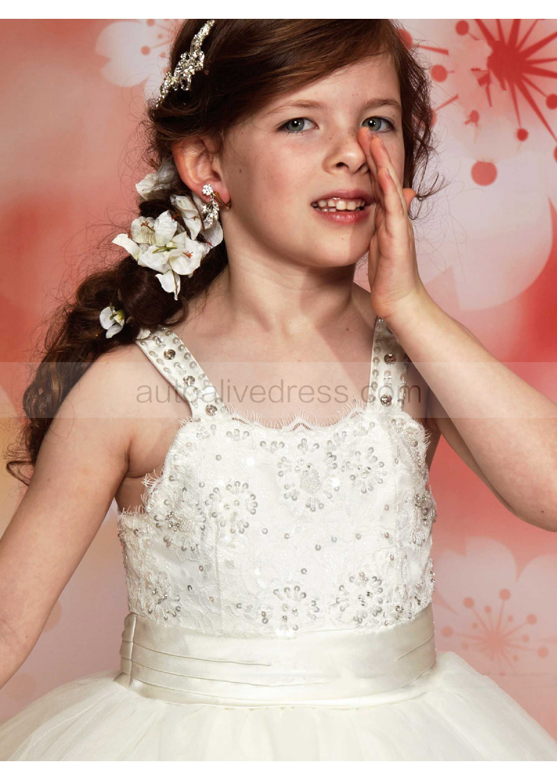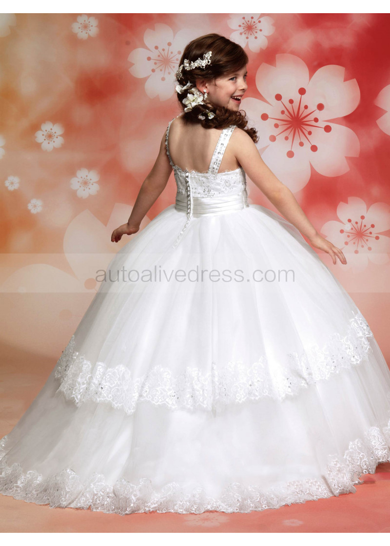 Wide Straps Beaded Lace Tulle Tiered Flower Girl Dress