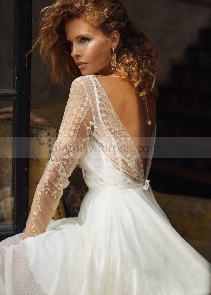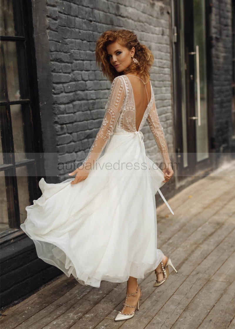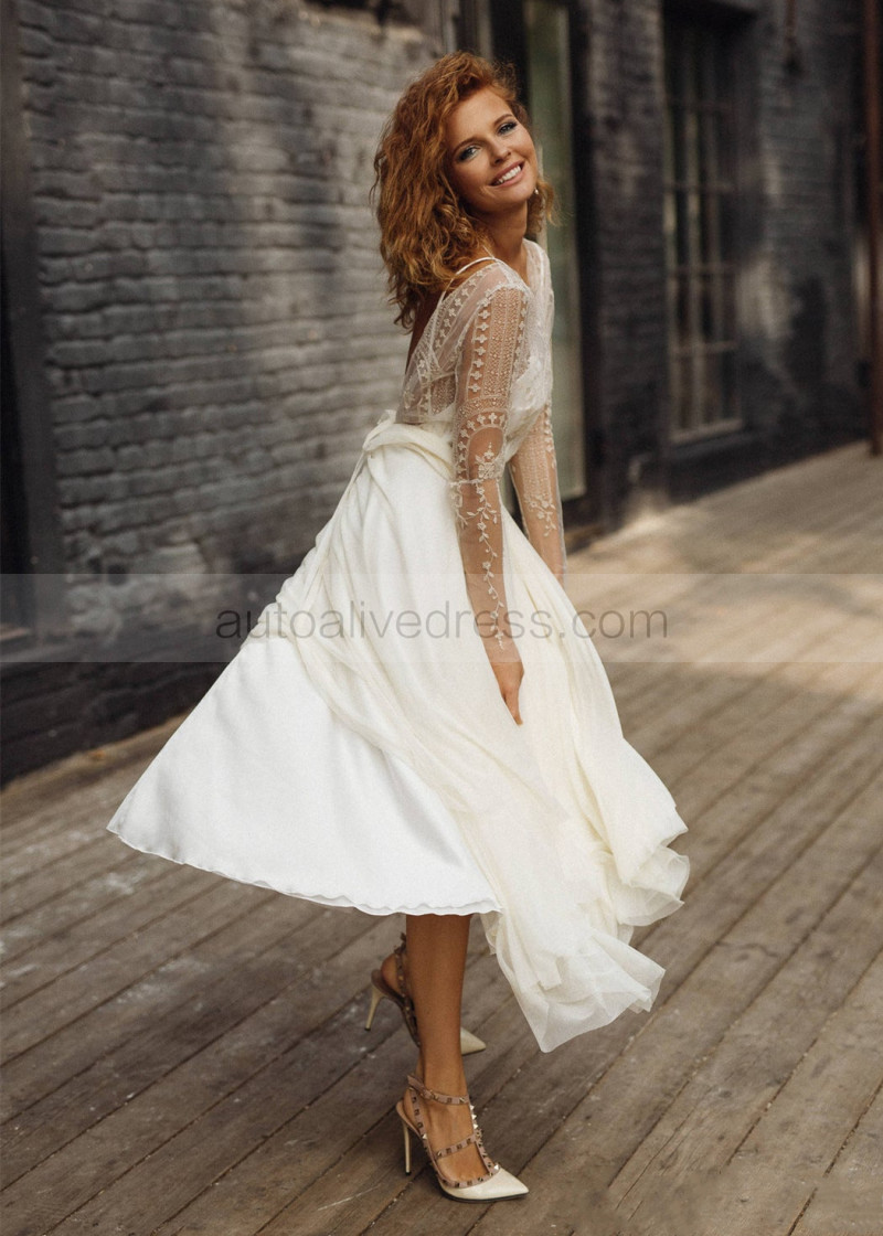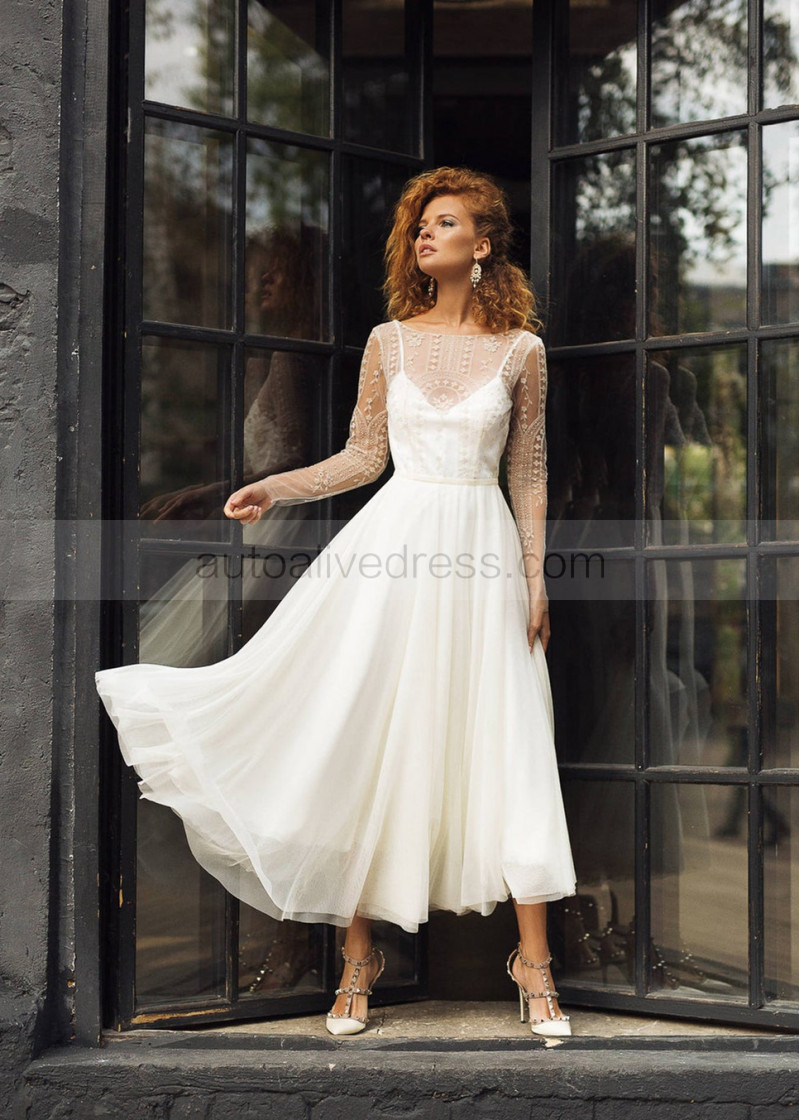 Gold Lace Ivory Tulle Tea Length Wedding Dress