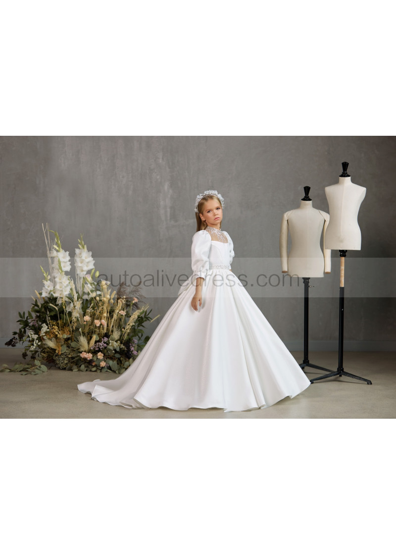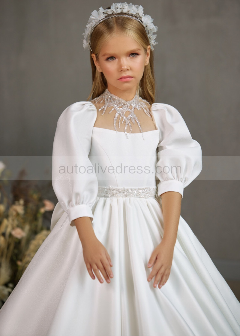 High Neck Beaded Ivory Lace Satin Flower Girl Dress