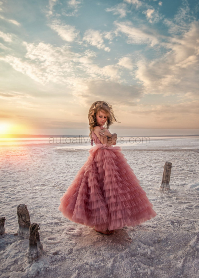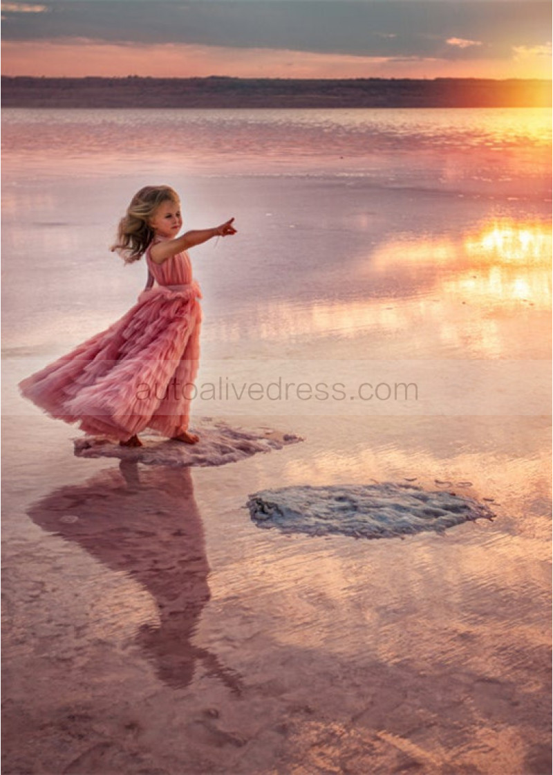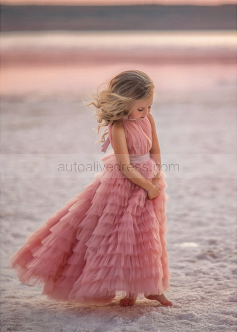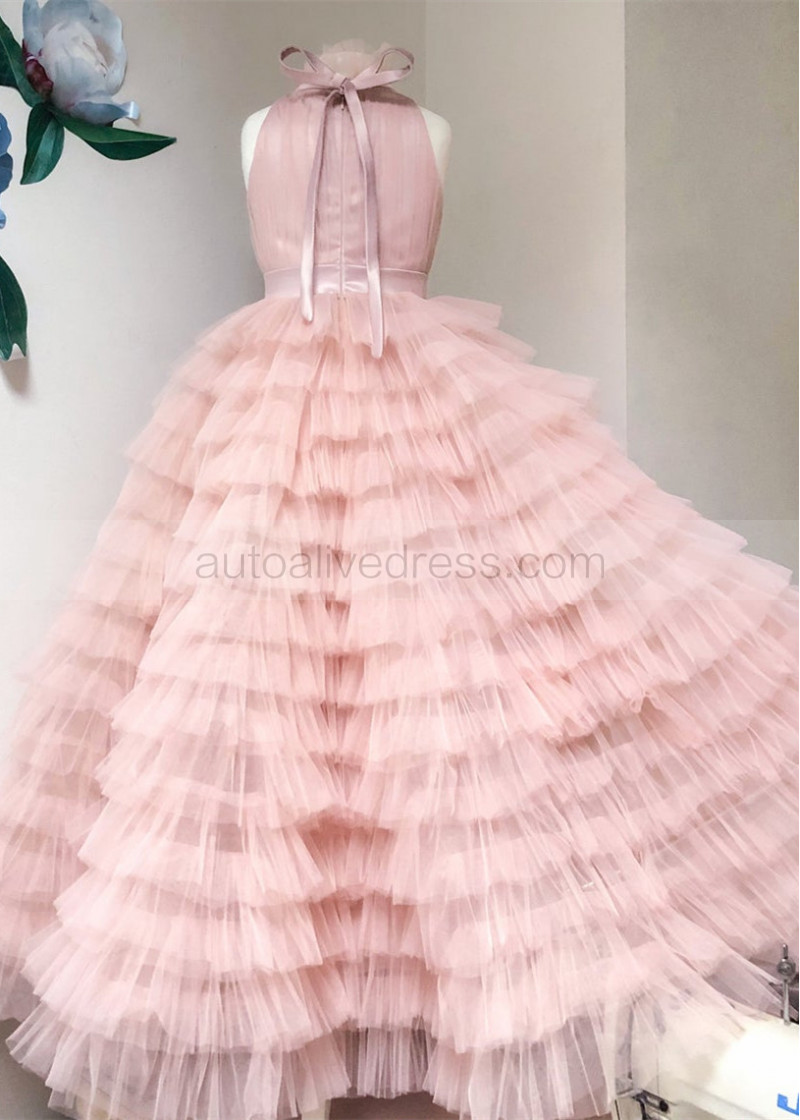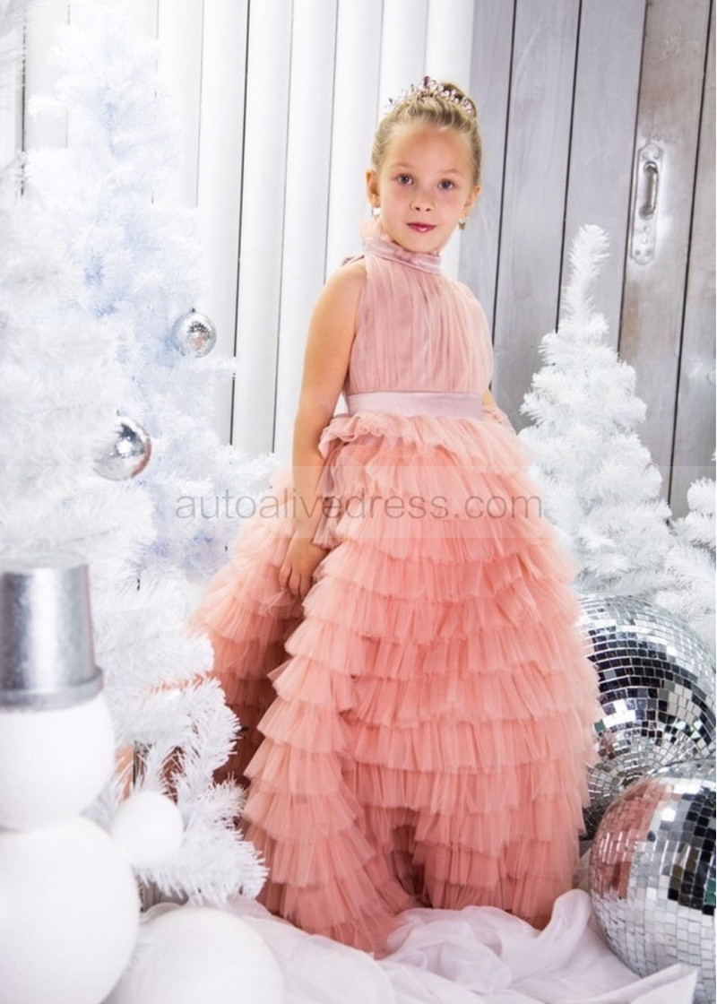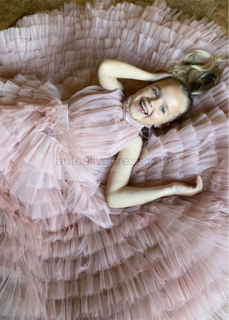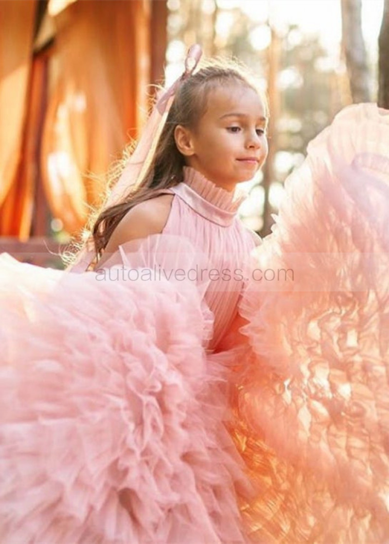 High Neck Light Pink Ruffled Tulle Flower Girl Dress