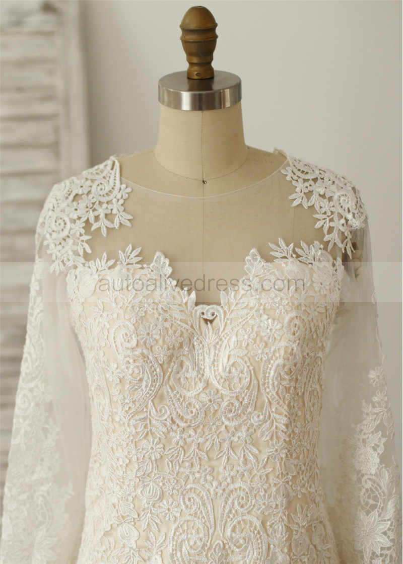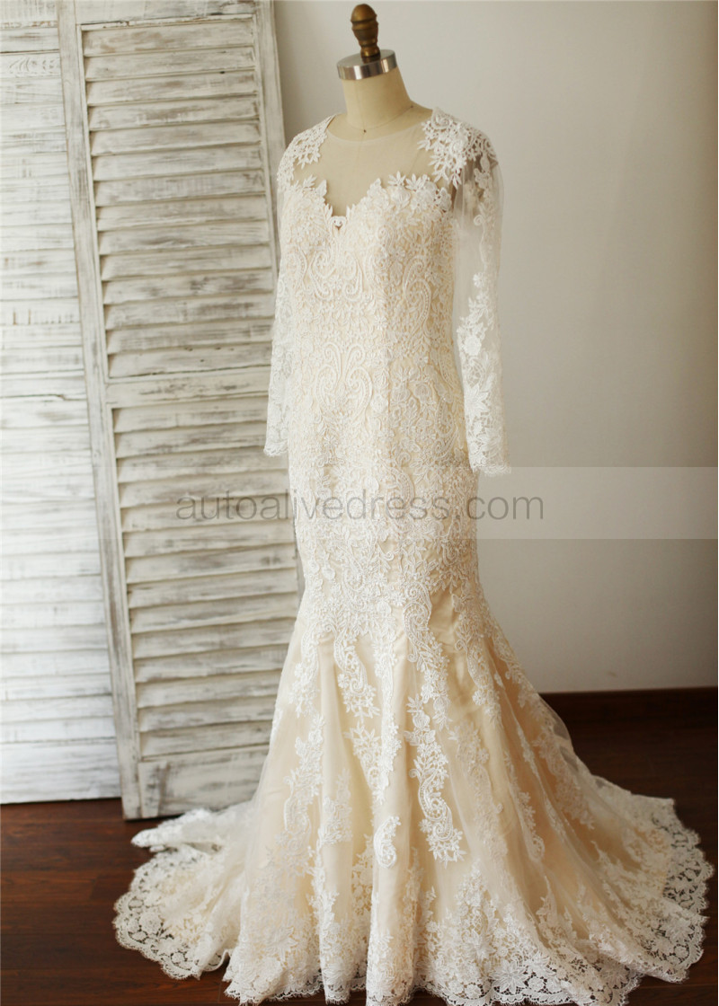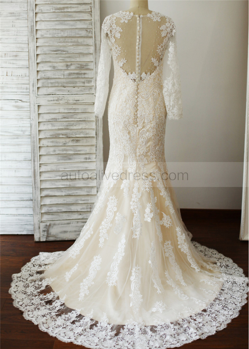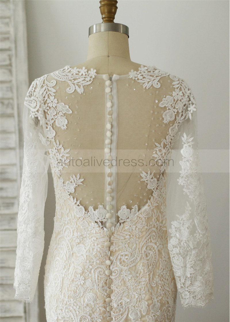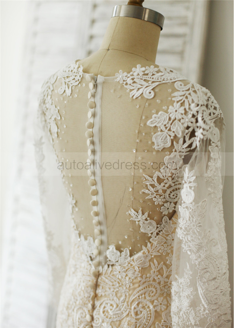Long Sleeves Ivory Lace Beaded Wedding Dress With Champagne Lining