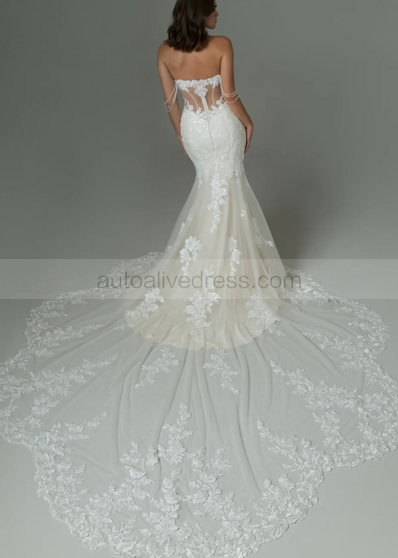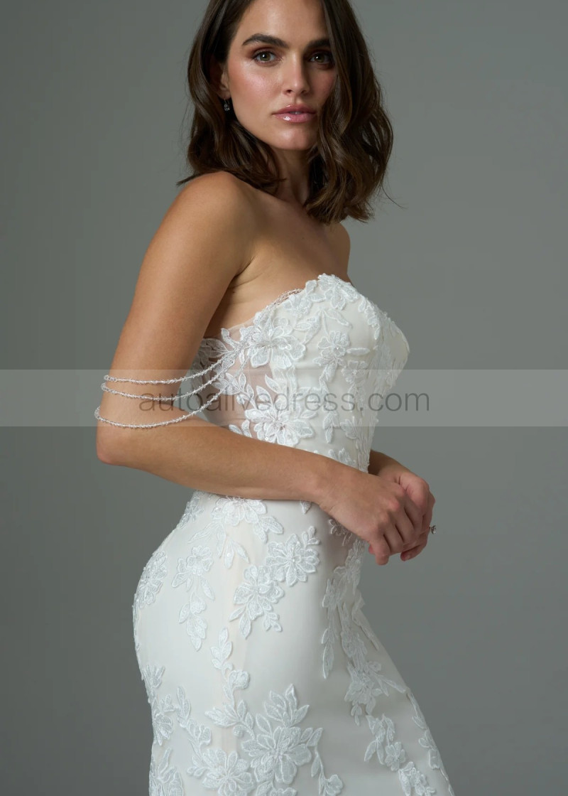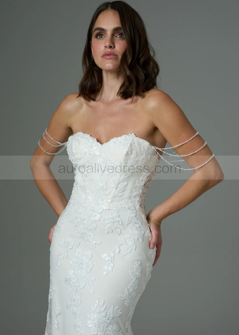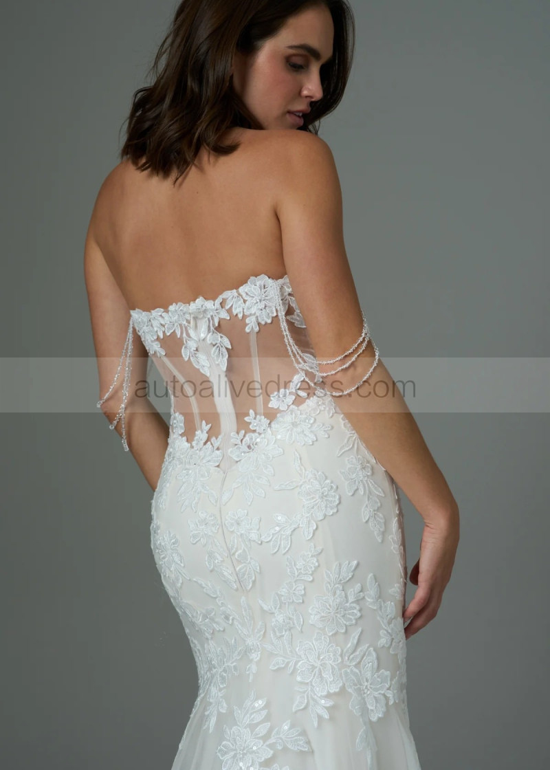 Ivory Embroidered Lace Tulle Wedding Dress With Detachable Crystal Straps