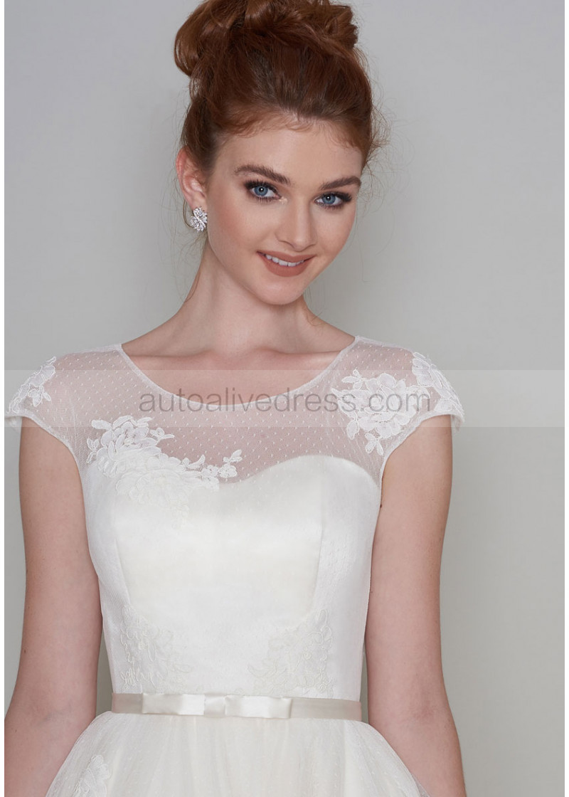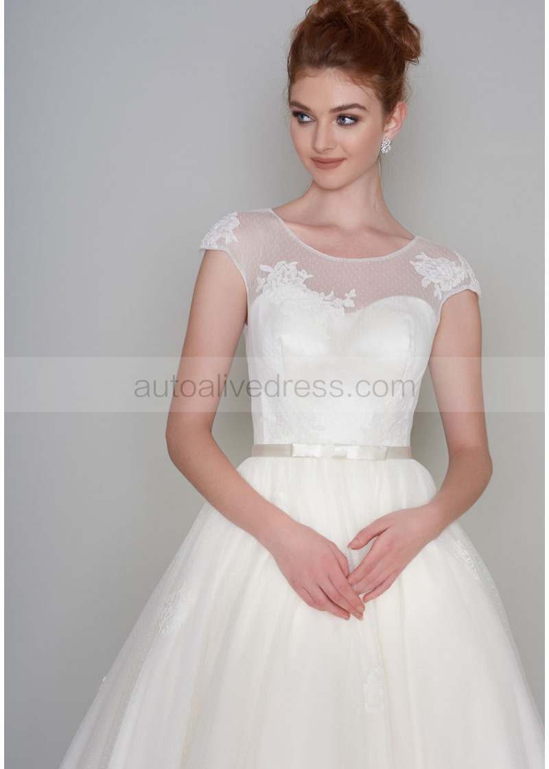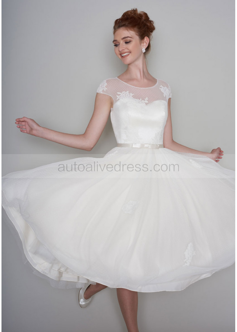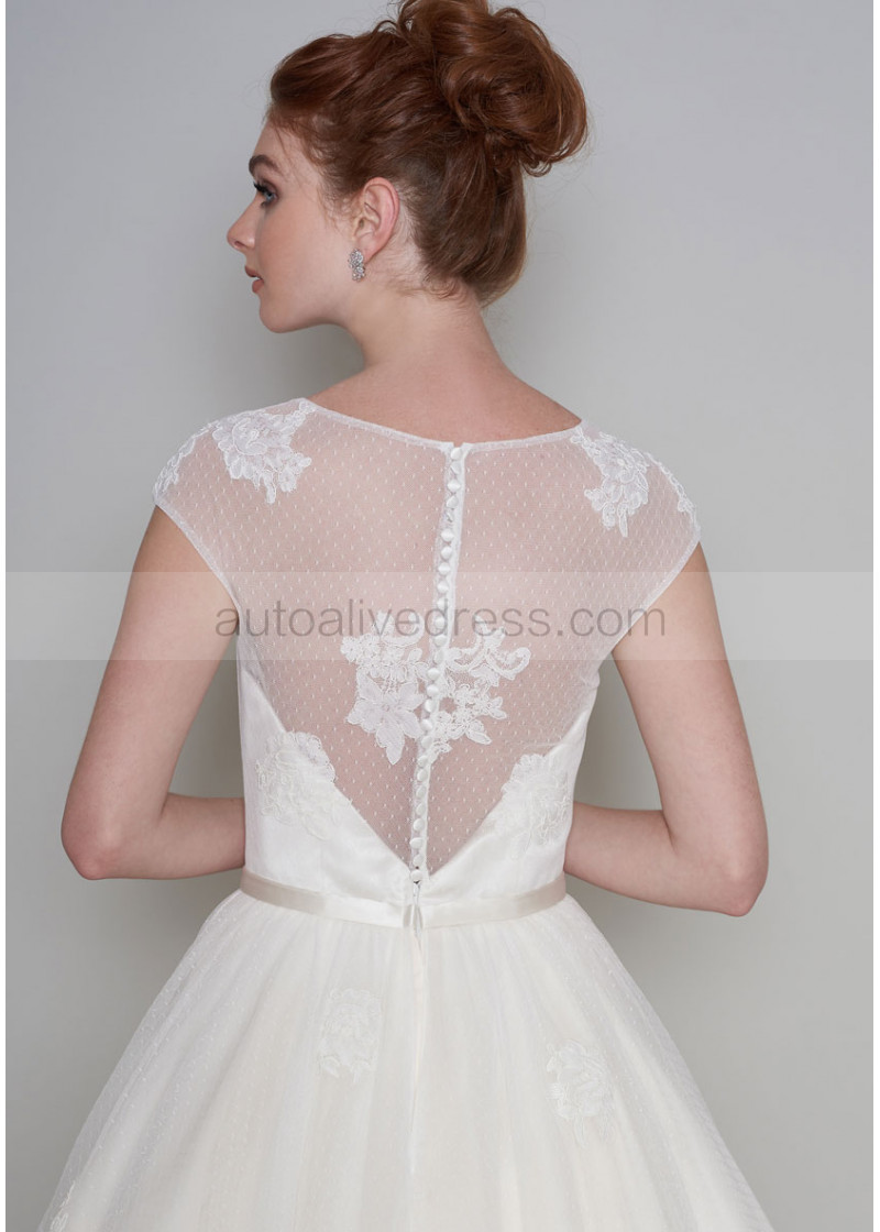 Ivory Lace Swiss Dot Tulle Full Skirt Tea Length Wedding Dress