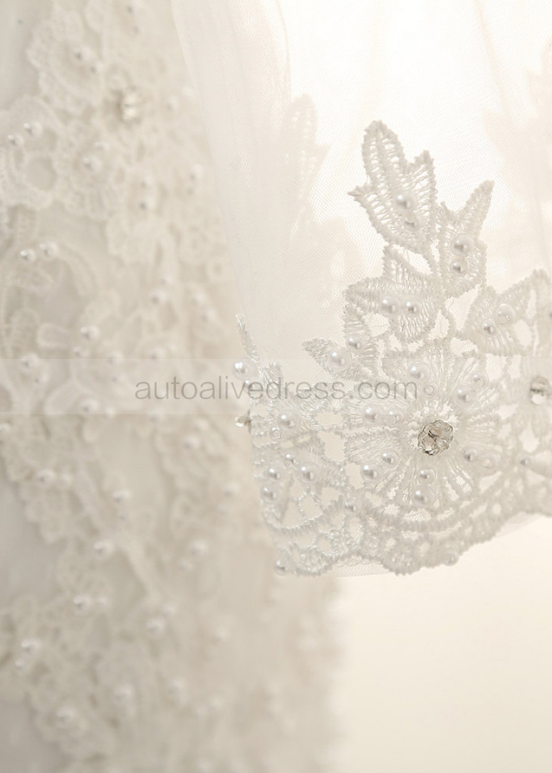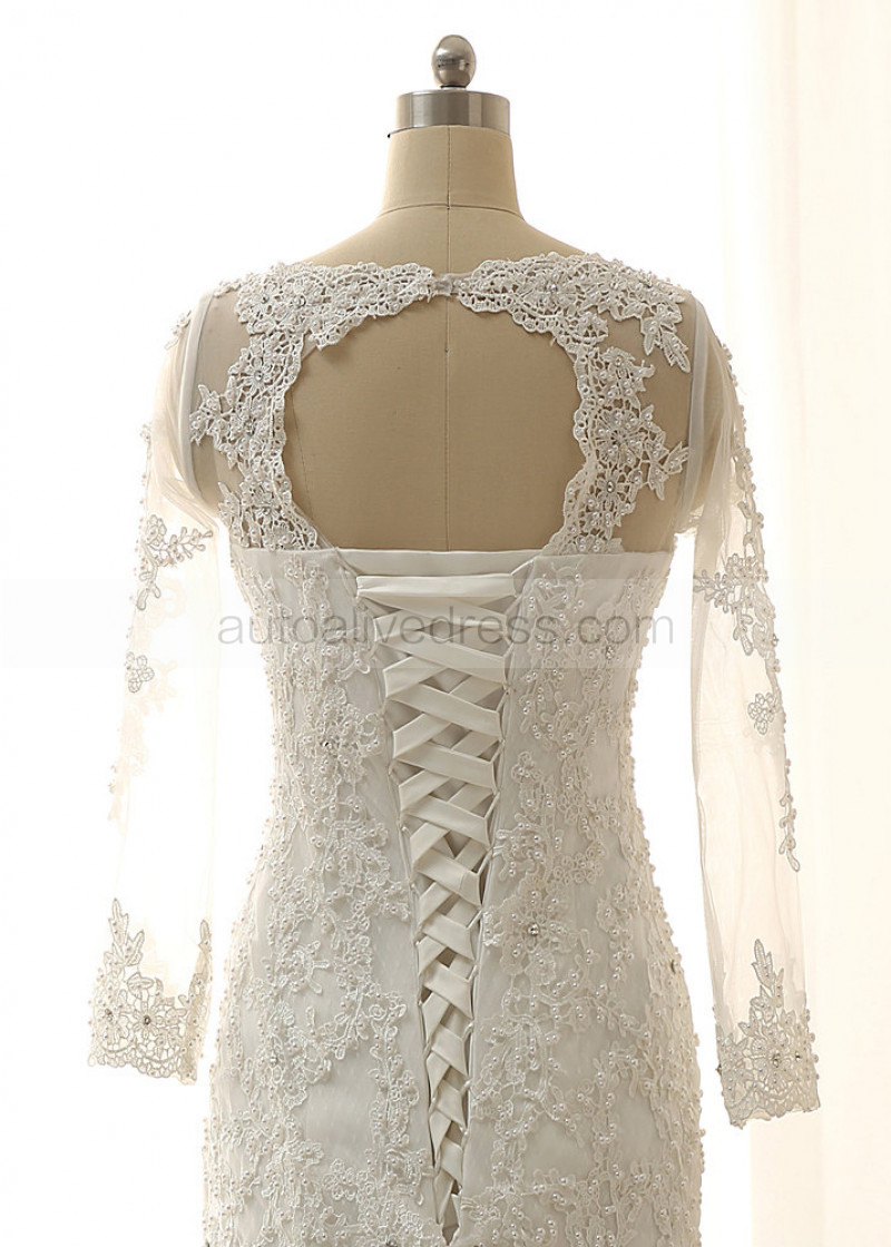 Ivory Lace Tulle Long Sleeves Keyhole Back Mermaid Wedding Dress