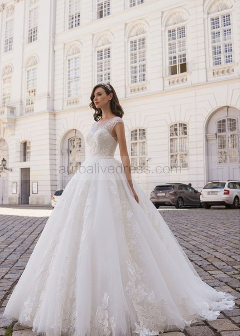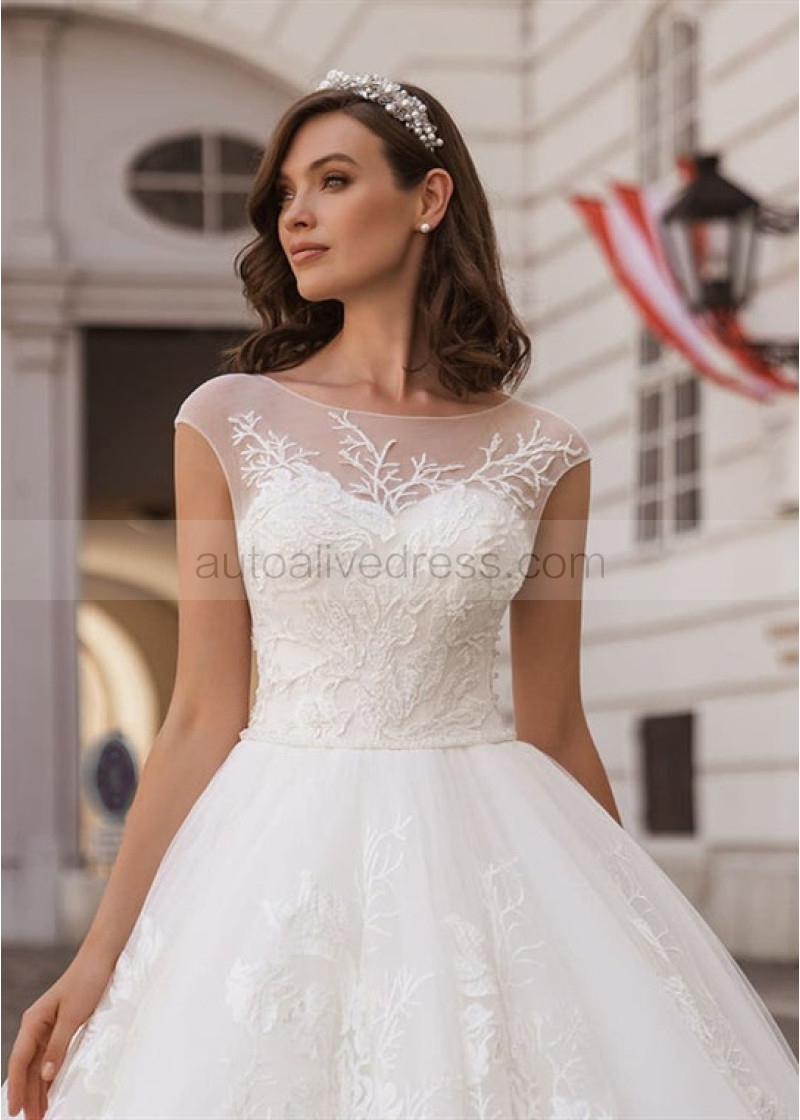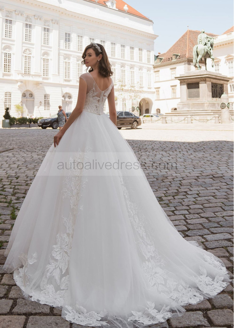 Ivory Lace Tulle V Back Floral Wedding Dress