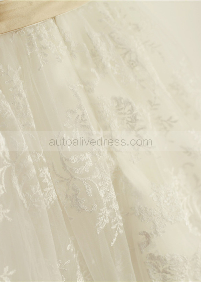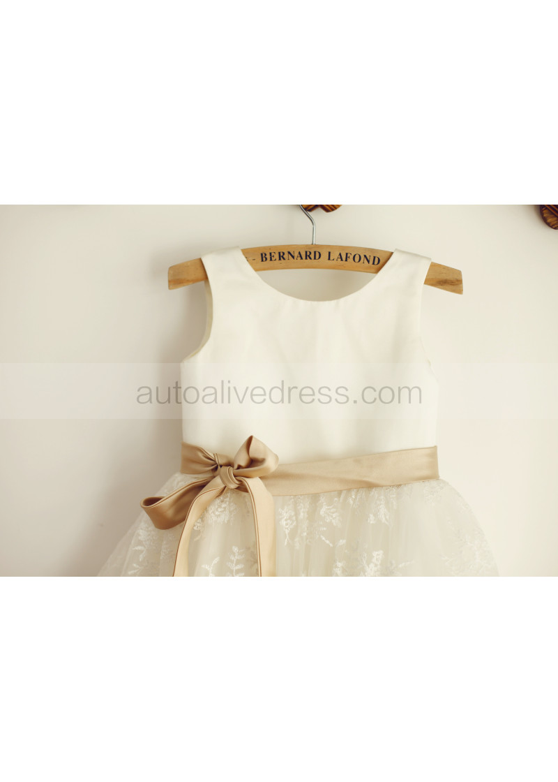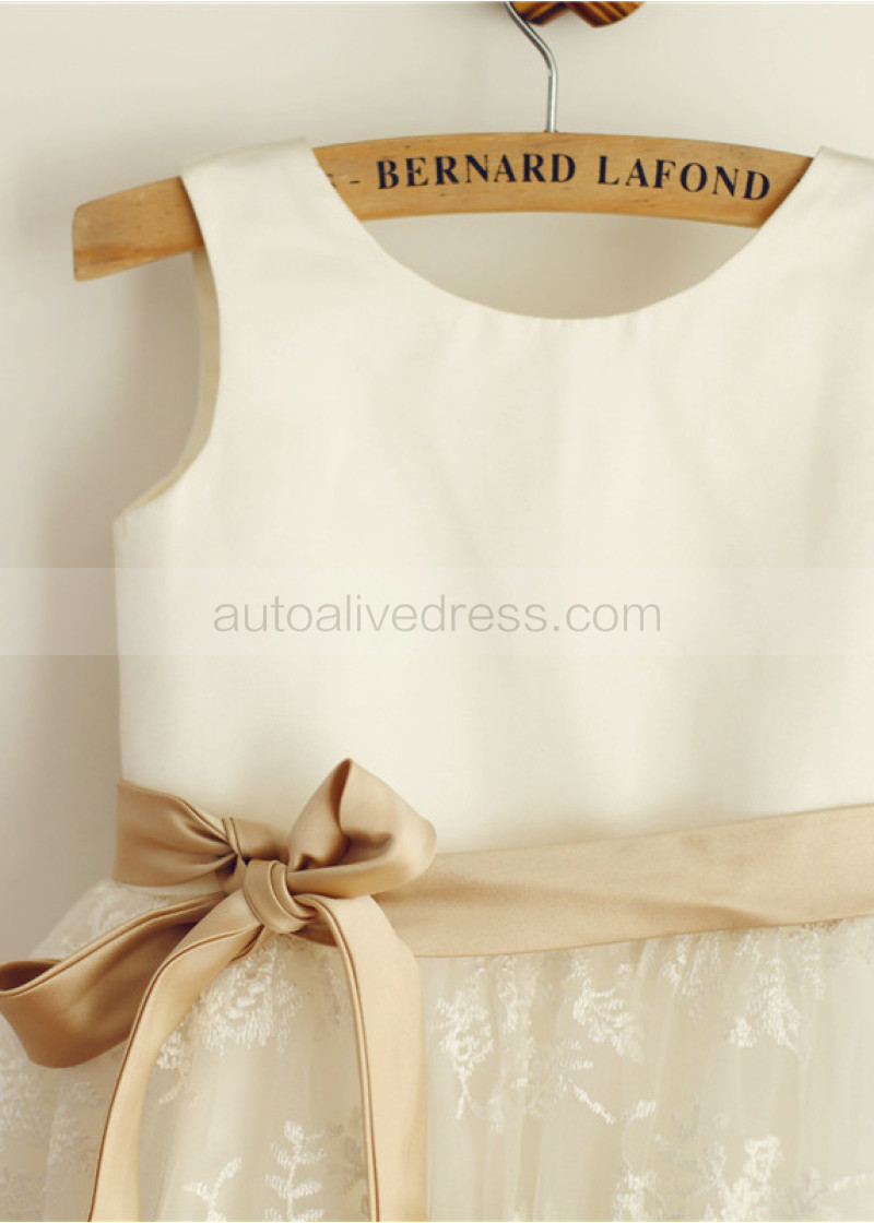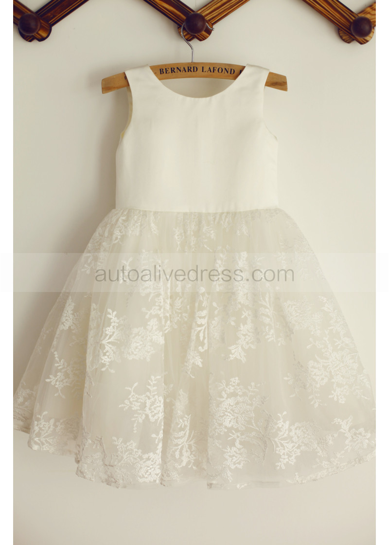 Ivory Satin Lace Knee Length Flower Girl Dress