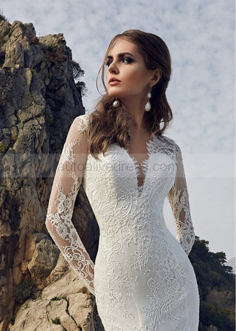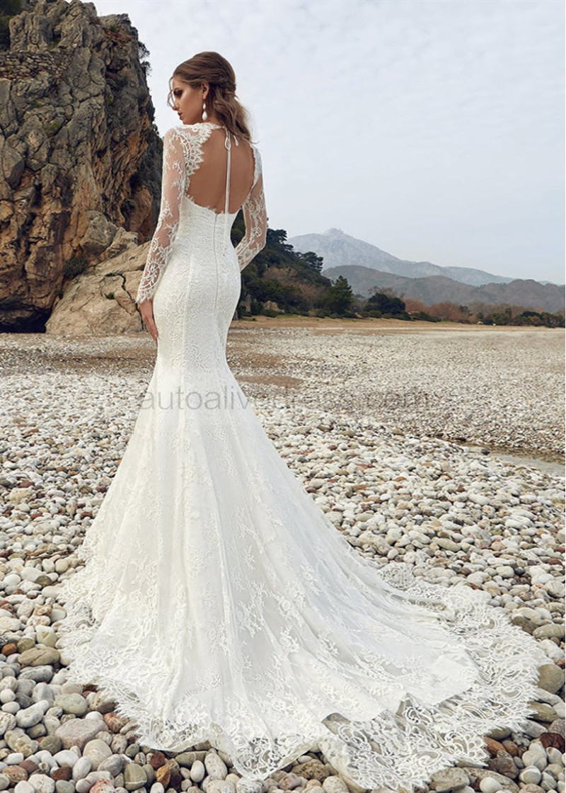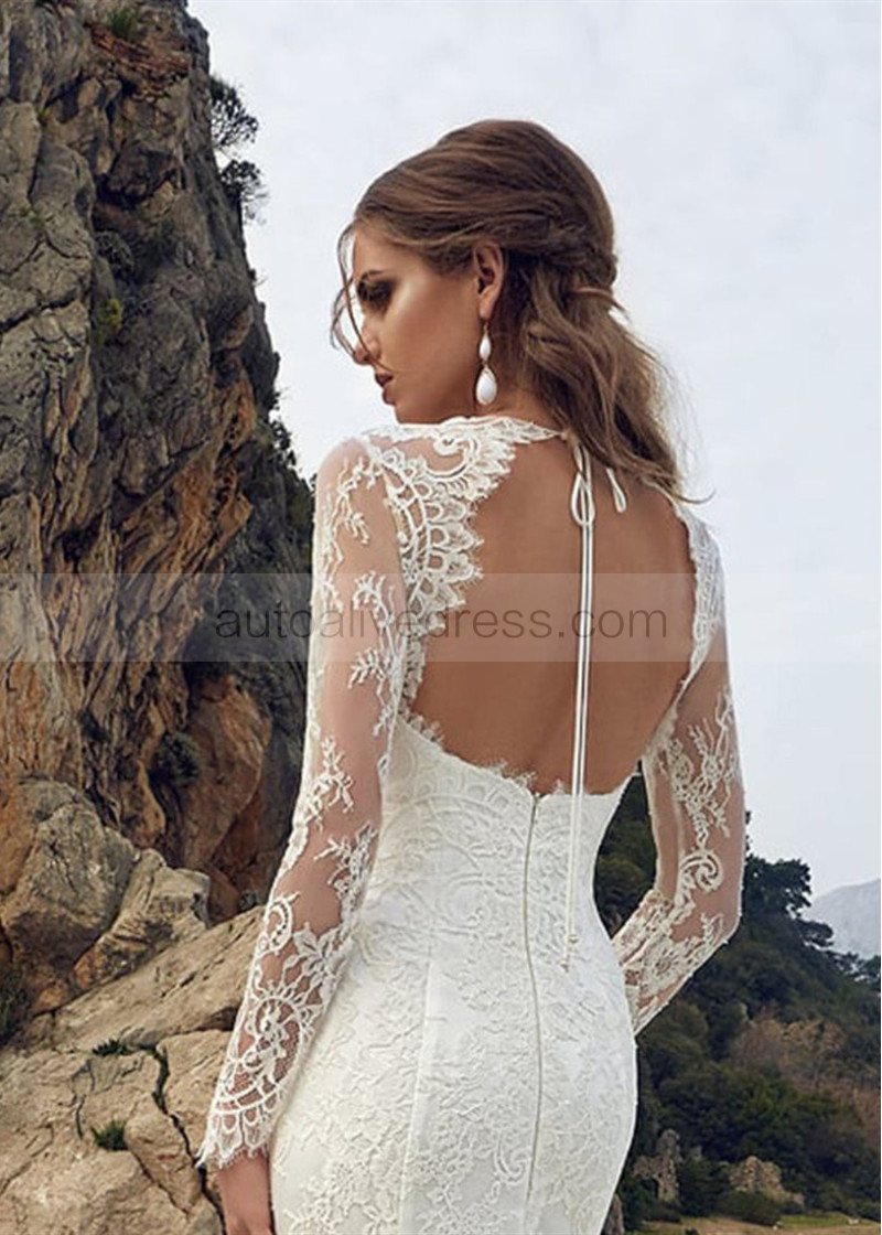Long Sheer Sleeve Ivory Lace Keyhole Back Wedding Dress