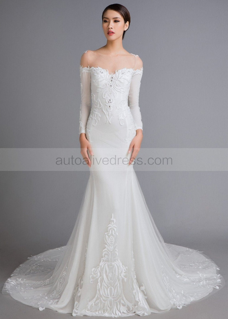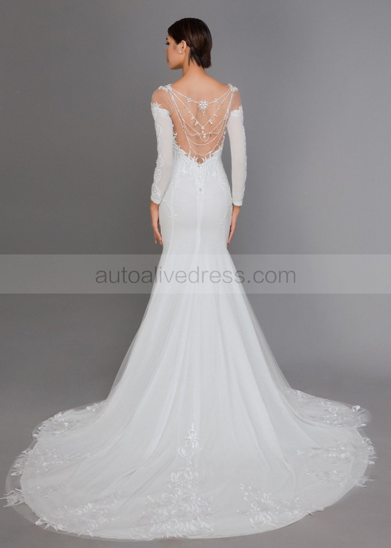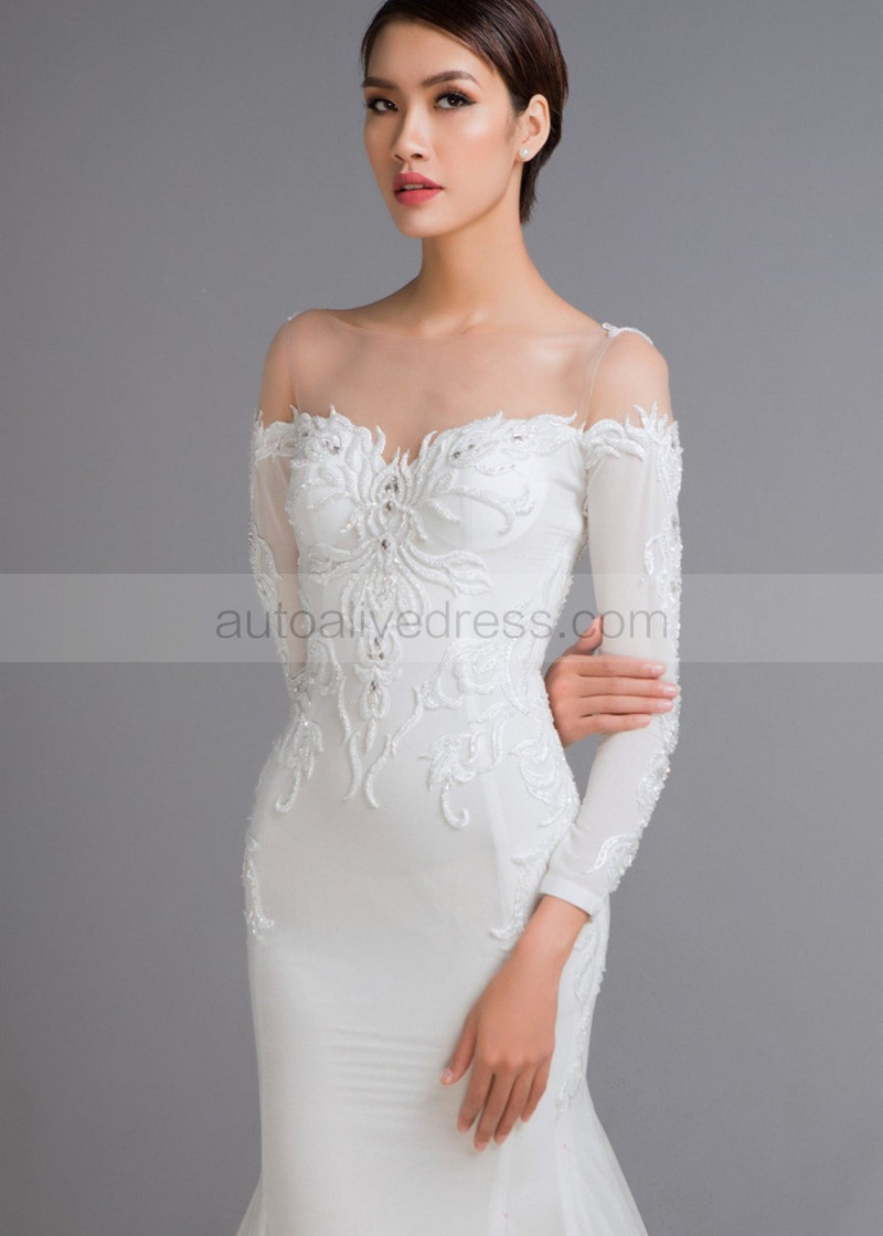 Long Sleeve Beaded Ivory Lace Satin Sheer Back Wedding Dress