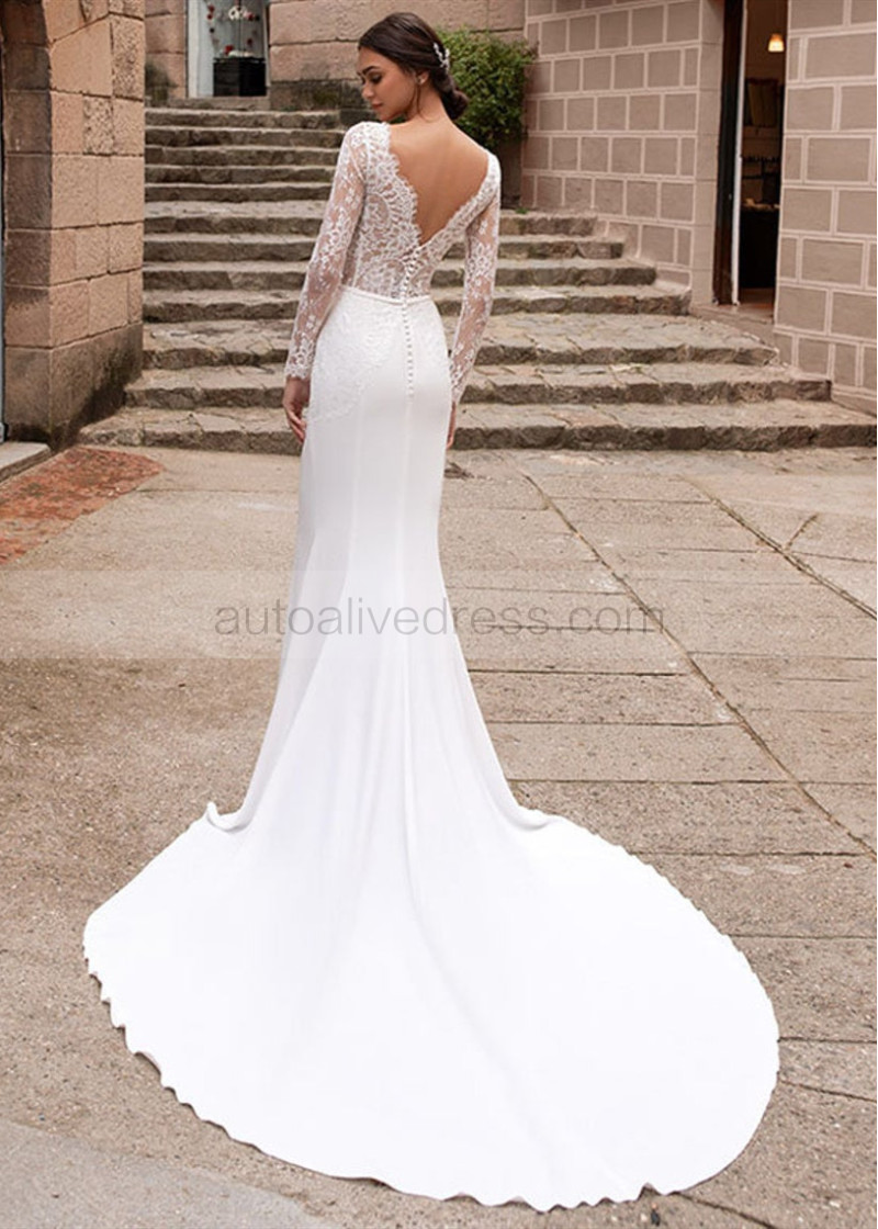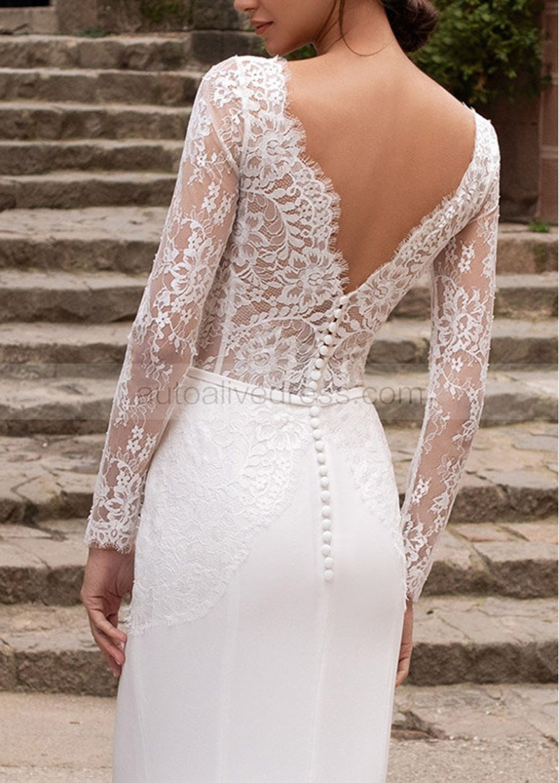 Long Sleeve Boat Neck Ivory Satin Lace Wedding Dress