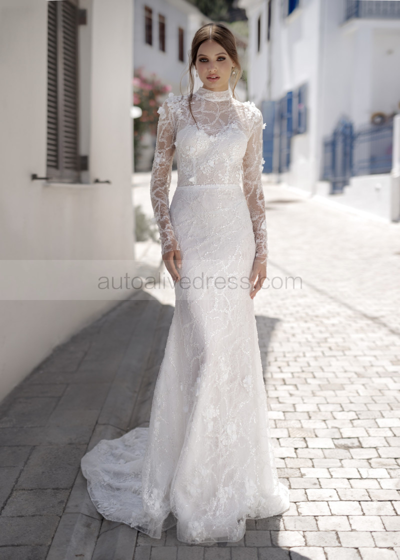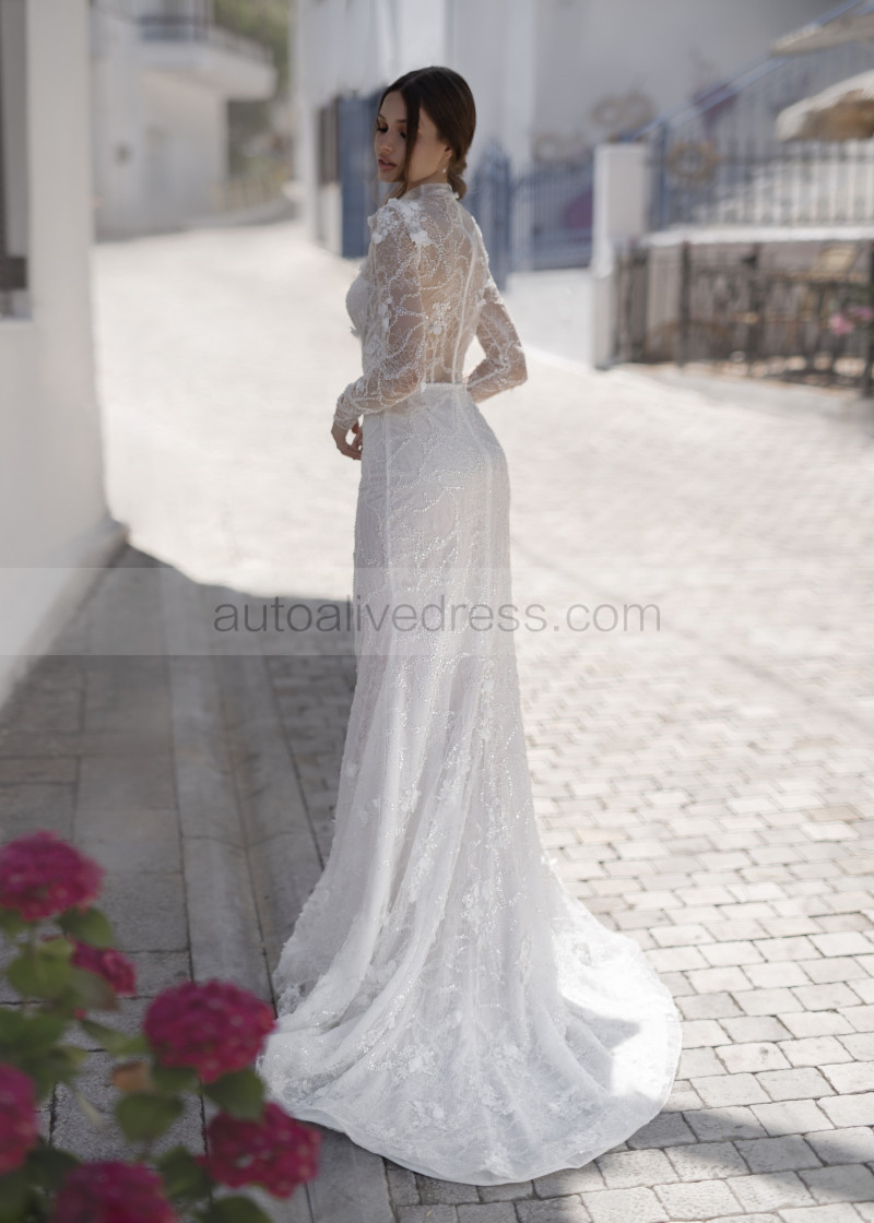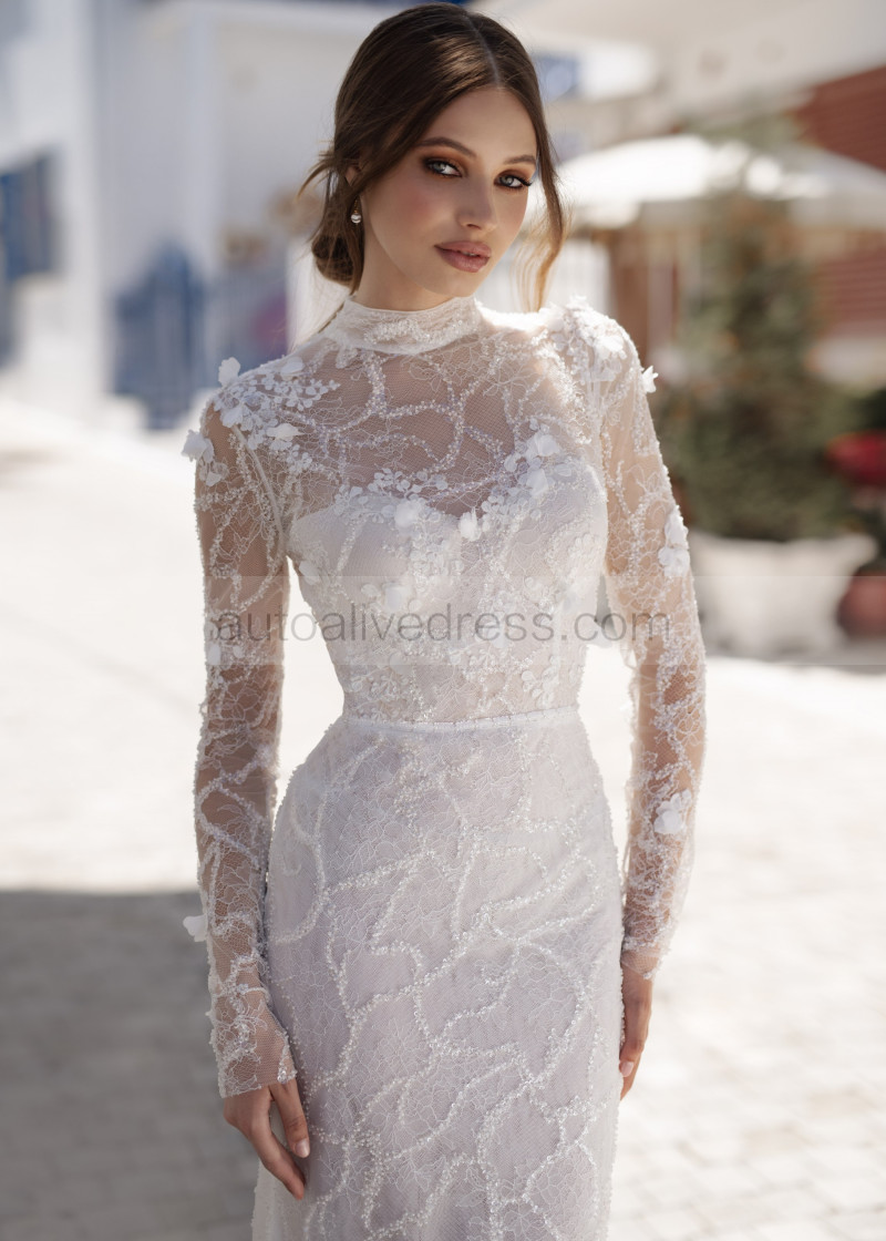 Long Sleeves Beaded Ivory Lace Tulle Exquisite Wedding Dress