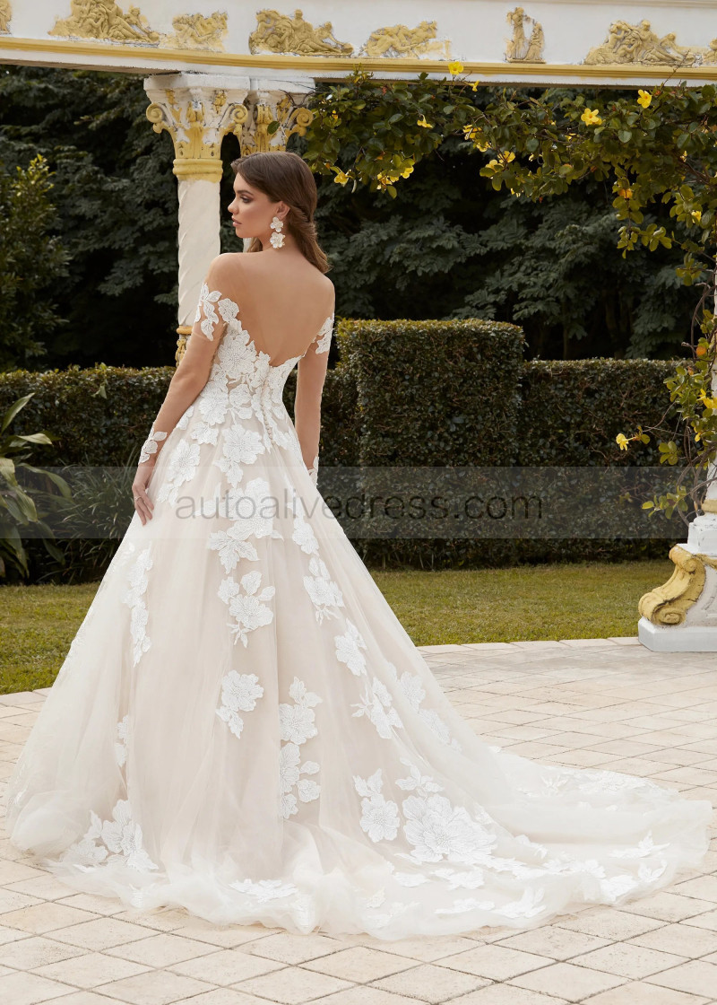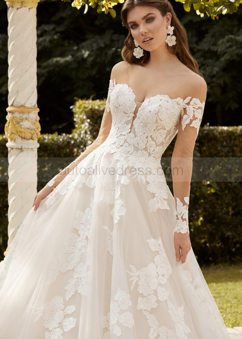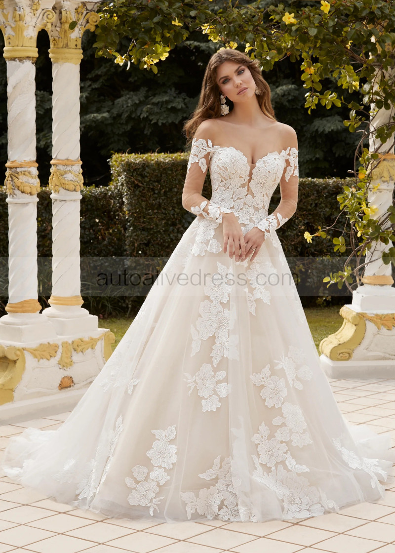 Long Sleeves Ivory Floral Lace Glitter Tulle Glamorous Wedding Dress