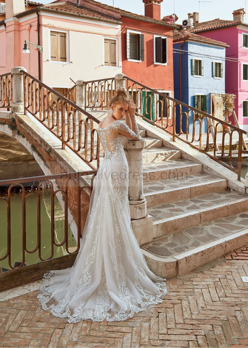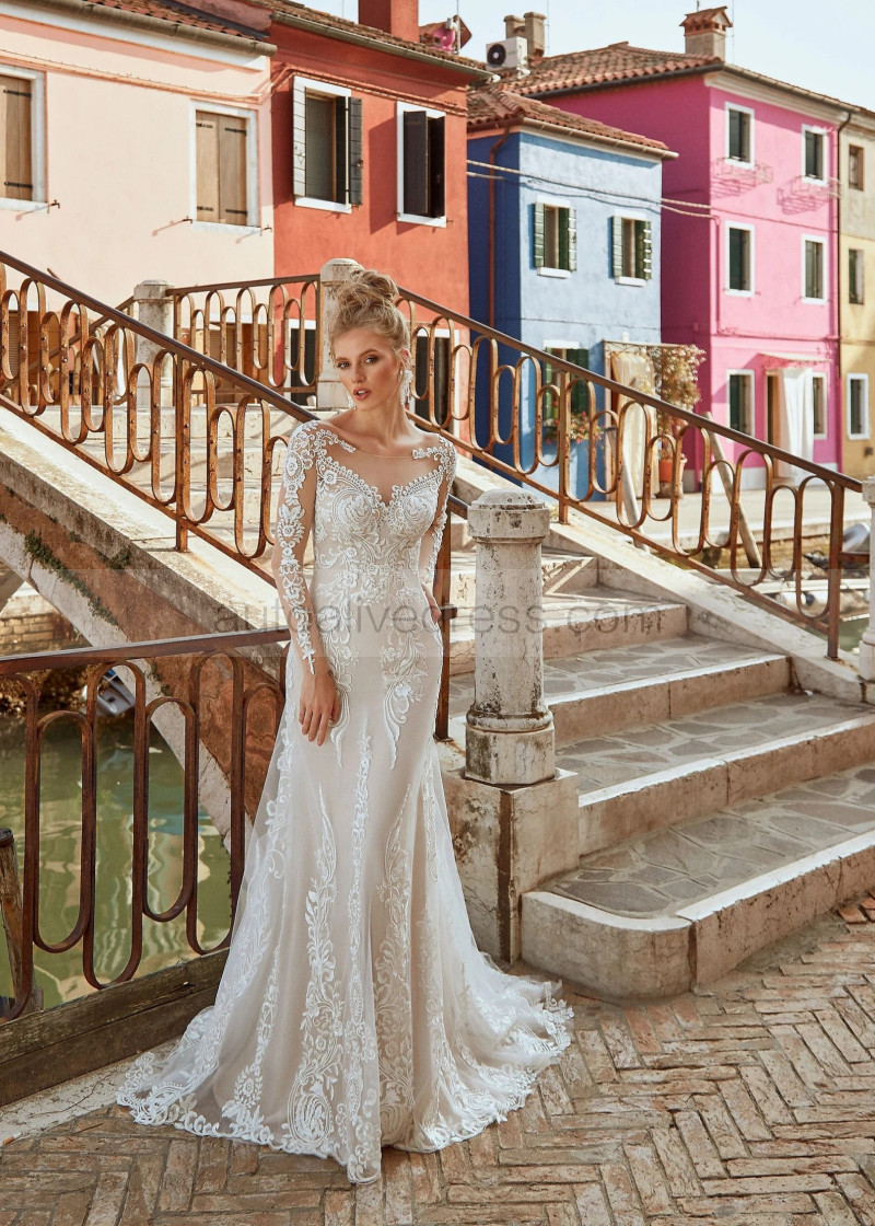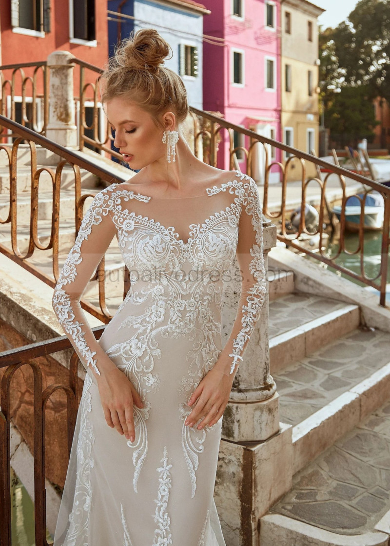 Long Sleeves Ivory Floral Lace Tulle Sheer Back Romantic Wedding Dress
