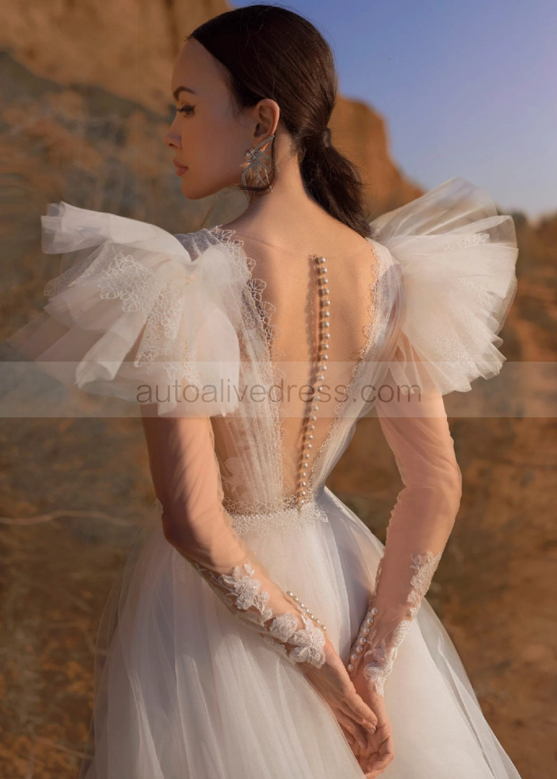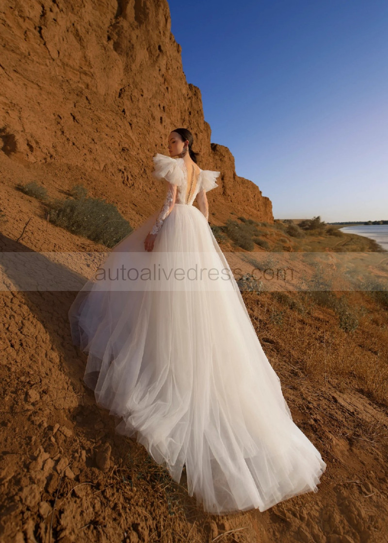 Long Sleeves Ivory Lace Tulle Romantic Wedding Dress
