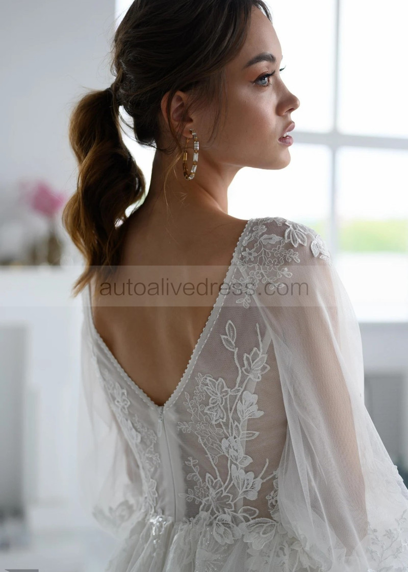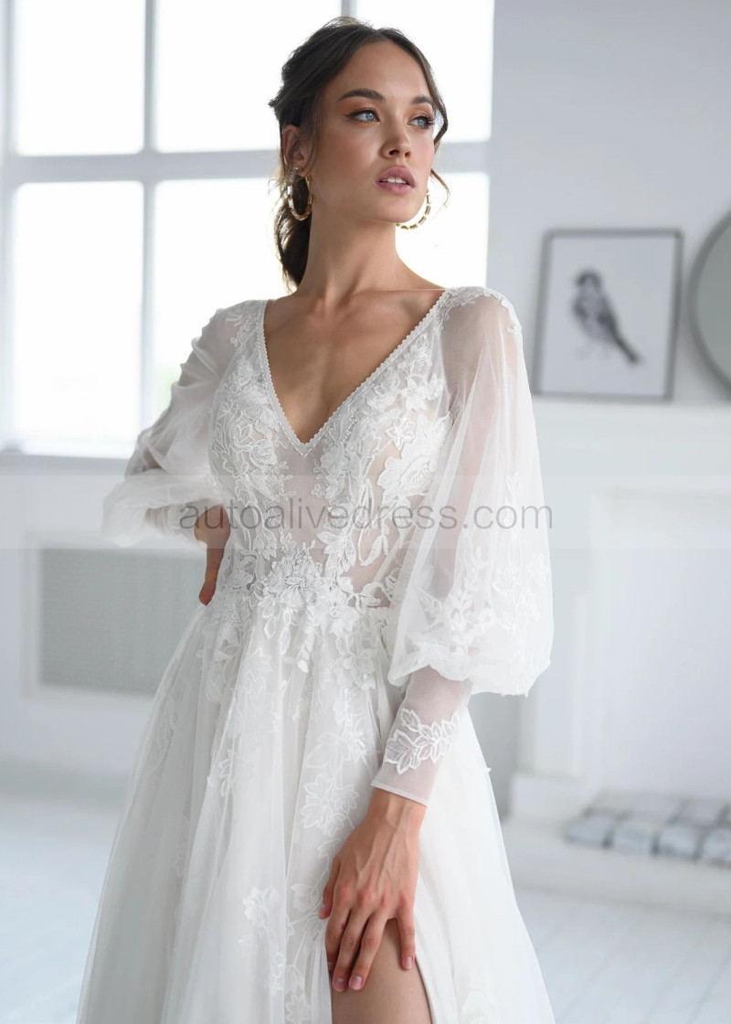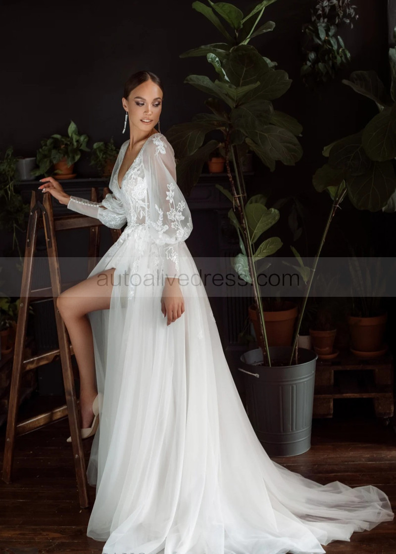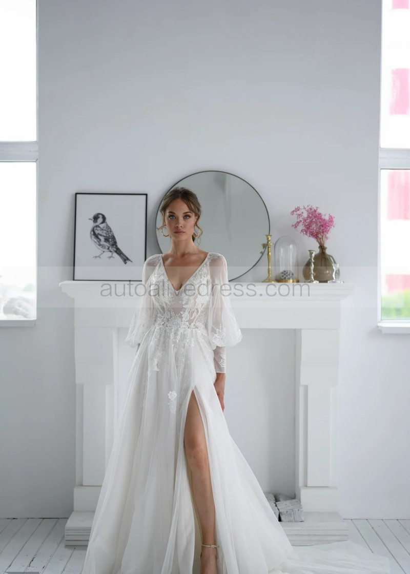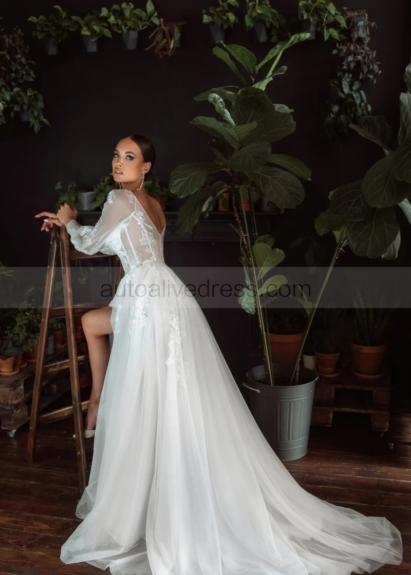 Long Sleeves Ivory Lace Tulle Slit Airy Wedding Dress