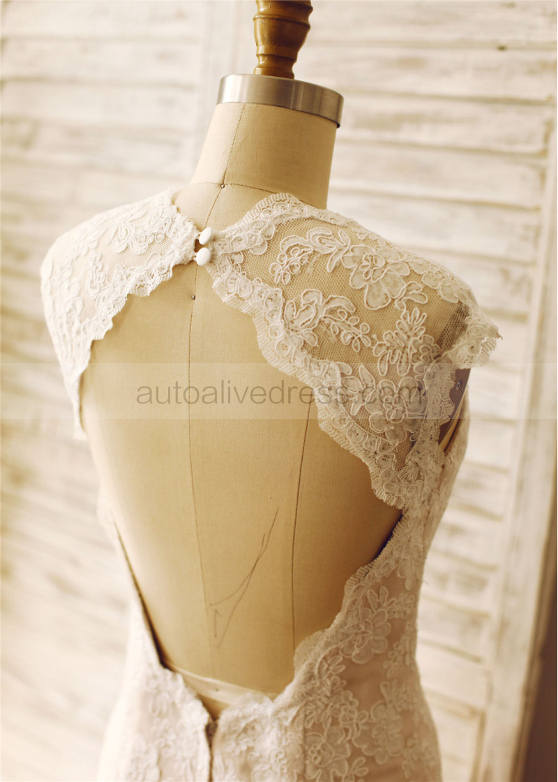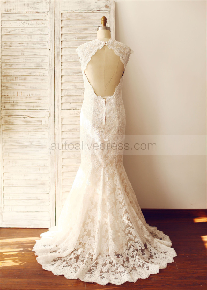 Mermaid Ivory Lace Champagne Lining Keyhole Back Wedding Dress