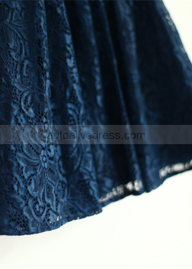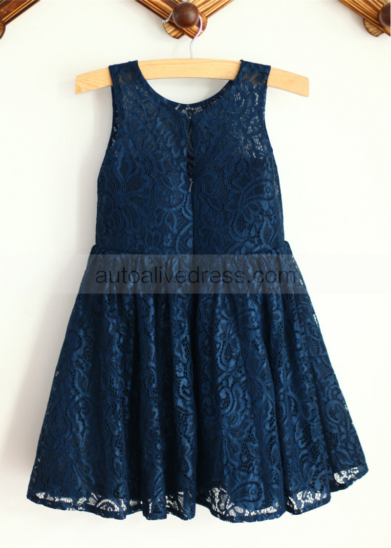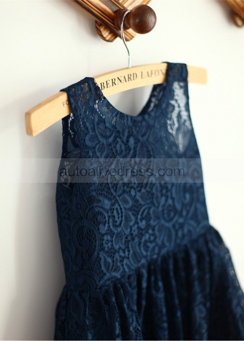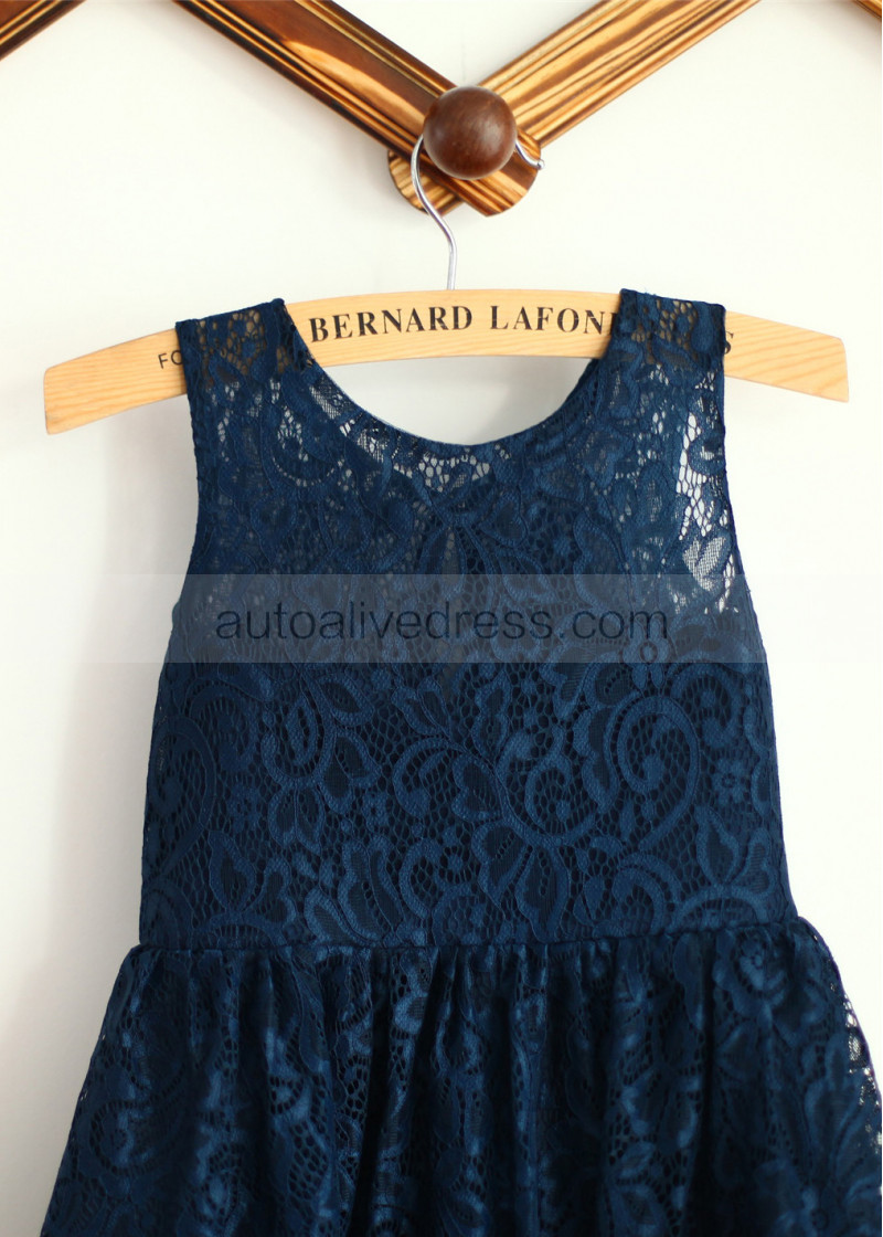 Navy Blue Lace Slit Back Knee Length Flower Girl Dress