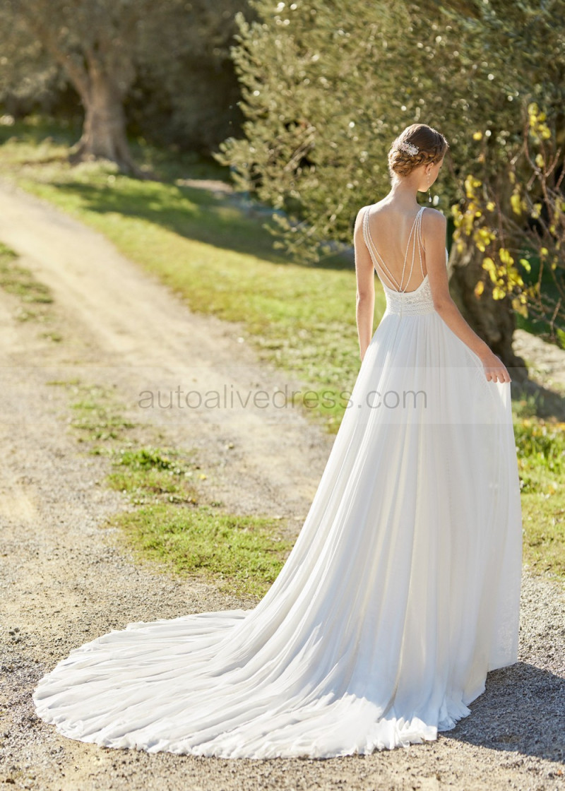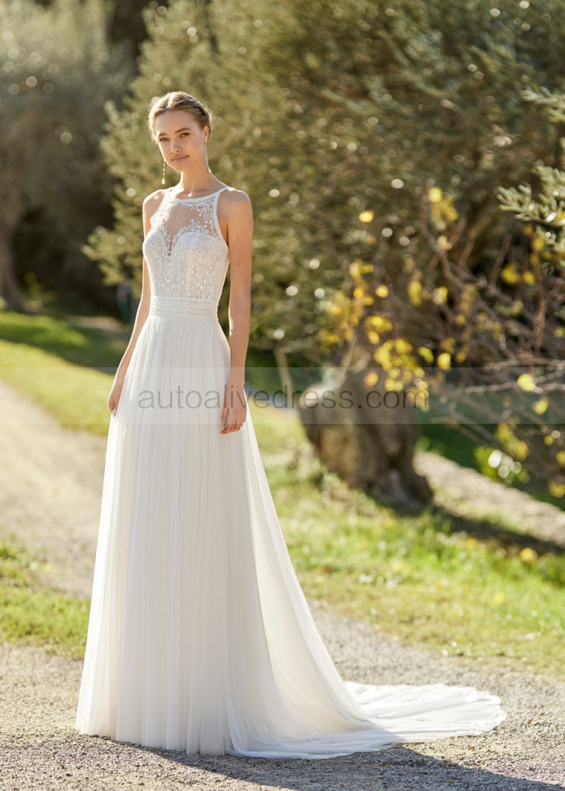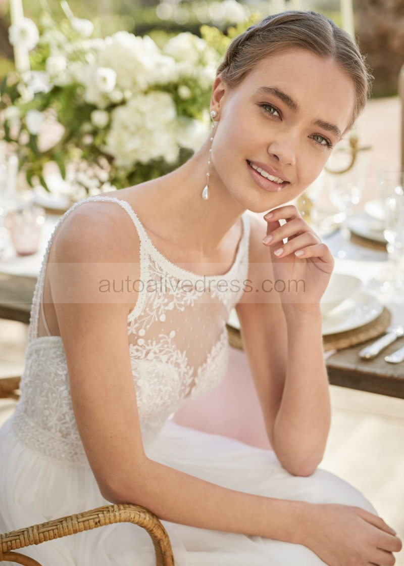 Bateau Neck Ivory Lace Tulle Open Back Wedding Dress