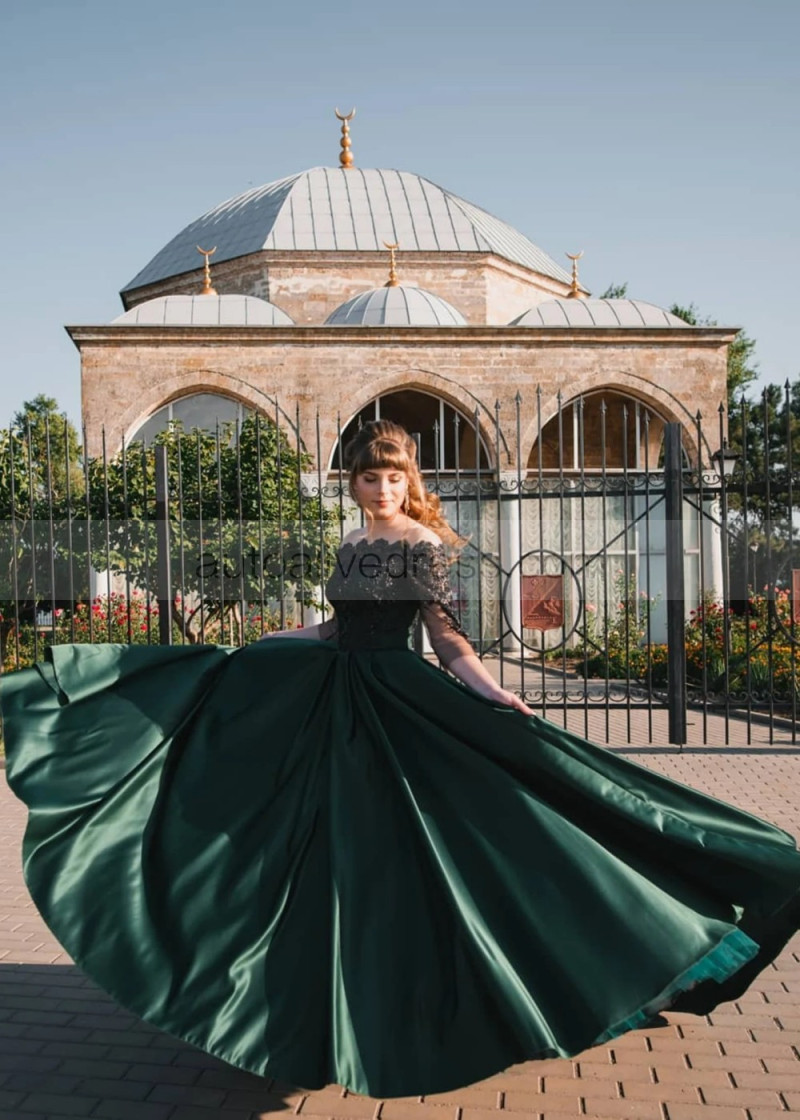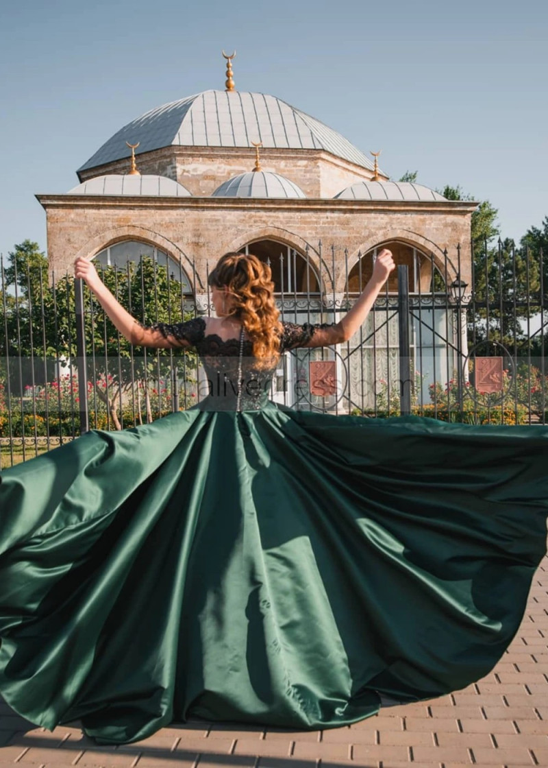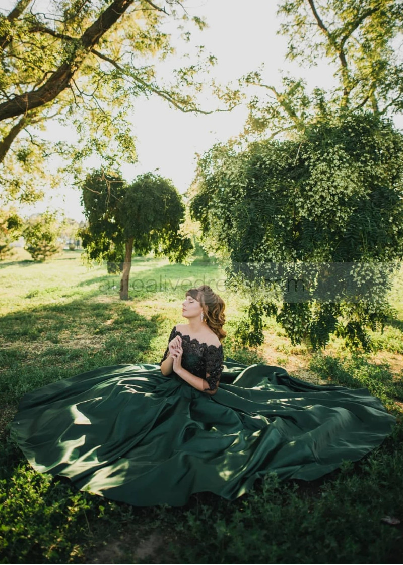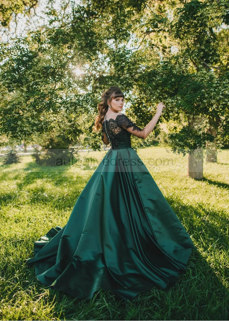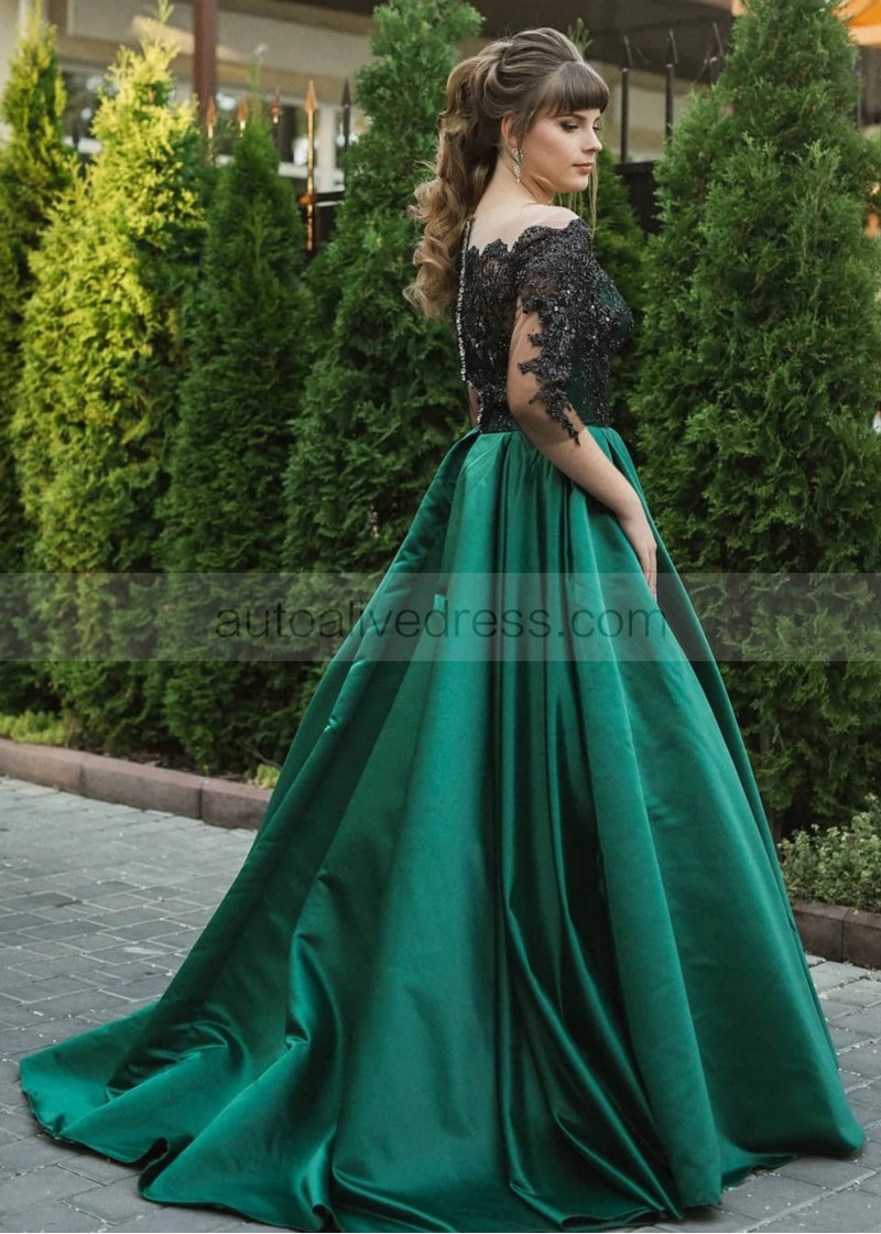 Beaded Black Lace Emerald Satin Classic Evening Dress