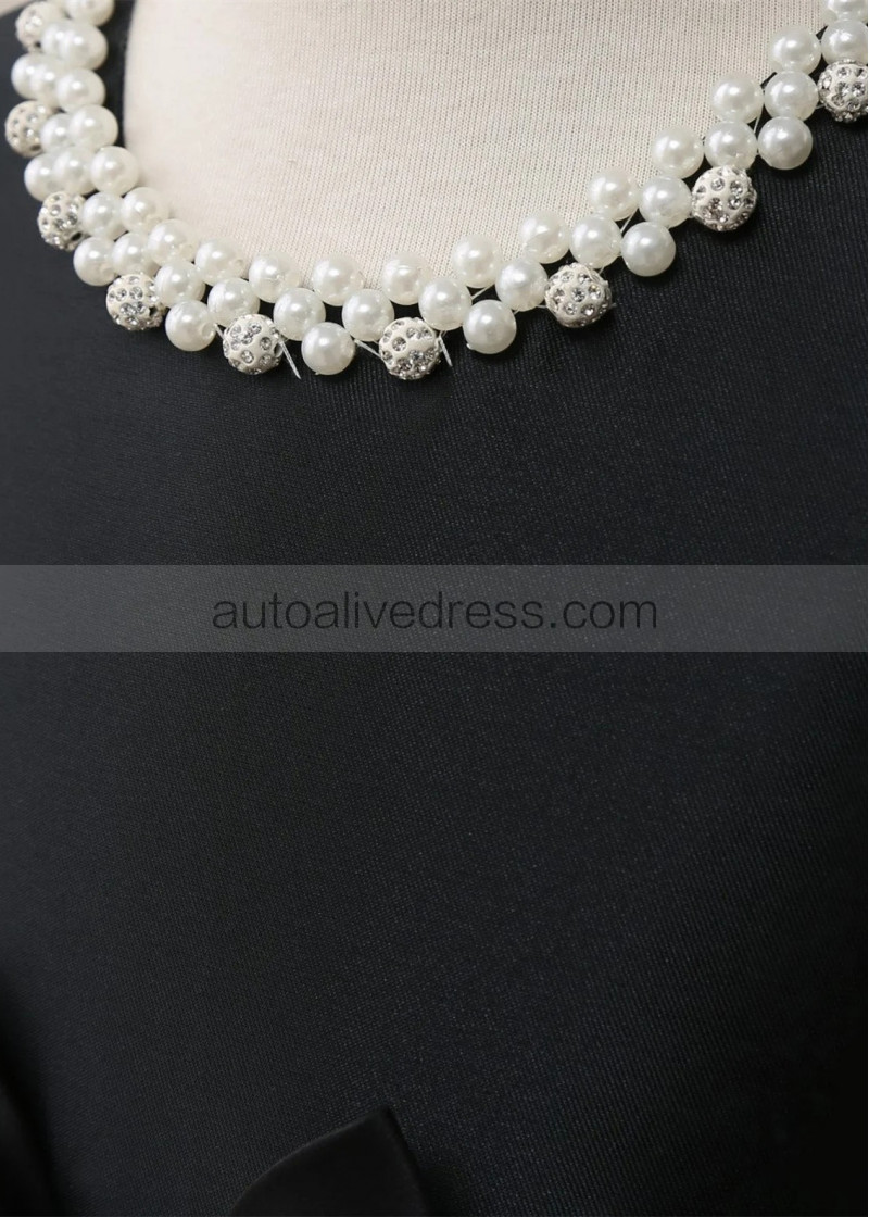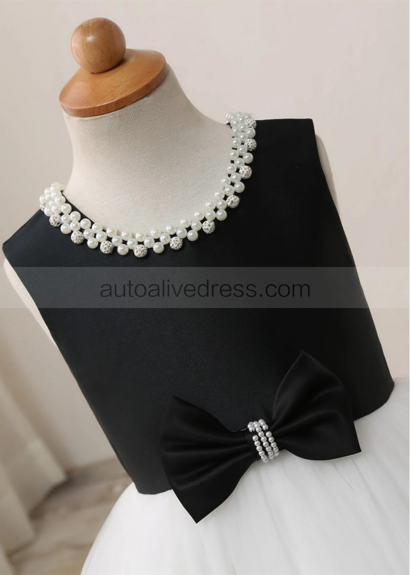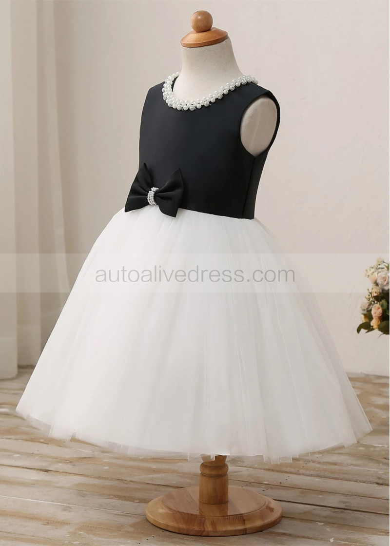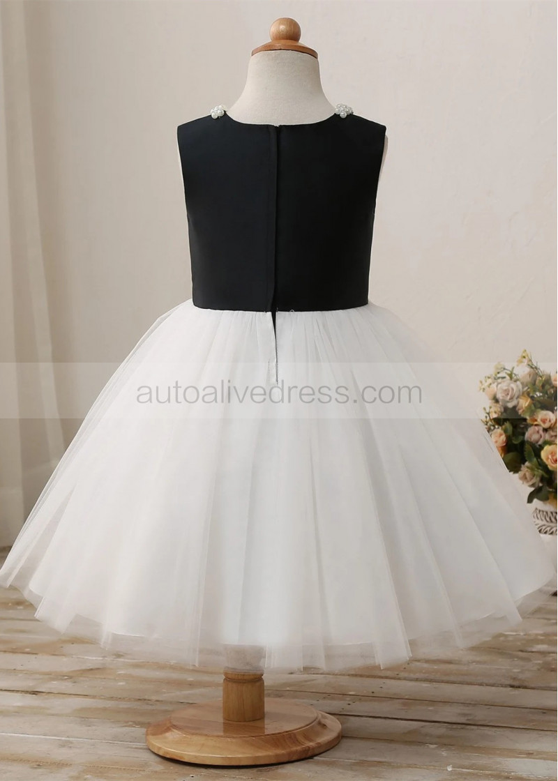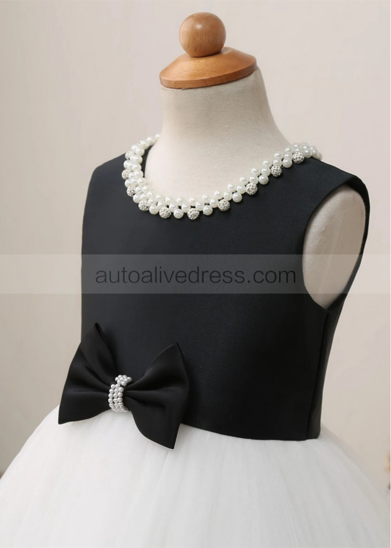 Beaded Black Satin Ivory Tulle Flower Girl Dress With Bow