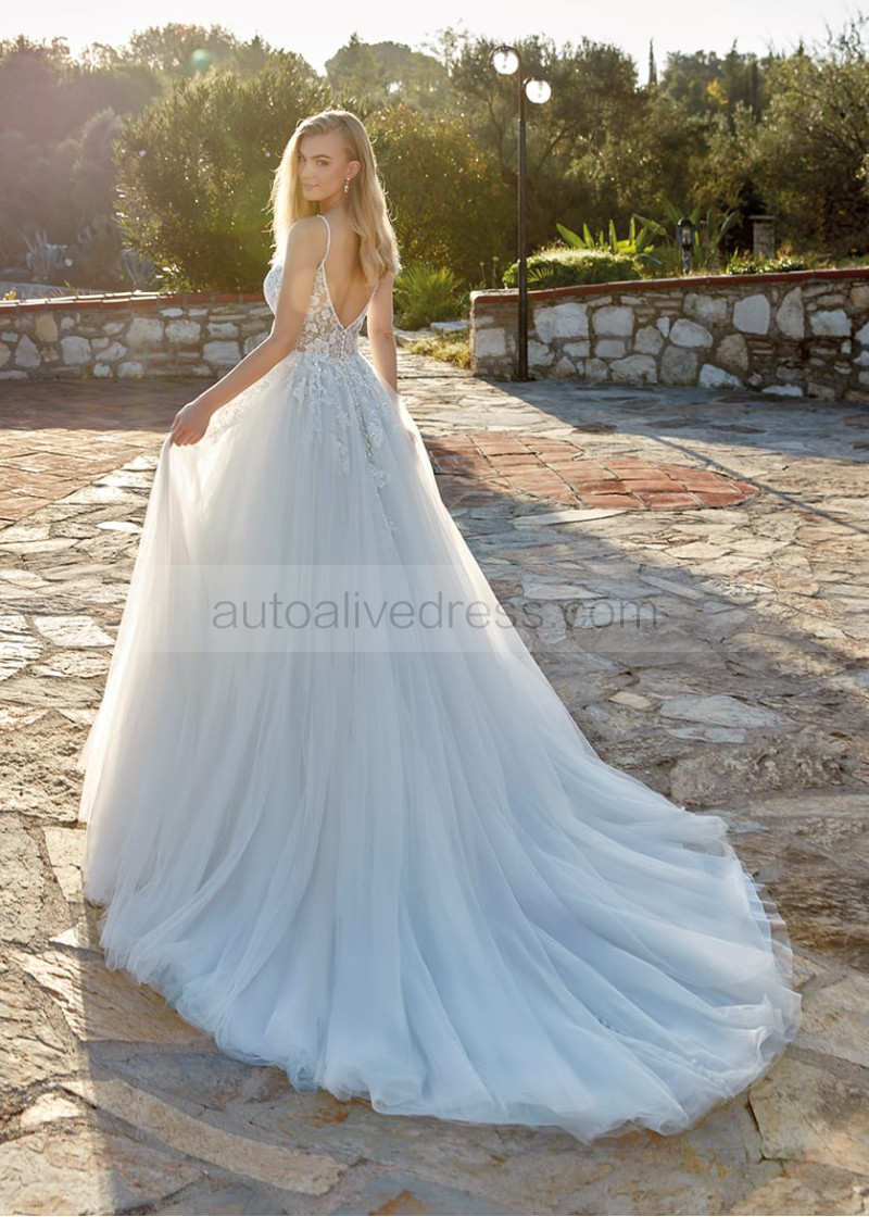 Beaded Blue Lace Tulle V Back Sexy Wedding Dress