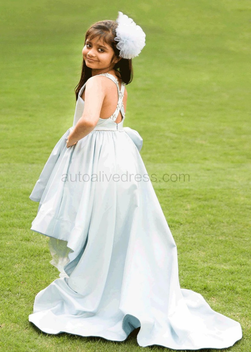 Beaded Blue Satin Cross Back High Low Flower Girl Dress