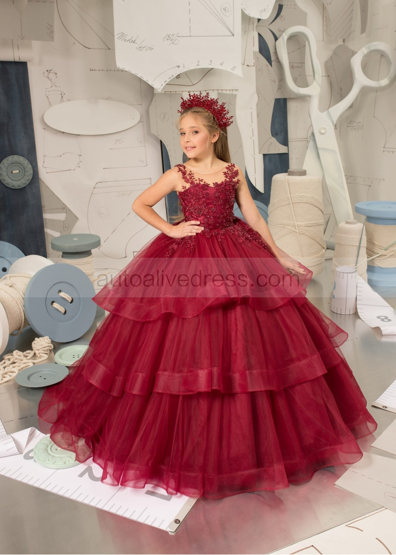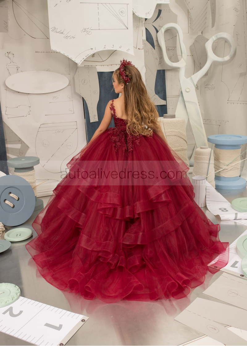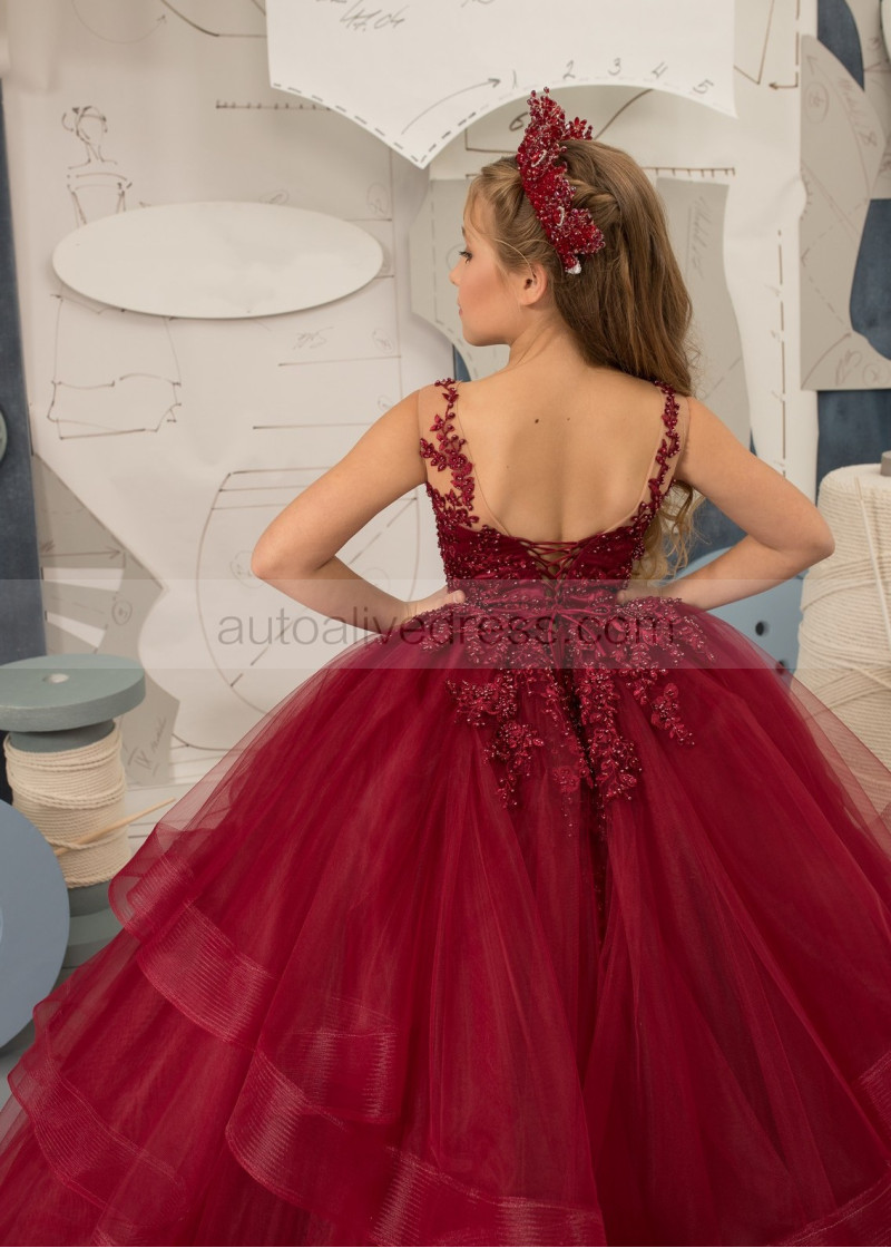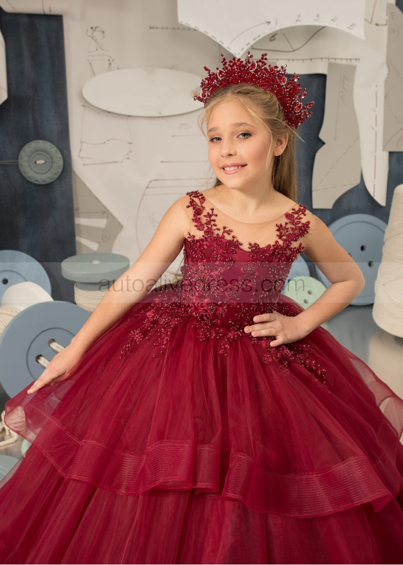 Beaded Burgundy Lace Tulle Corset Back Flower Girl Dress