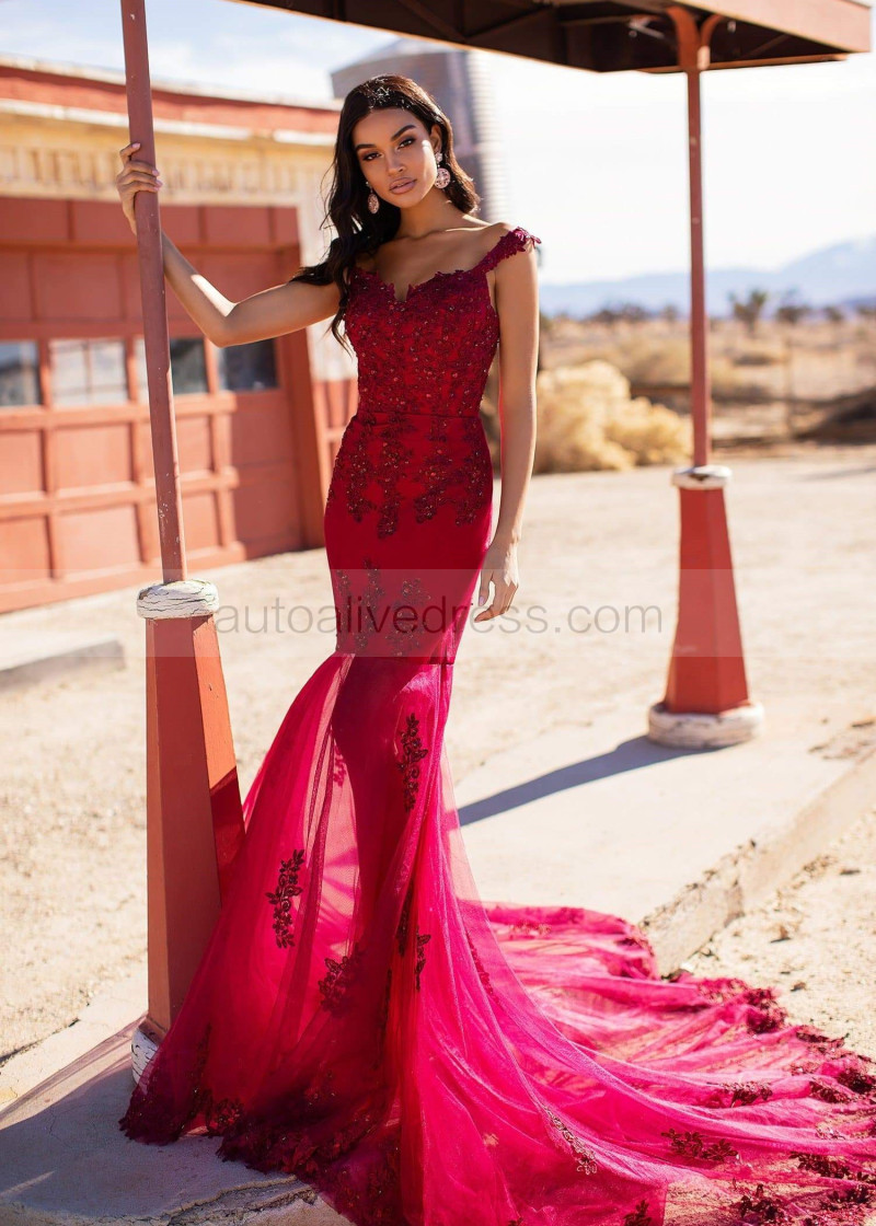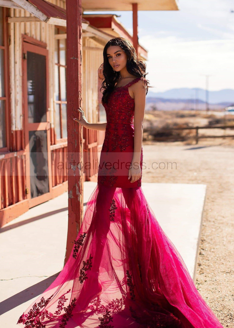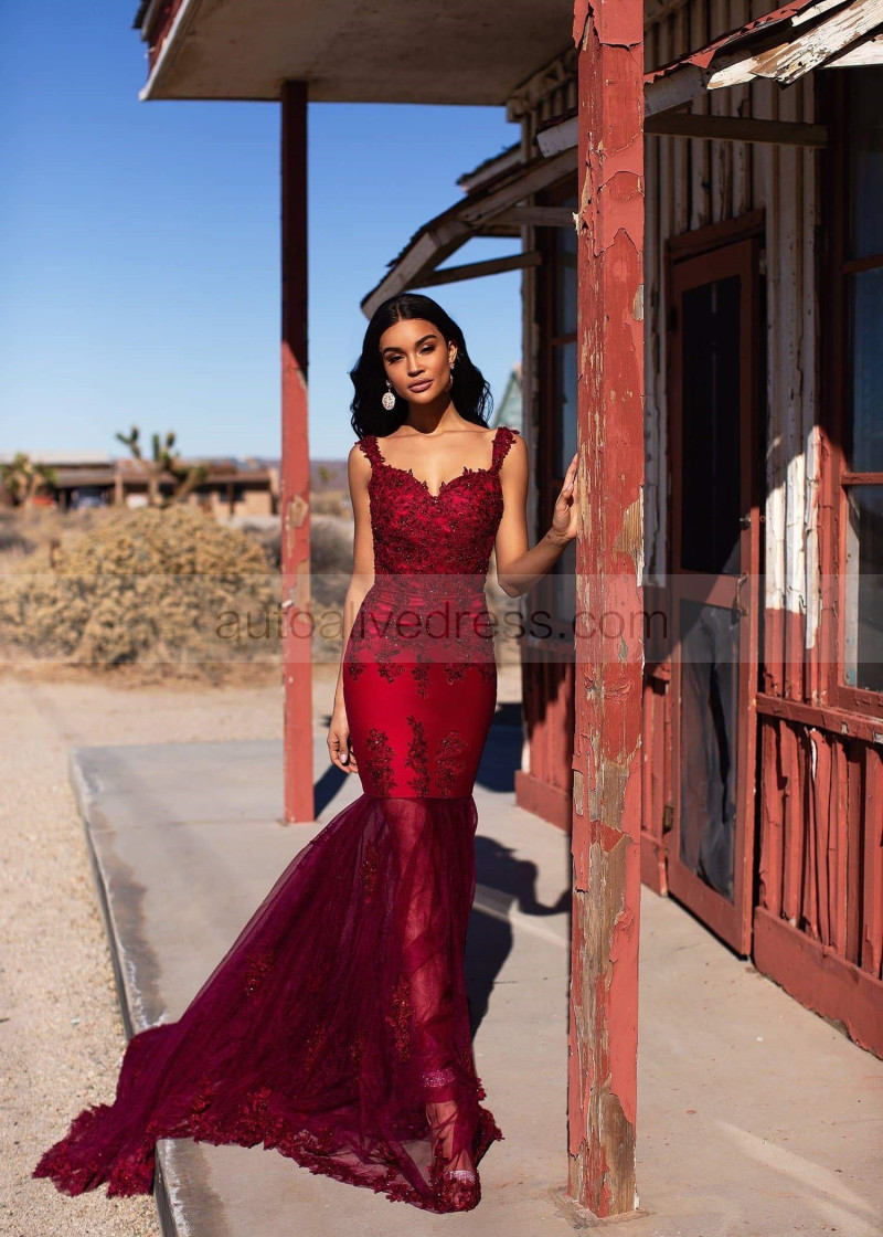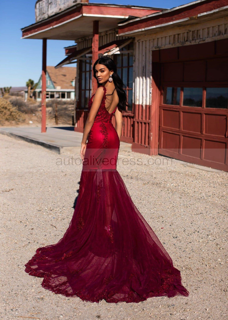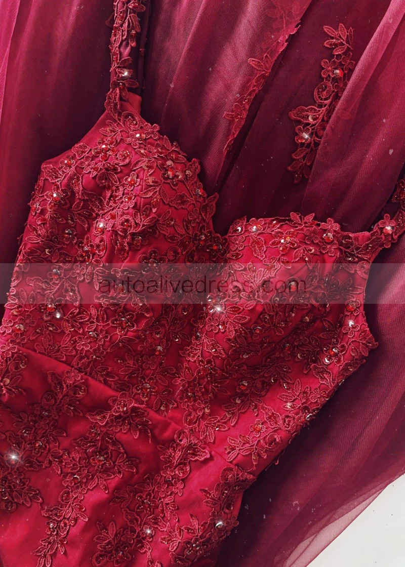 Beaded Burgundy Lace Tulle V Back Prom Dress