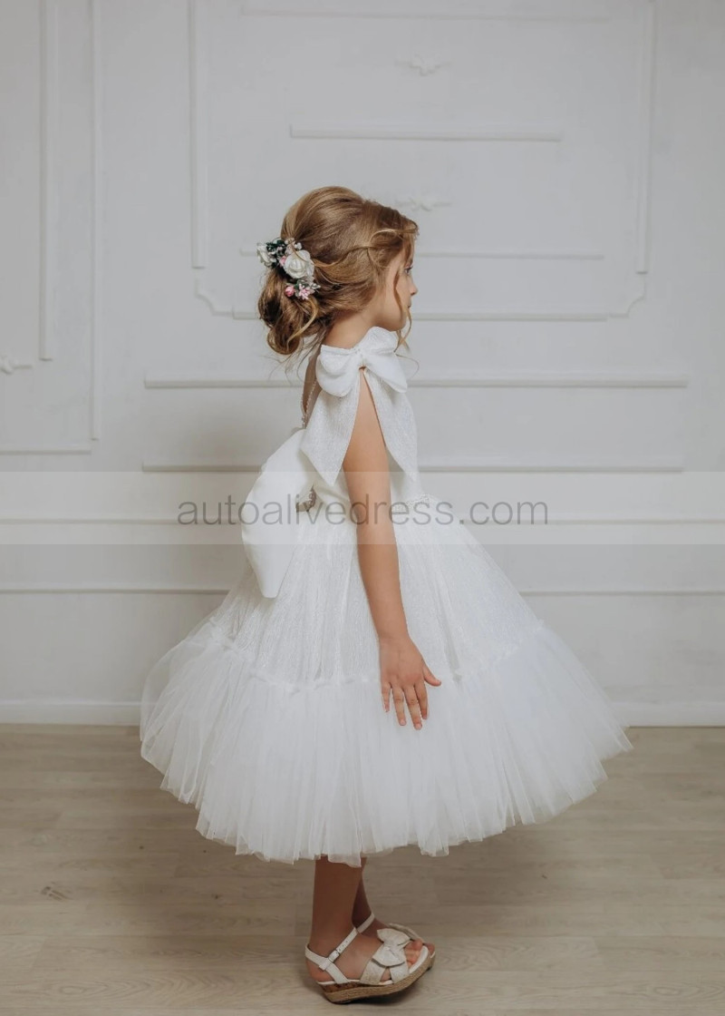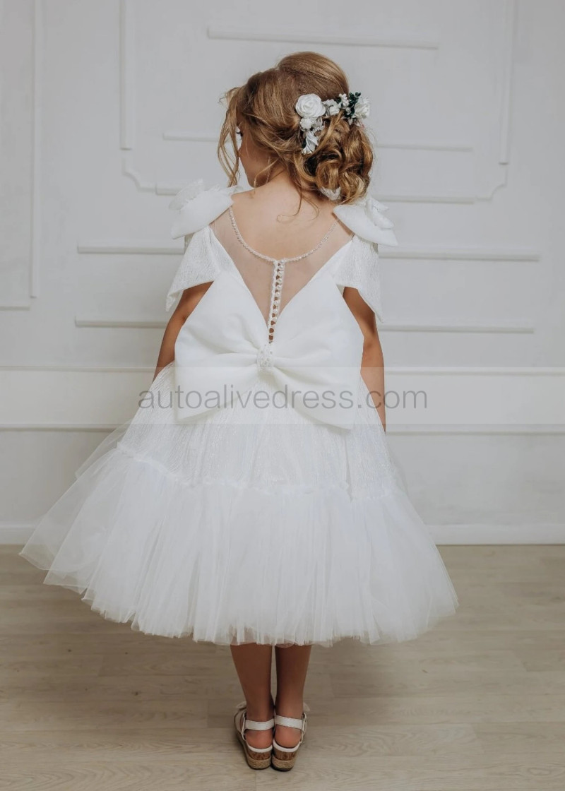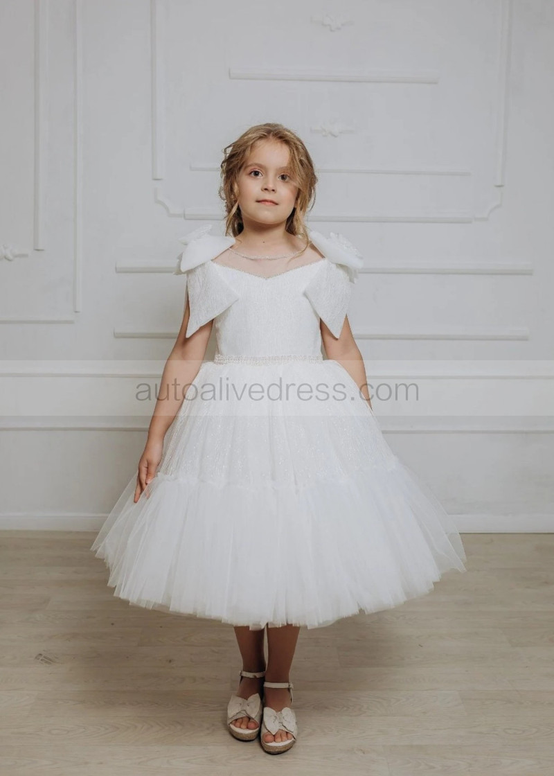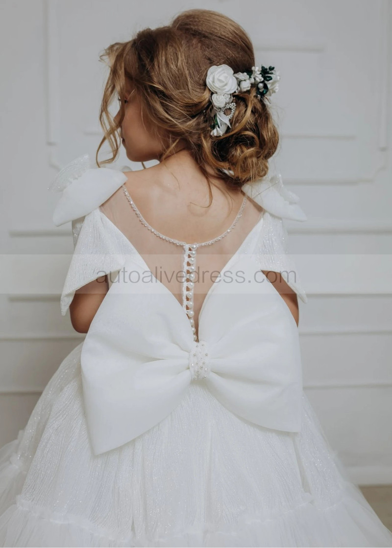Beaded Ivory Glitter Lace Tulle Flower Girl Dress With Bows