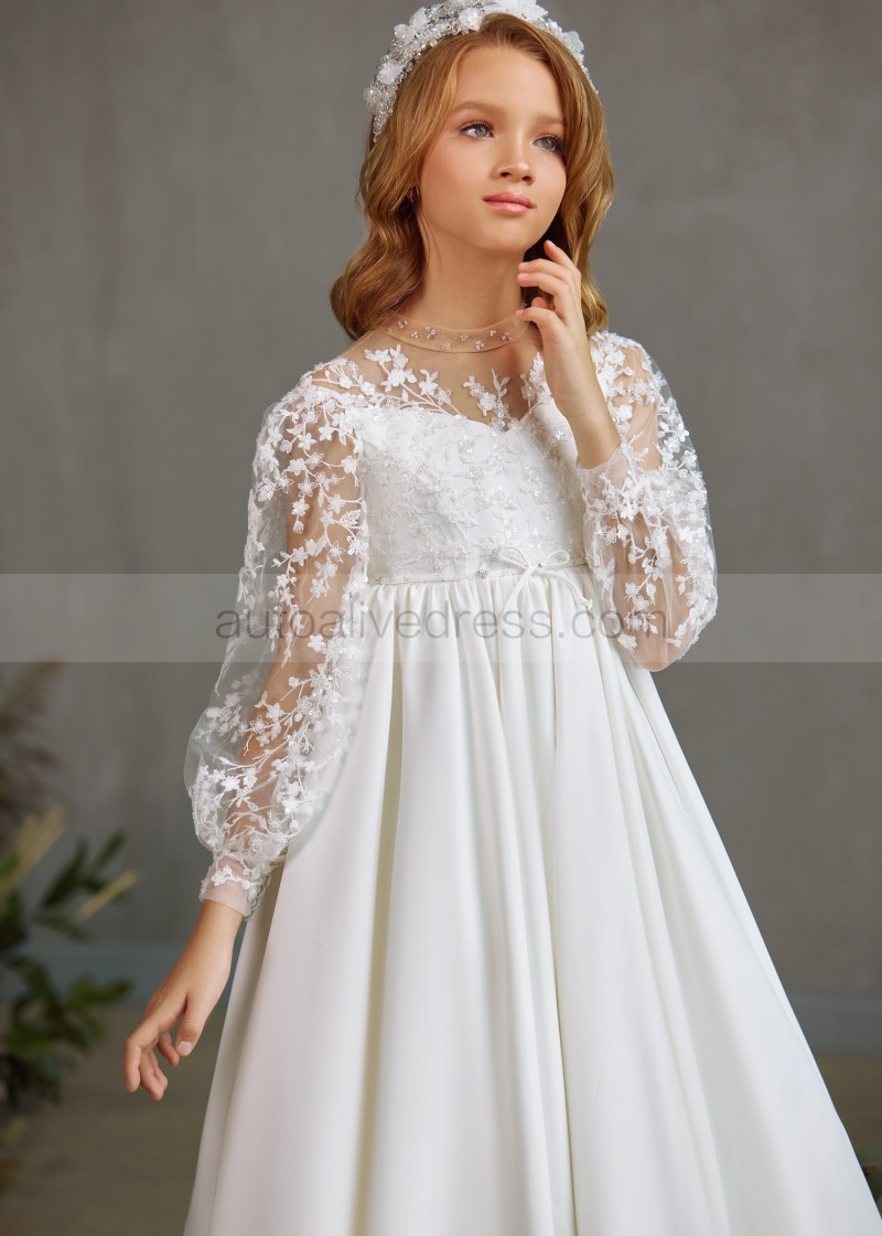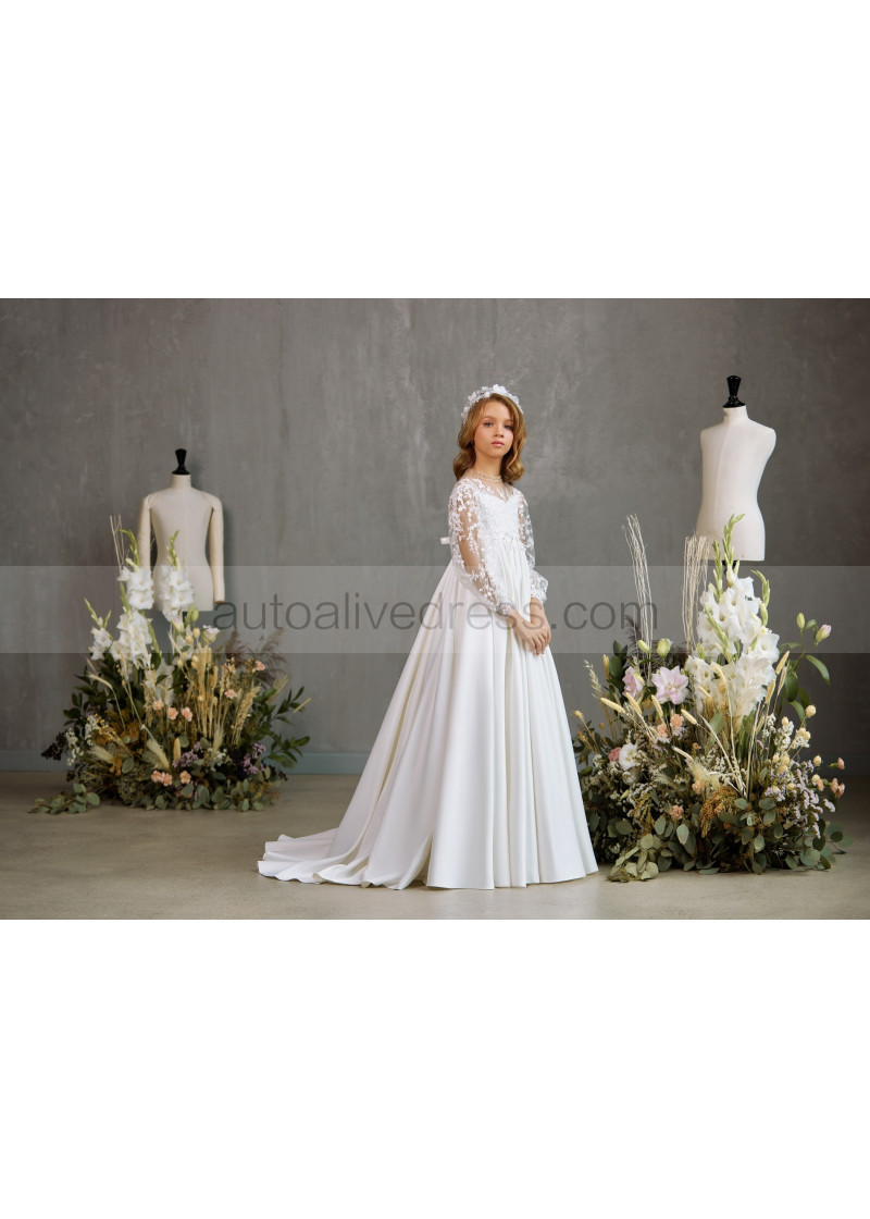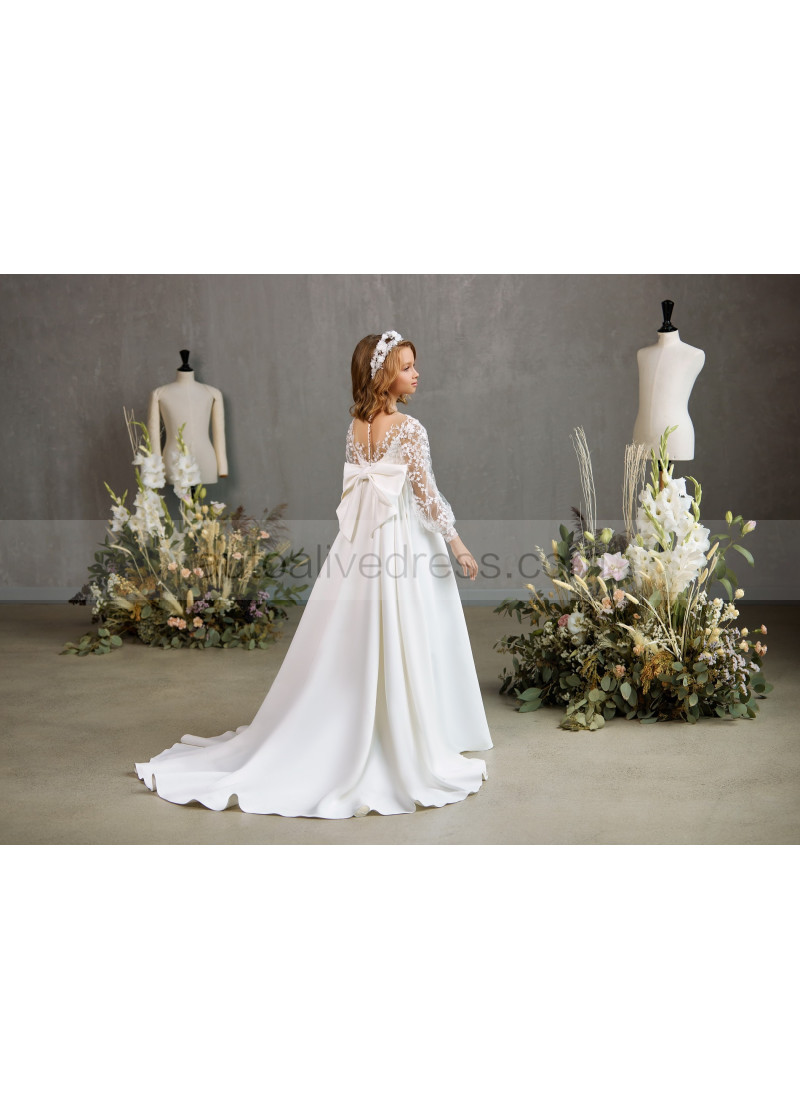 Beaded Ivory Lace Satin Flower Girl Dress With Bows