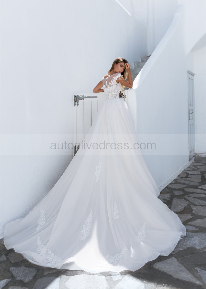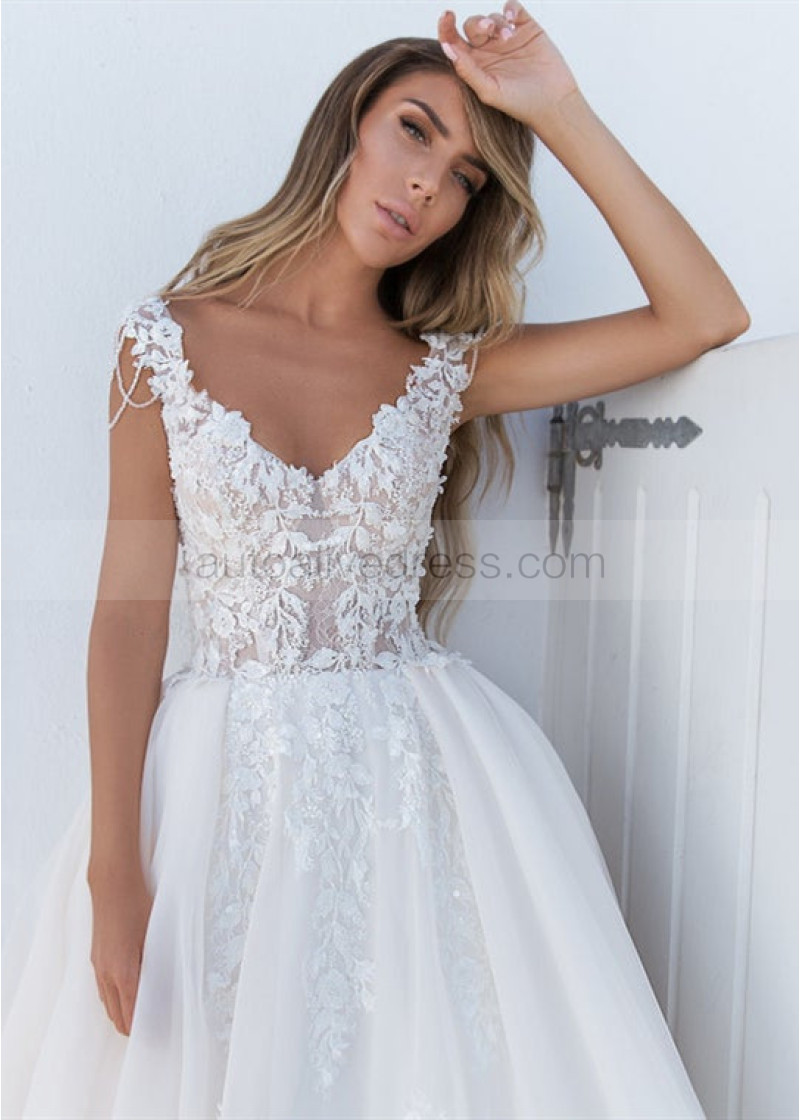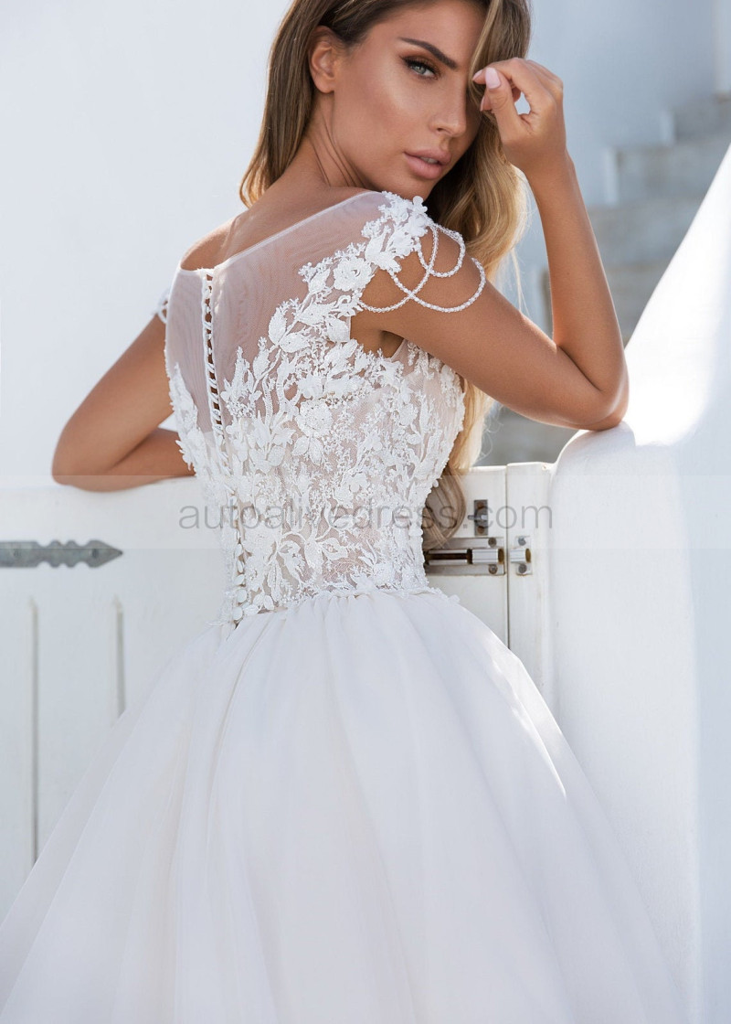Beaded Ivory Lace Tulle Buttons Back Wedding Dress