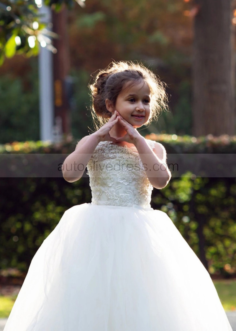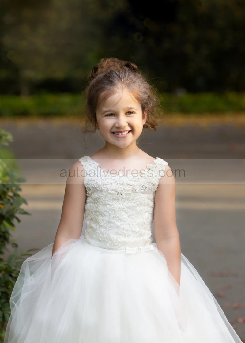 Beaded Ivory Lace Tulle Corset Back Long Flower Girl Dress