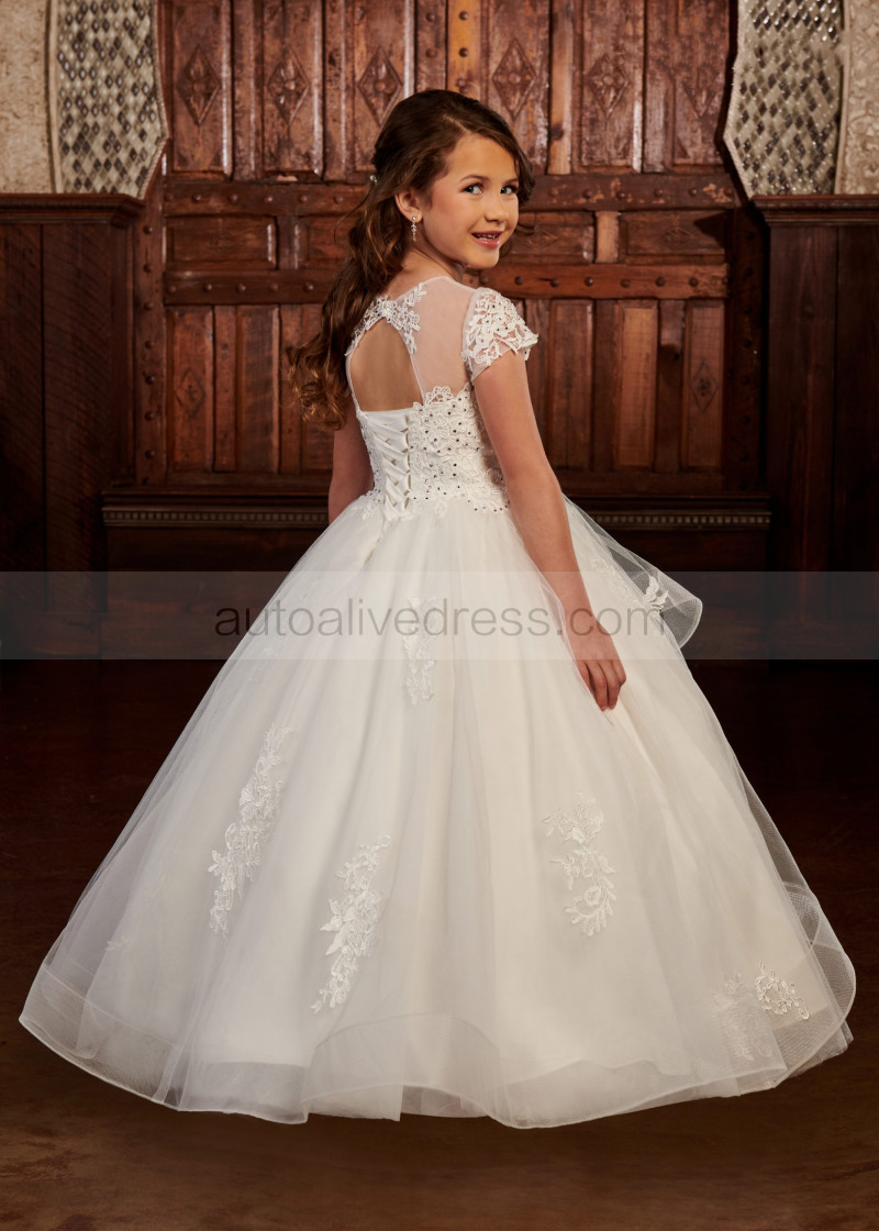 Beaded Ivory Lace Tulle Keyhole Back Flower Girl Dress With Horsehair Hem