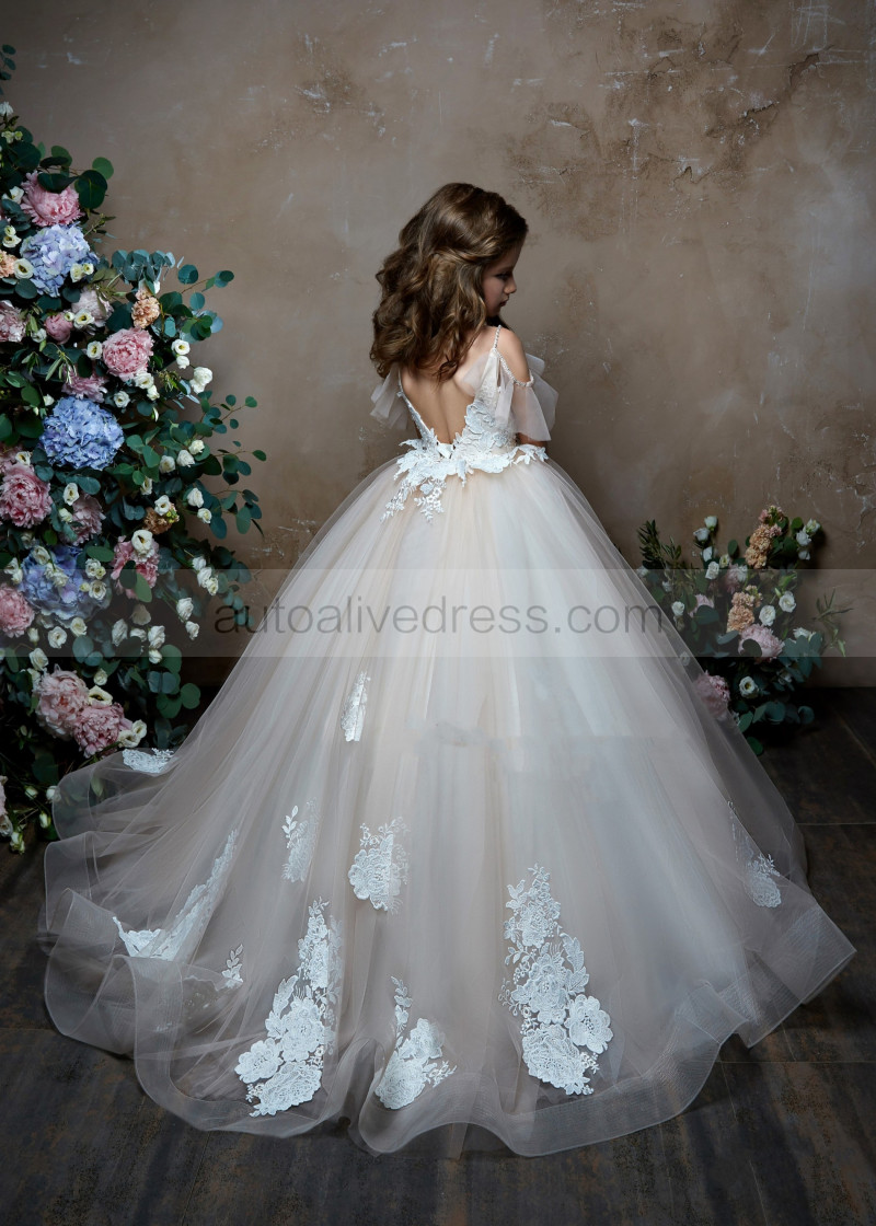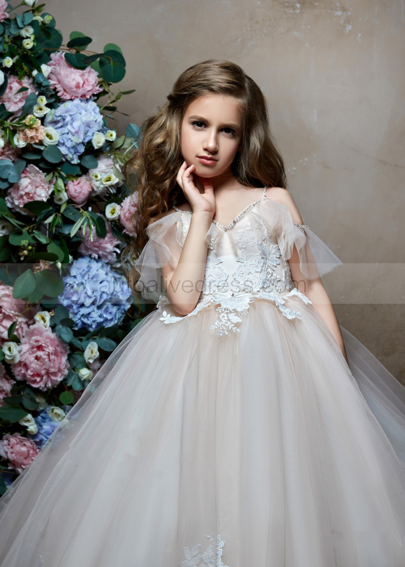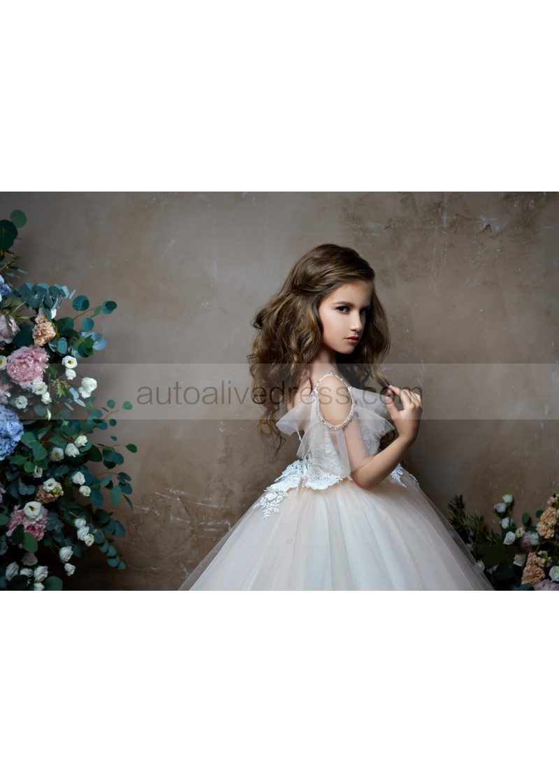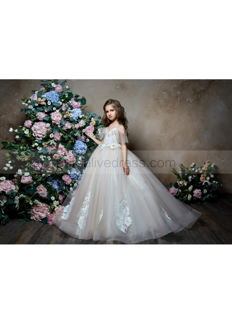 Beaded Ivory Lace Tulle Open Corset Back Flower Girl Dress