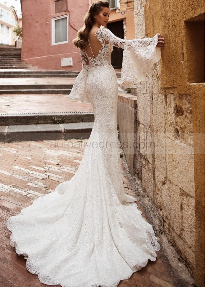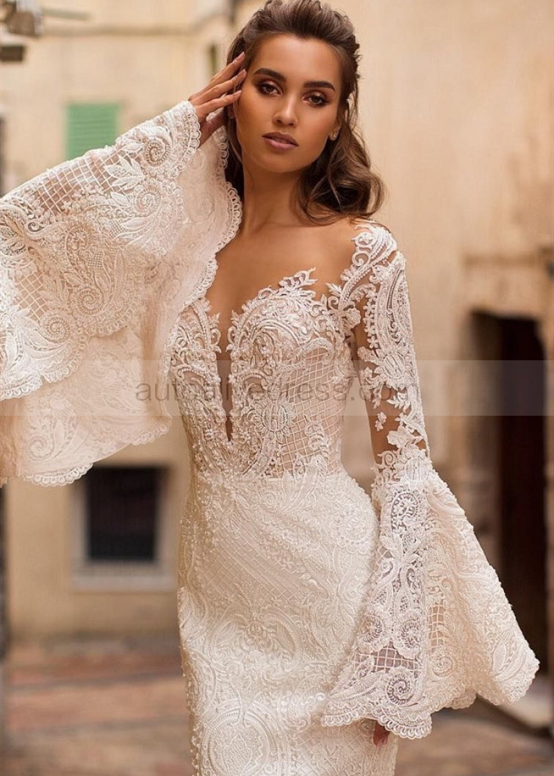 Beaded Ivory Lace Wedding Dress With Detachable Trumpet Sleeve