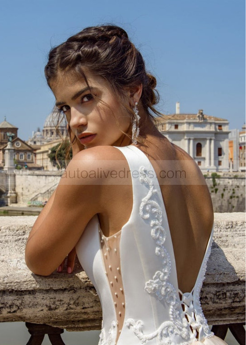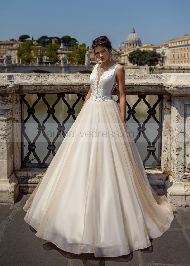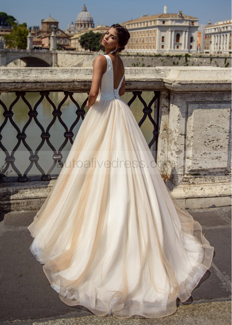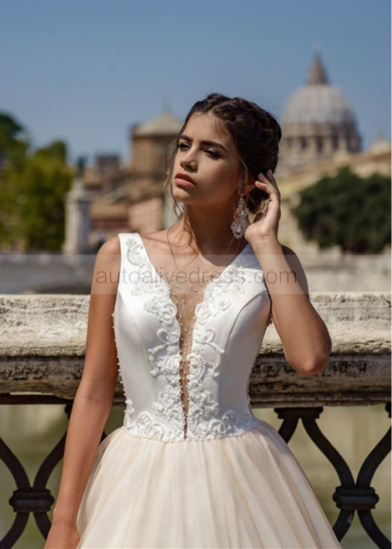 Beaded Ivory Satin Champagne Tulle Wedding Dress