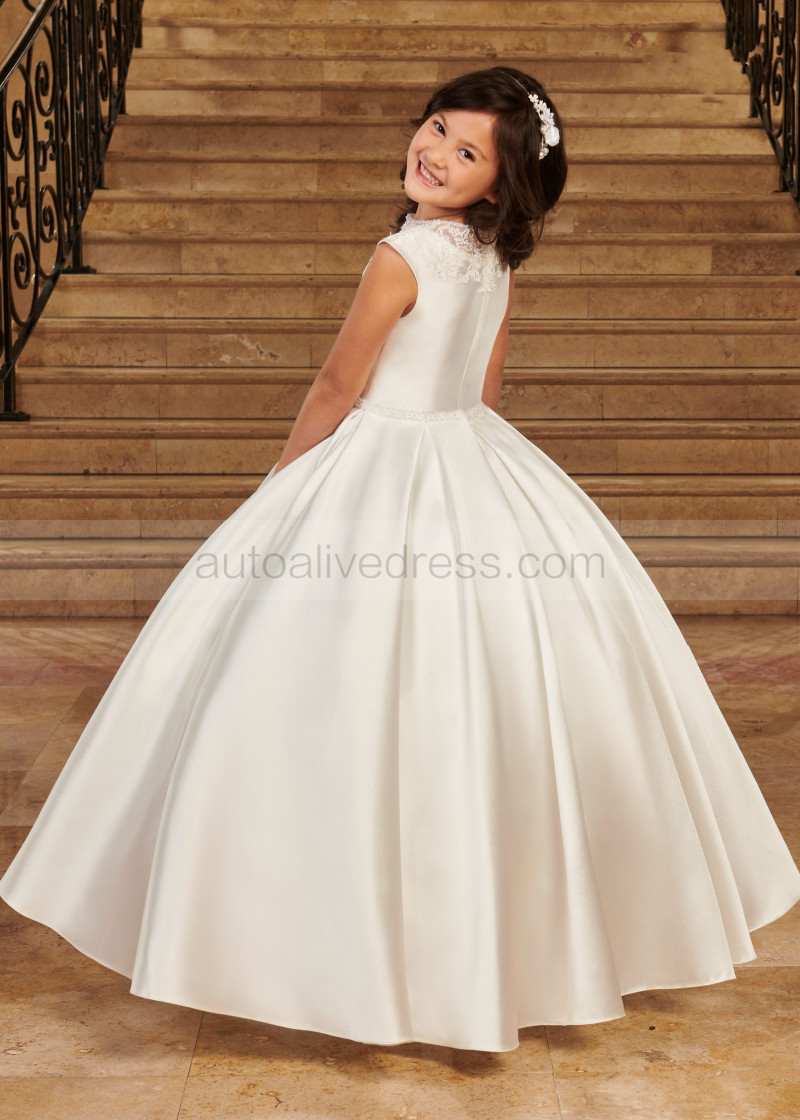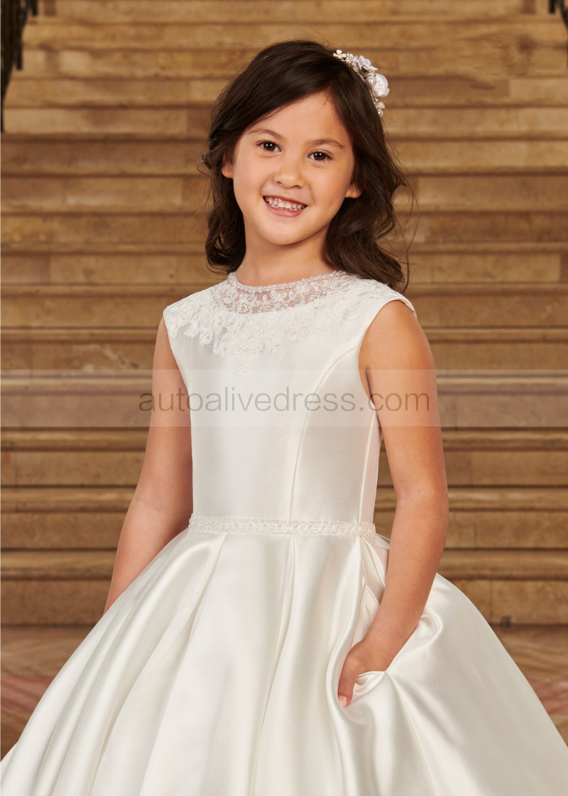 Beaded Neck Ivory Lace Box Pleated Satin Flower Girl Dress