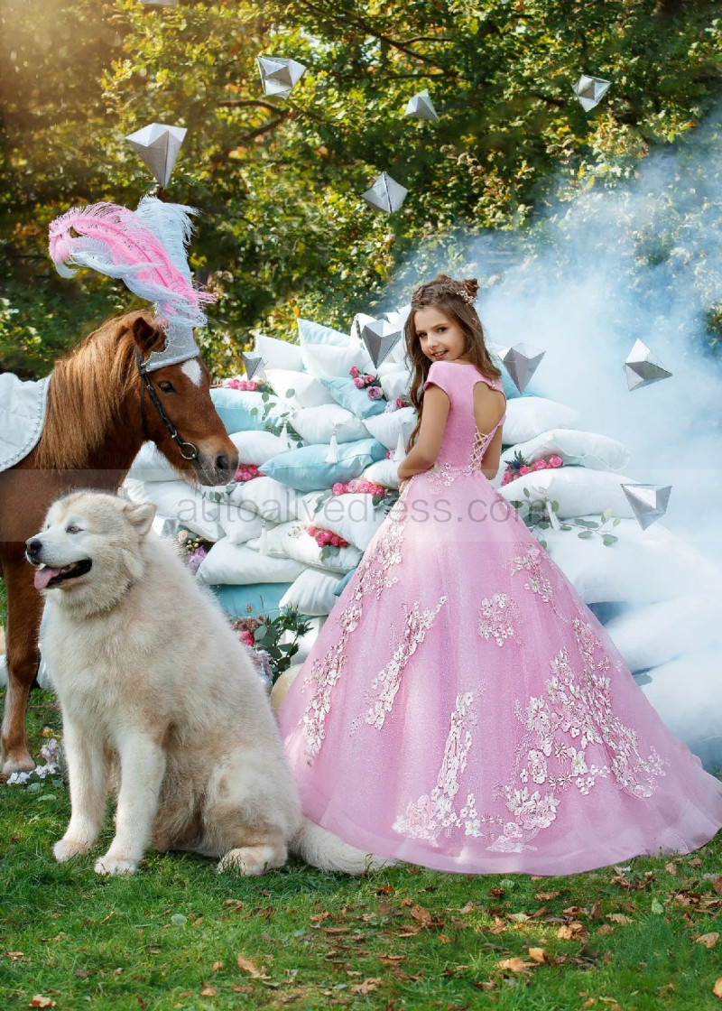 Beaded Pink Lace Floral Glitter Tulle Heart Back Flower Girl Dress