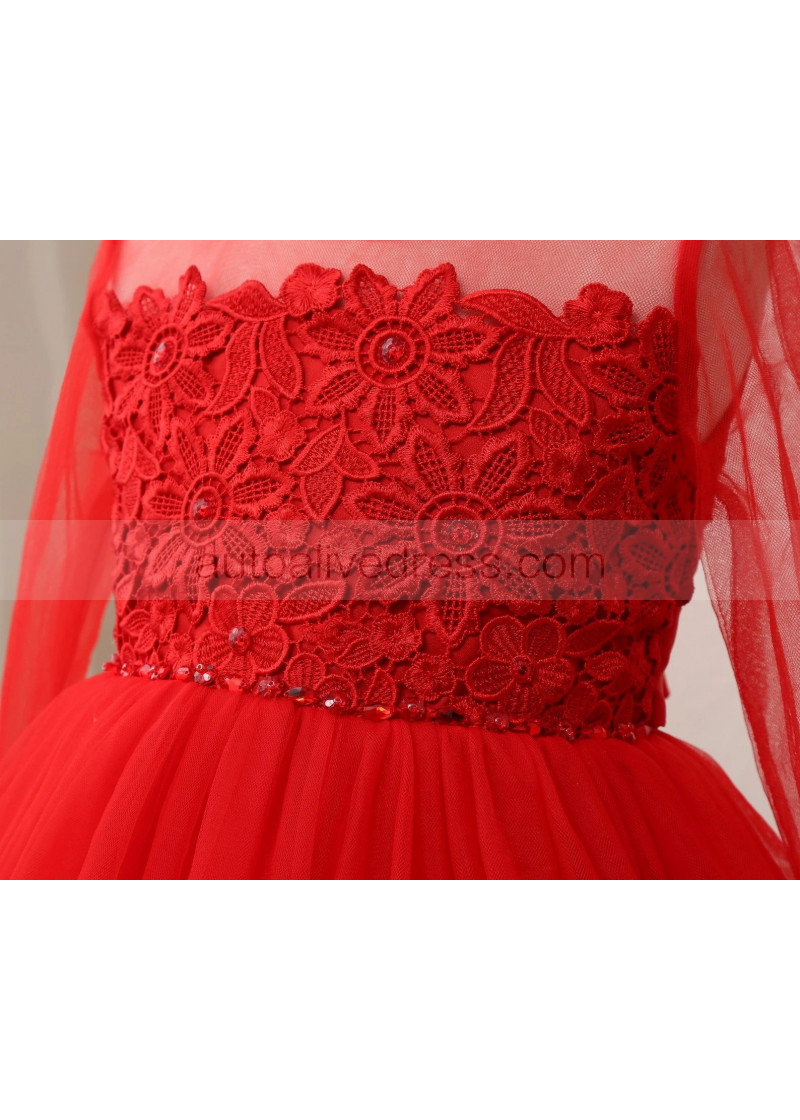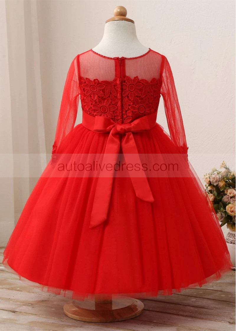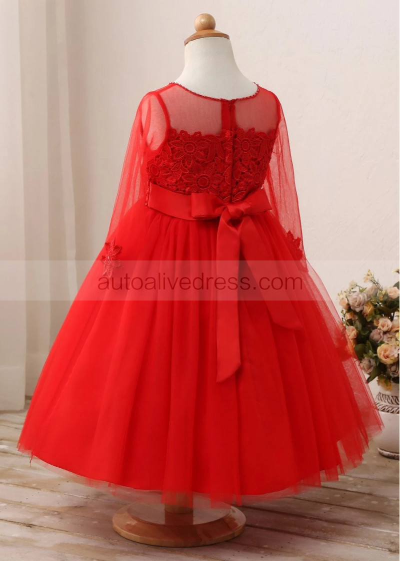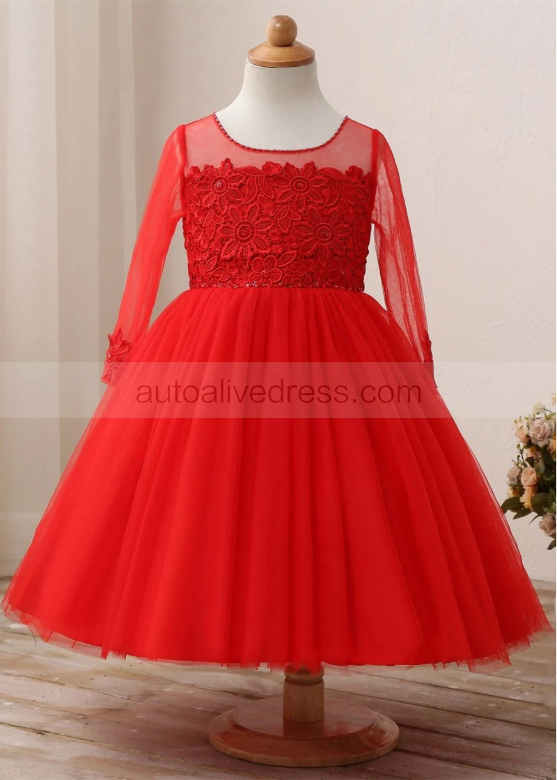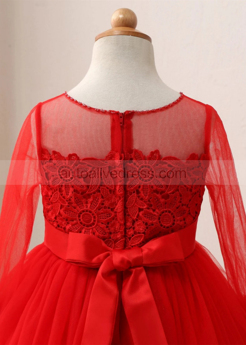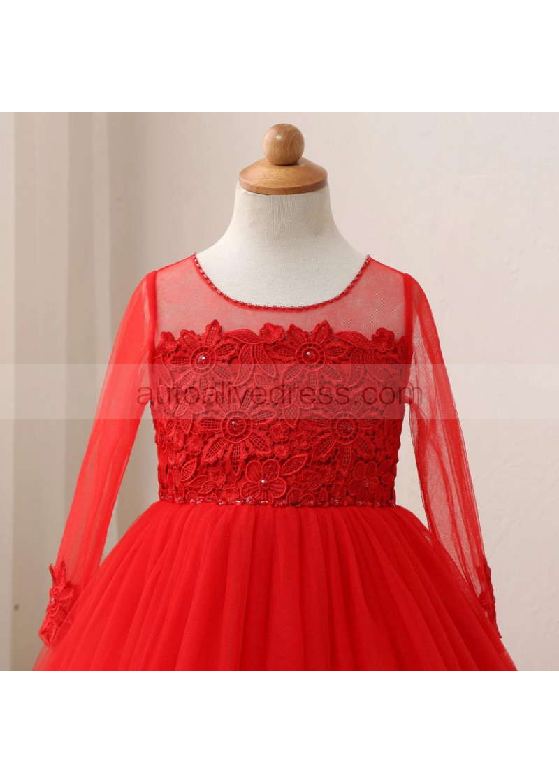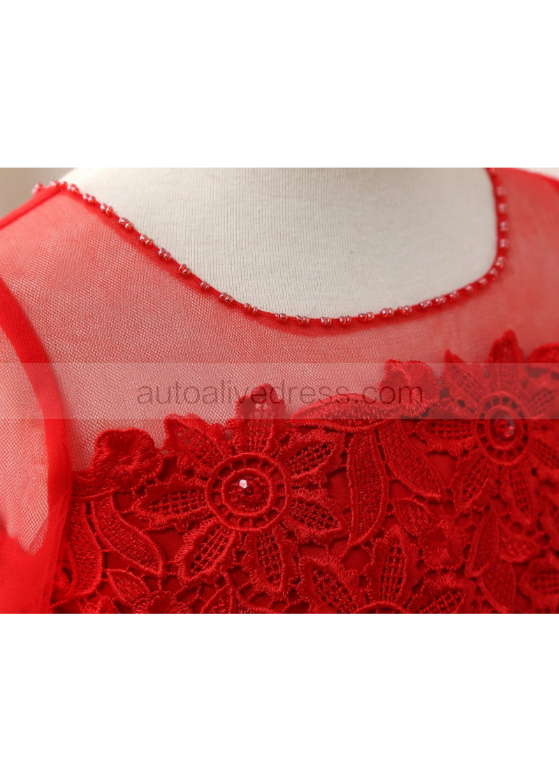 Beaded Red Lace Tulle Flower Girl Dress Birthday Party Dress