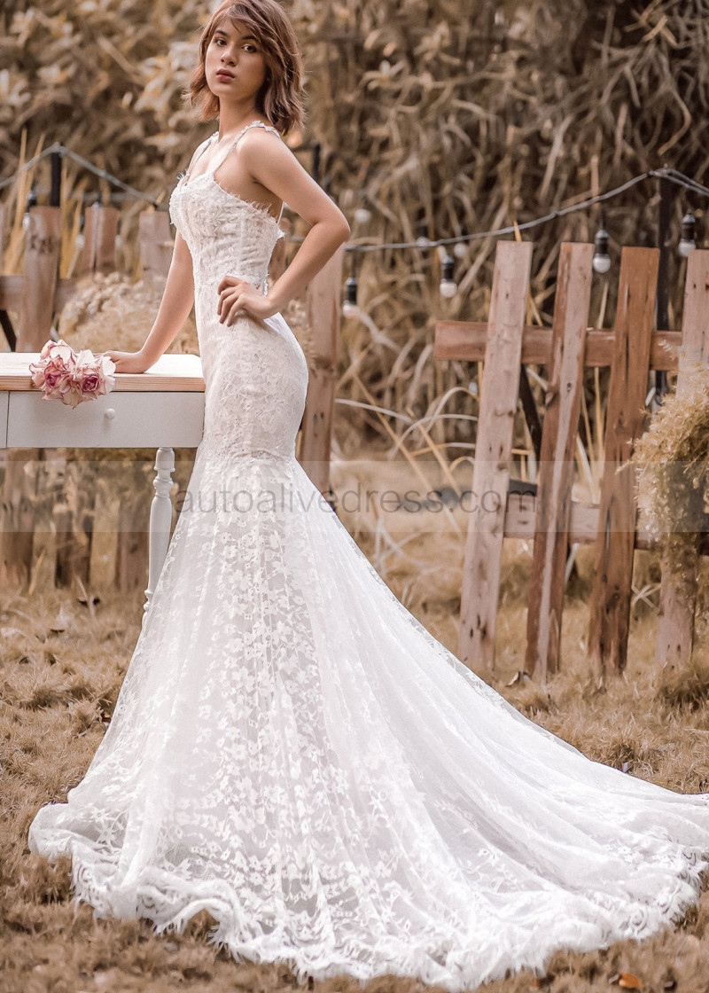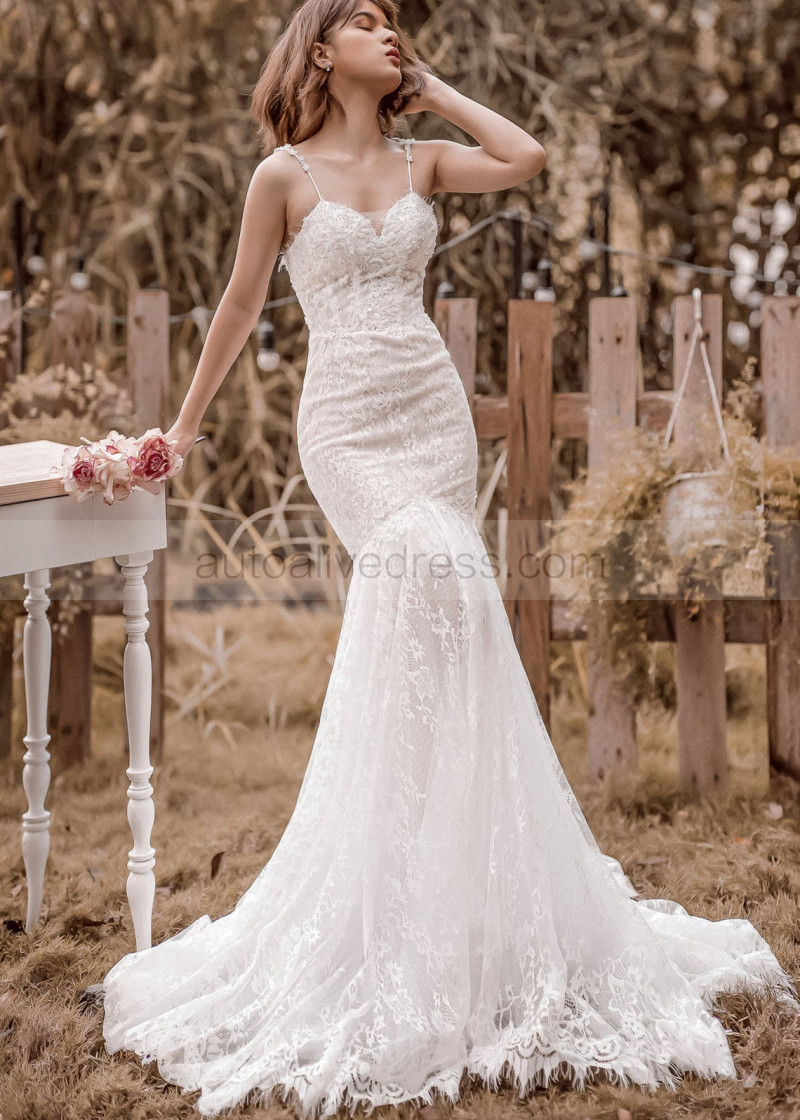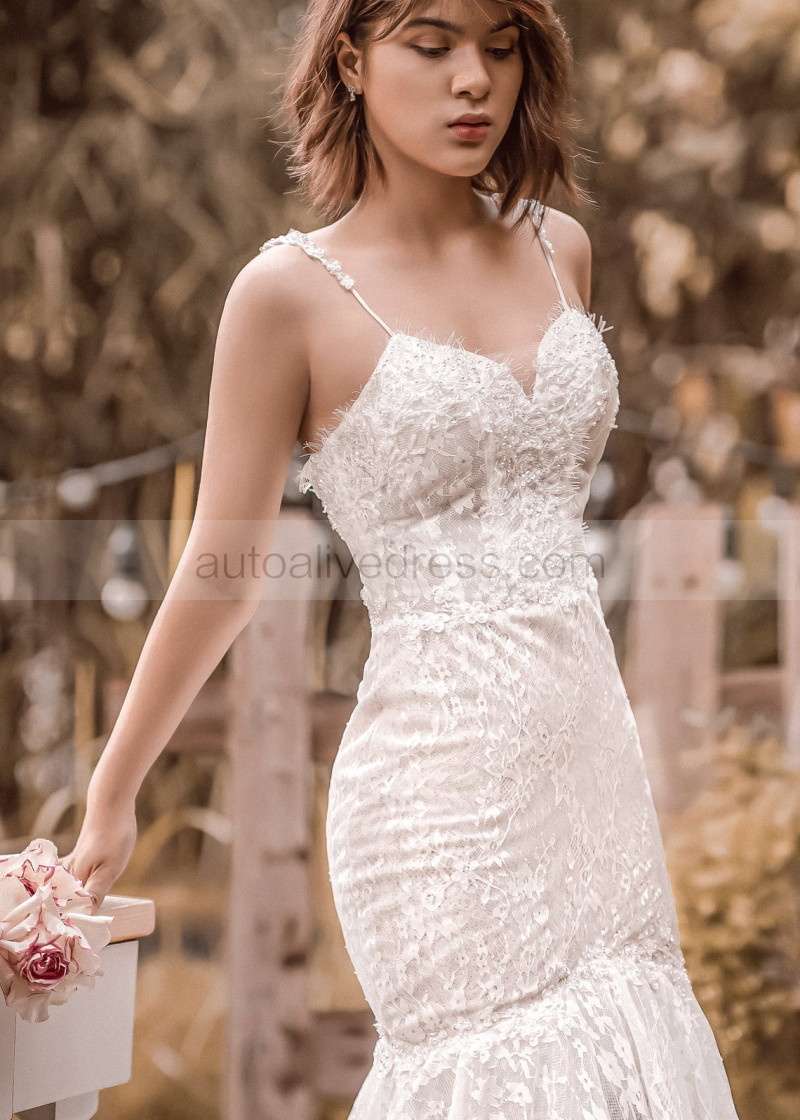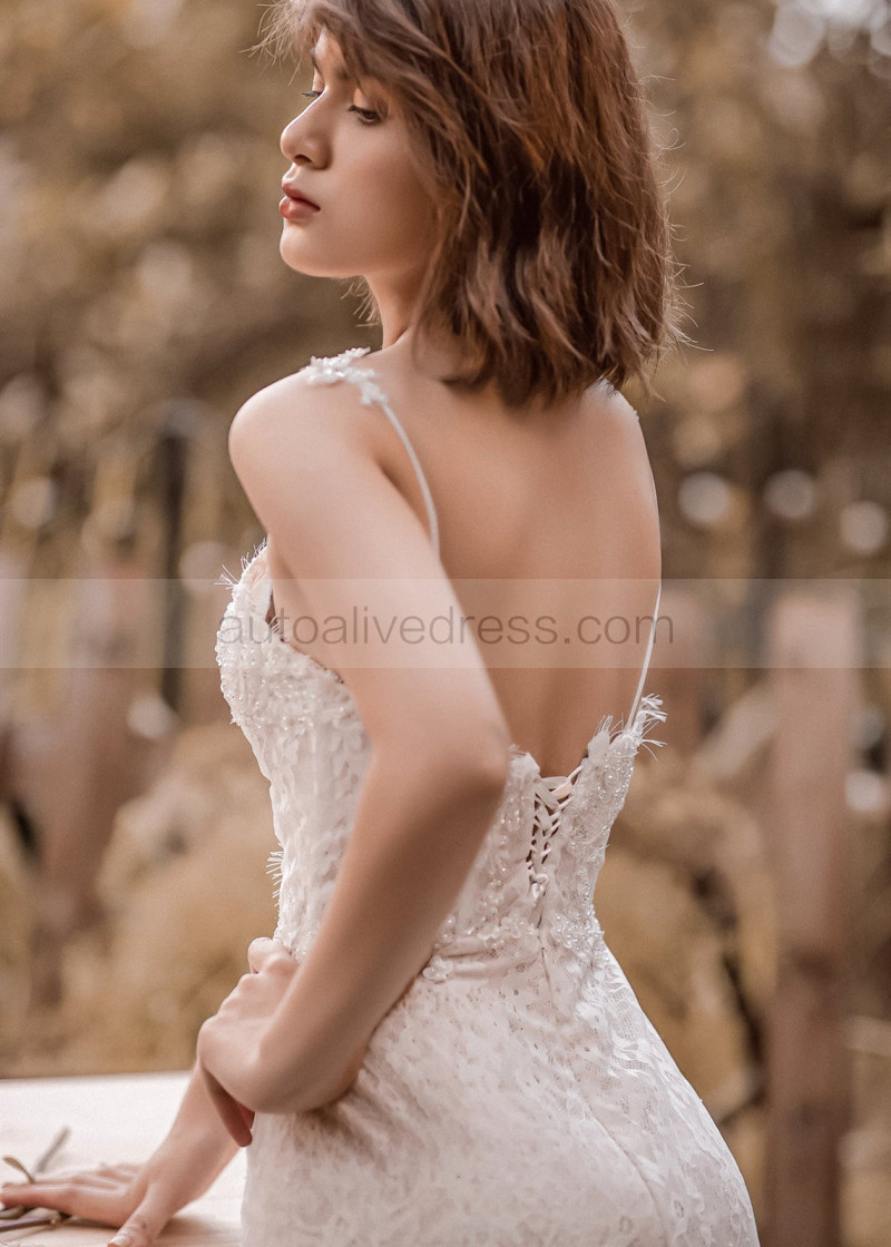 Beaded Spaghetti Straps Ivory Lace Elegant Wedding Dress