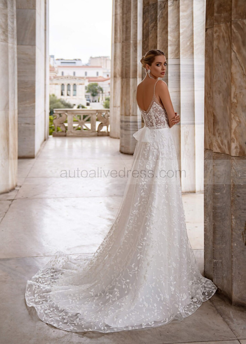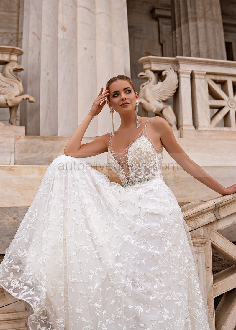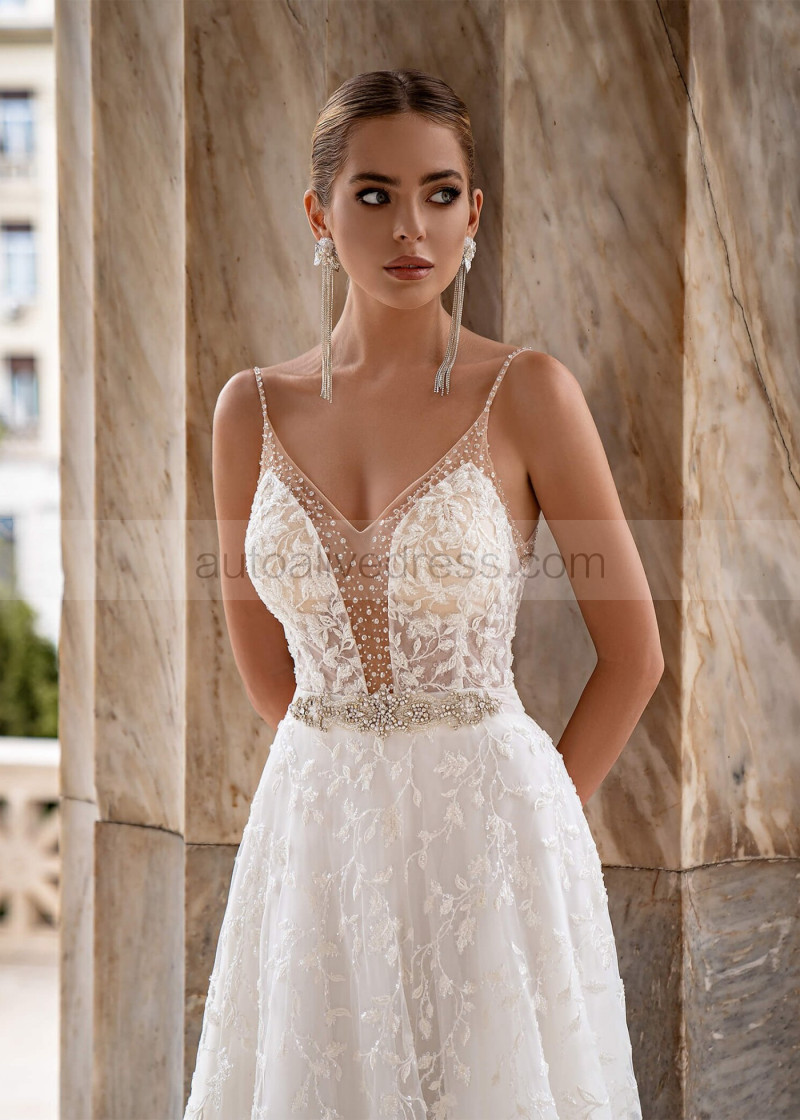 Beaded V Neck Ivory Lace Tulle Glitter Wedding Dress