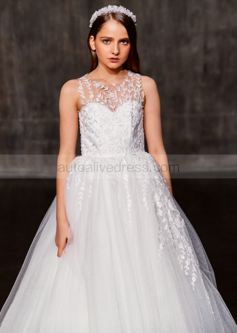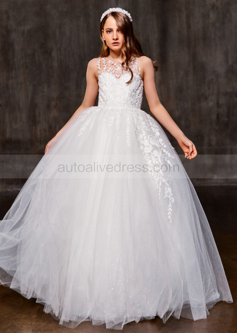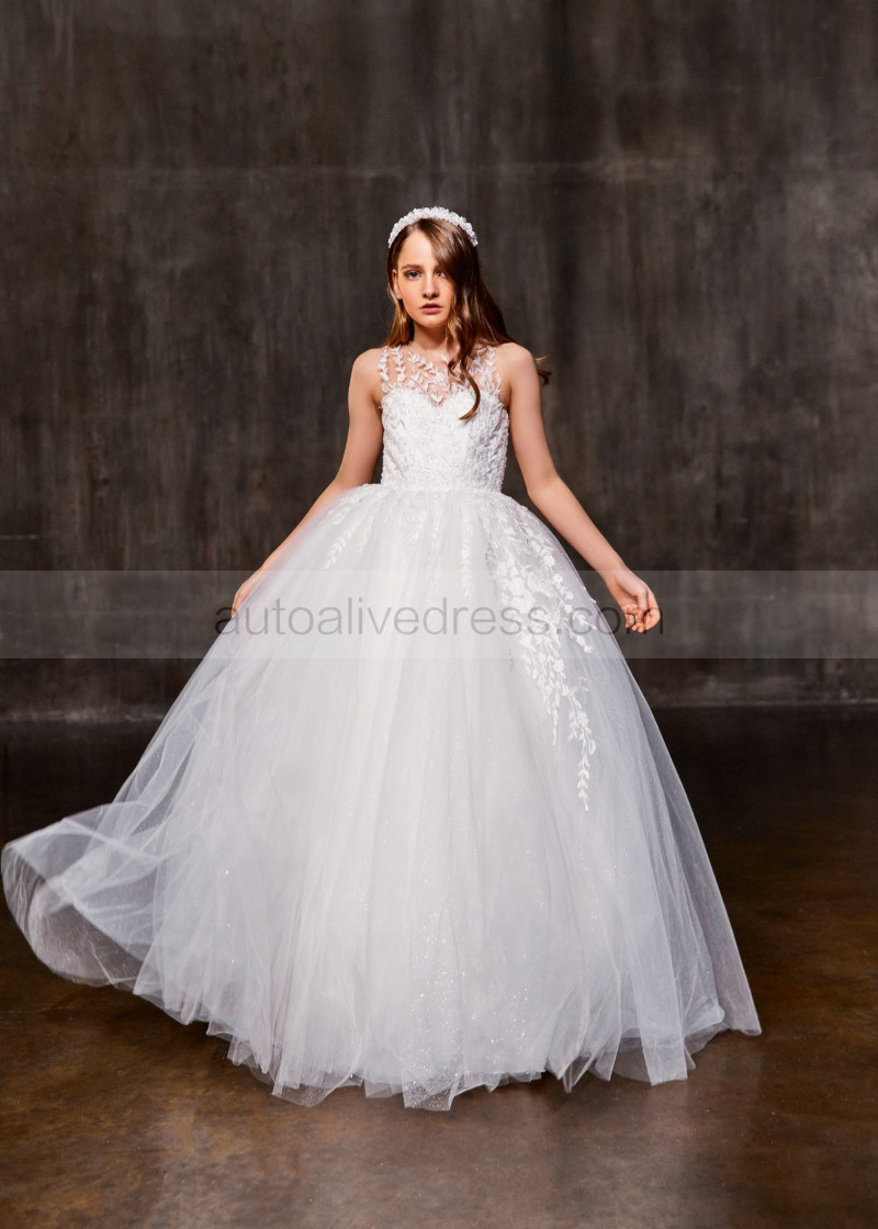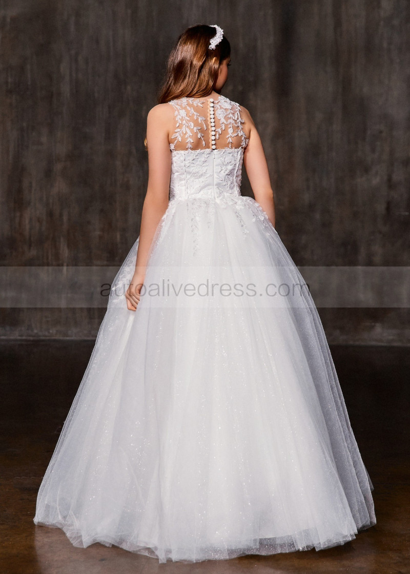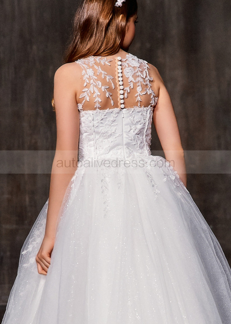 Beaded White Lace Glitter Tulle Latest Flower Girl Dress