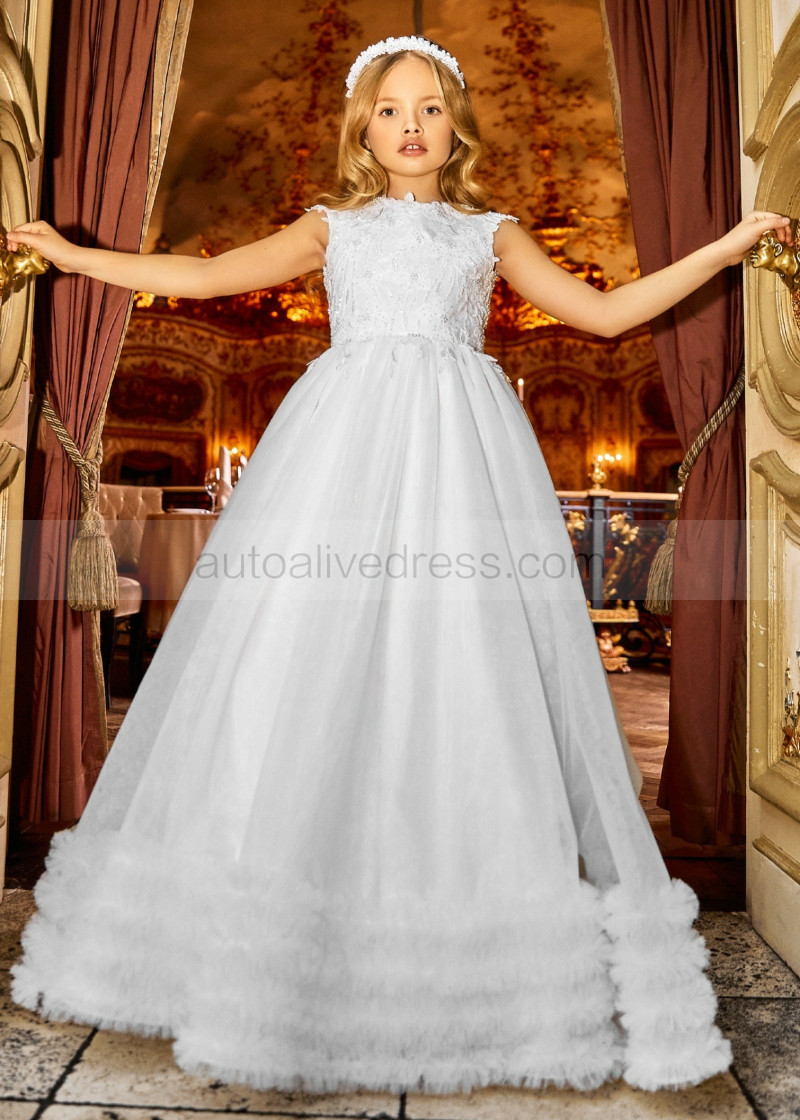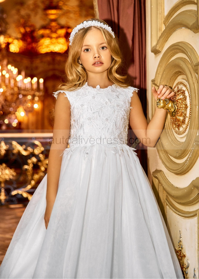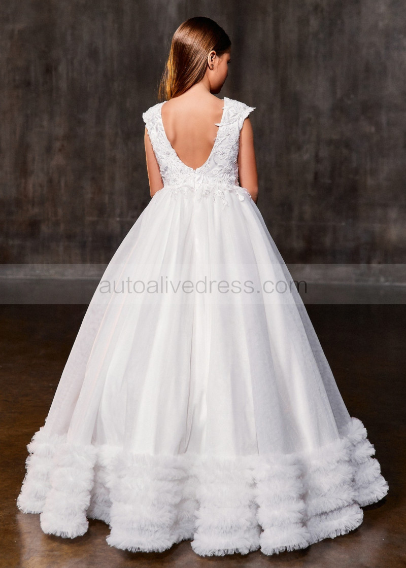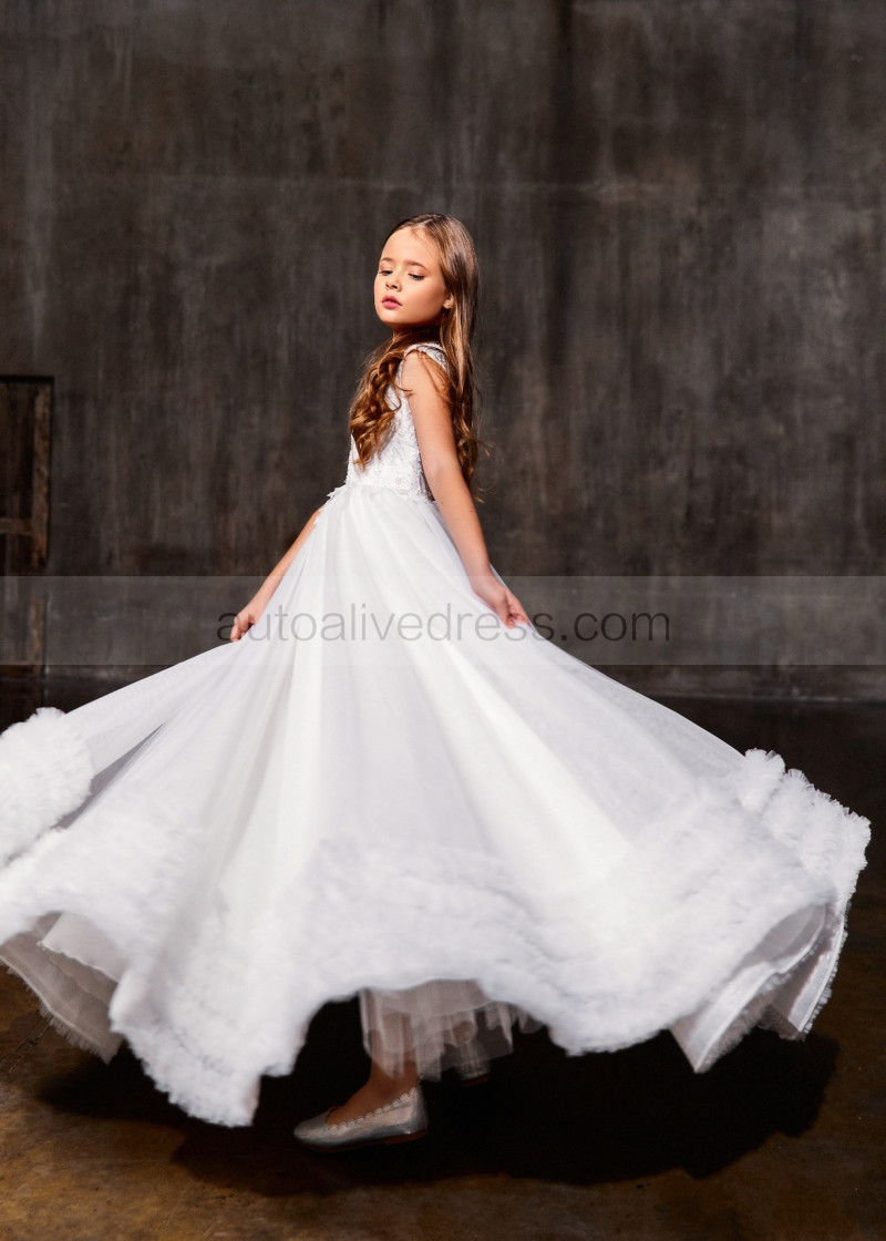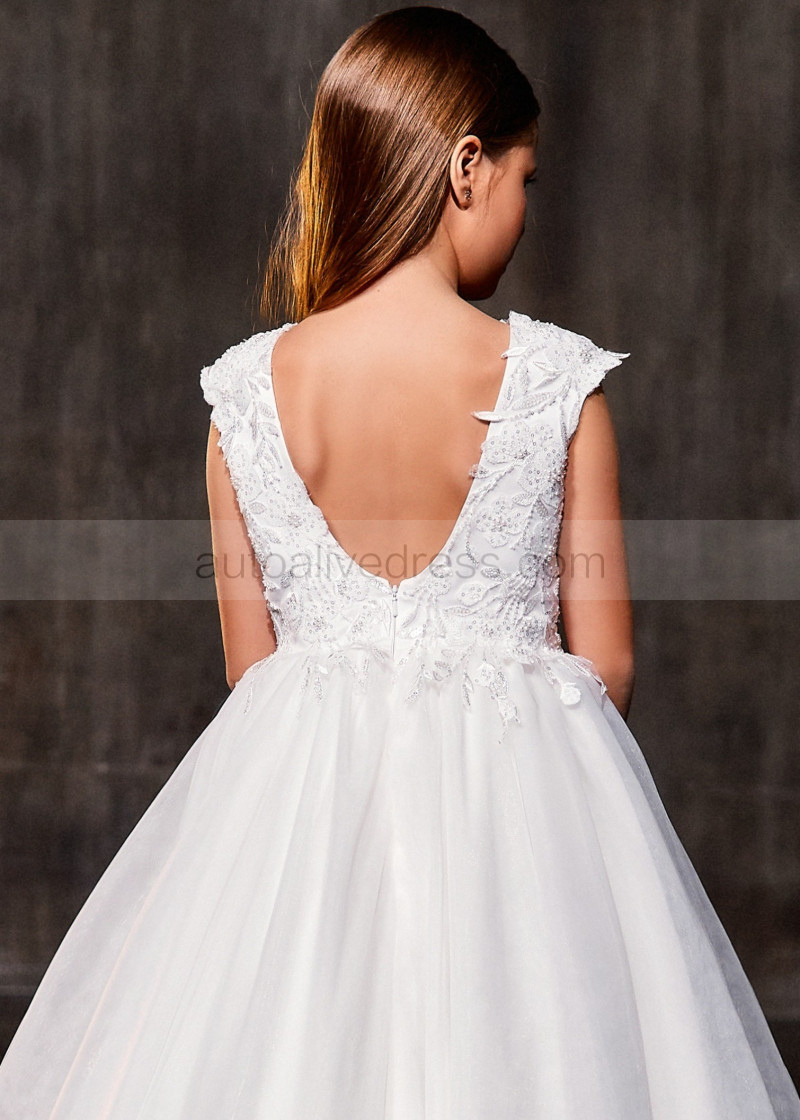 Beaded White Lace Organza V Back Chic Flower Girl Dress