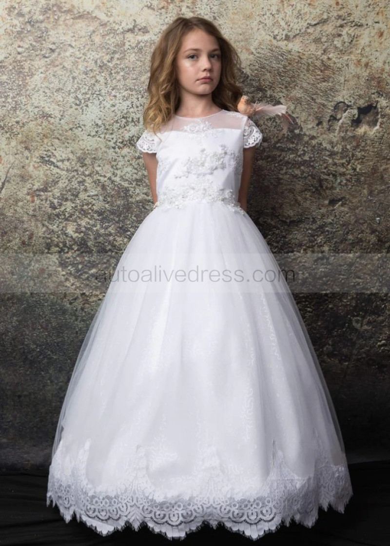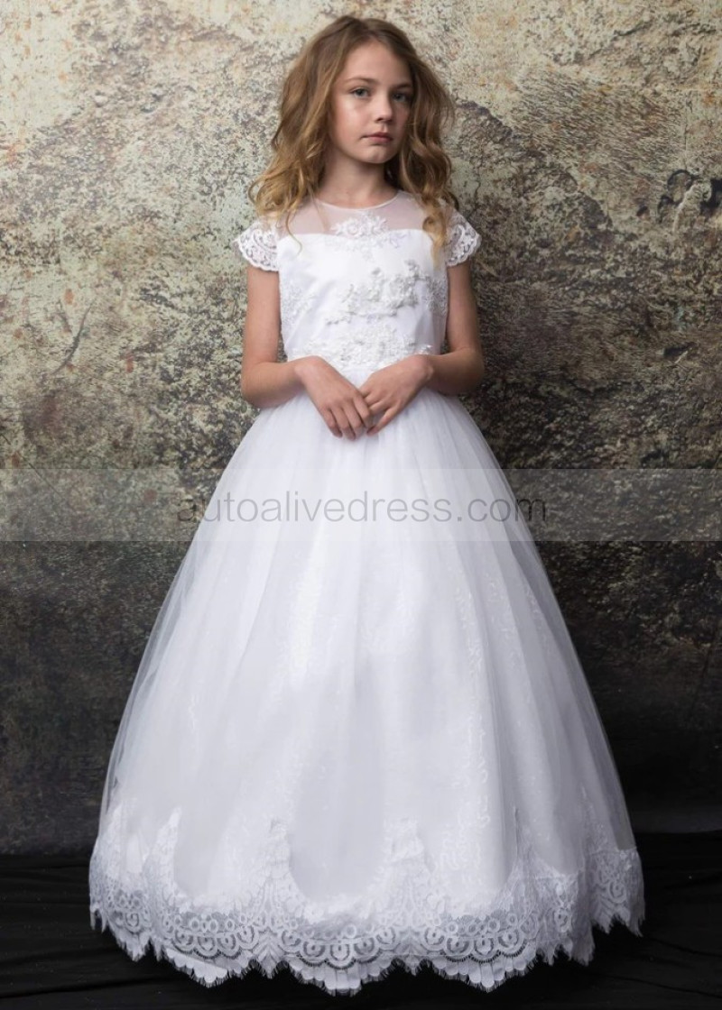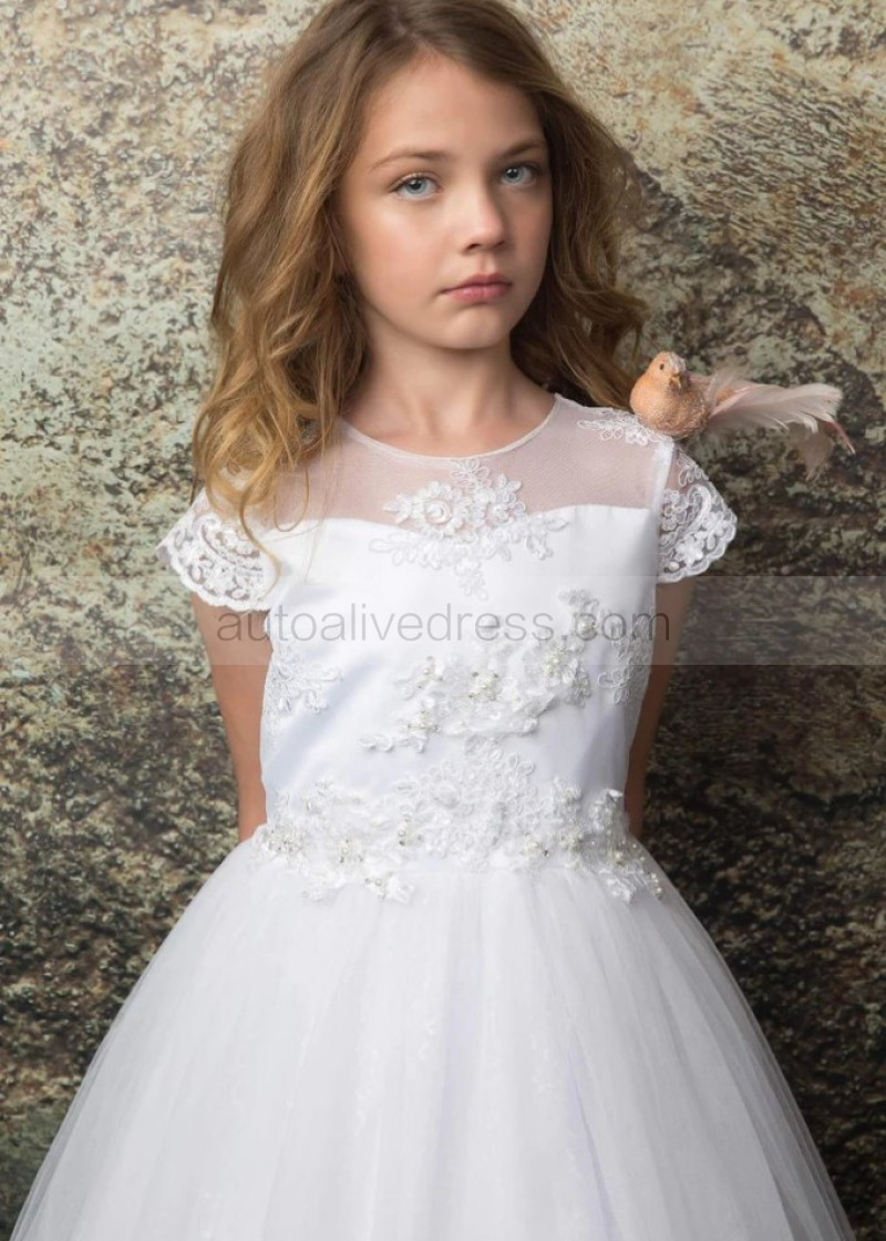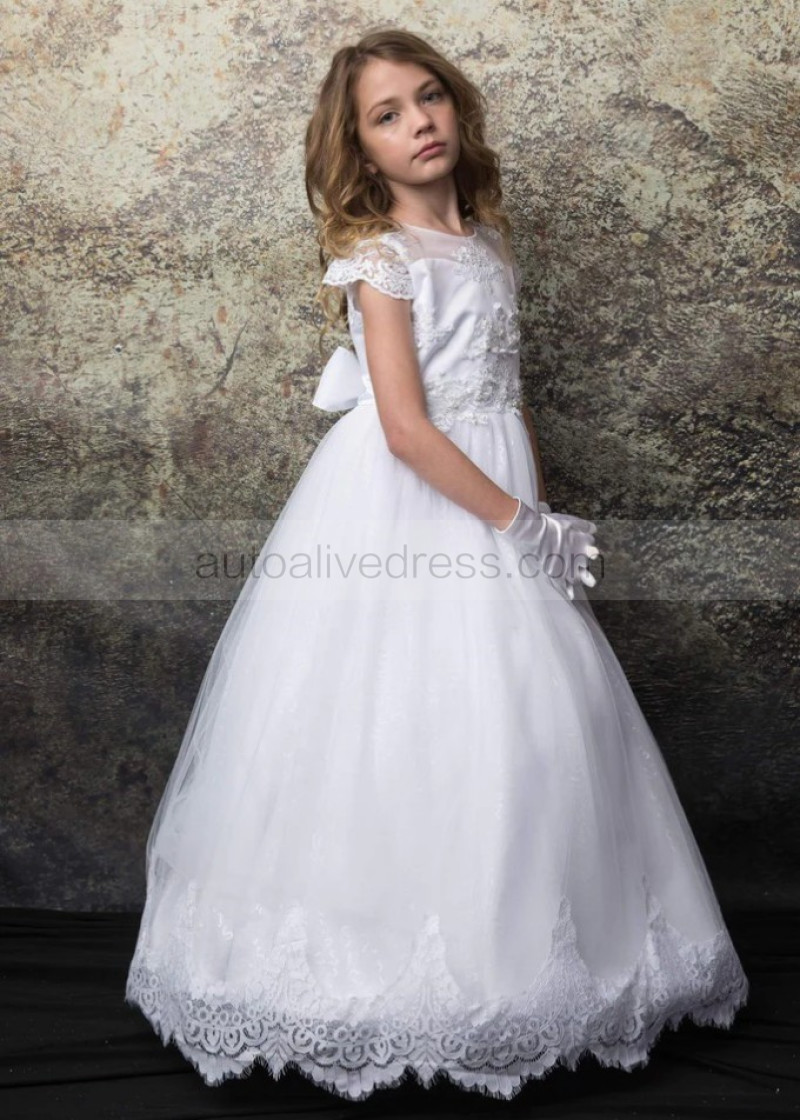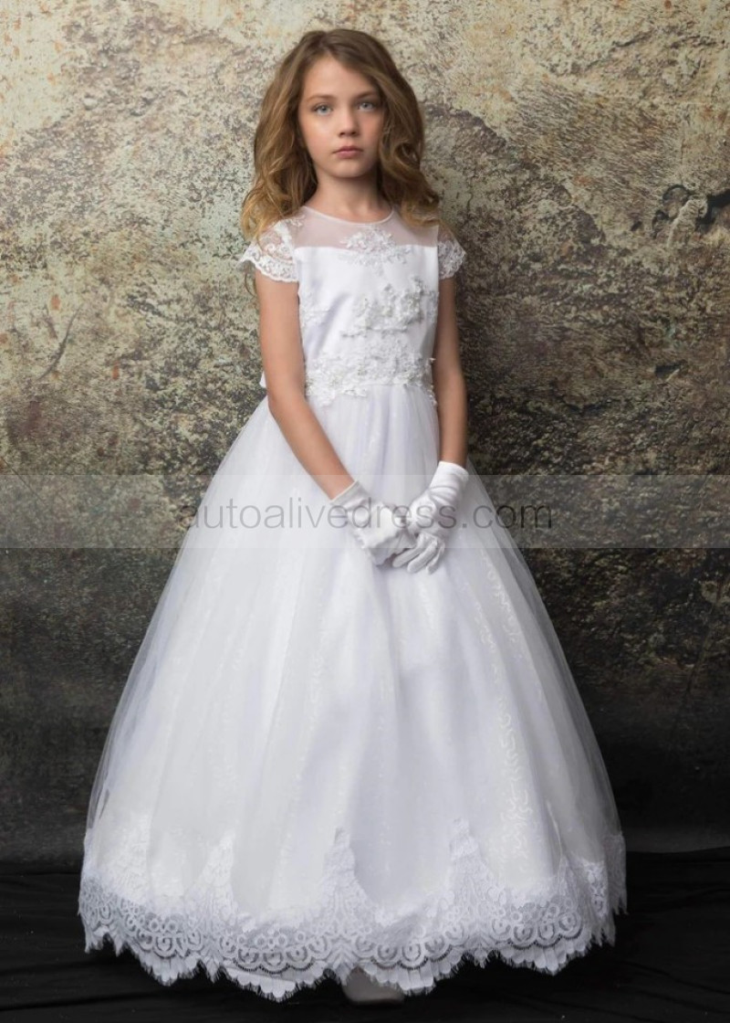 Beaded White Lace Tulle Flower Girl Dress With Scalloped Edge