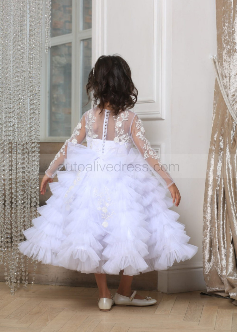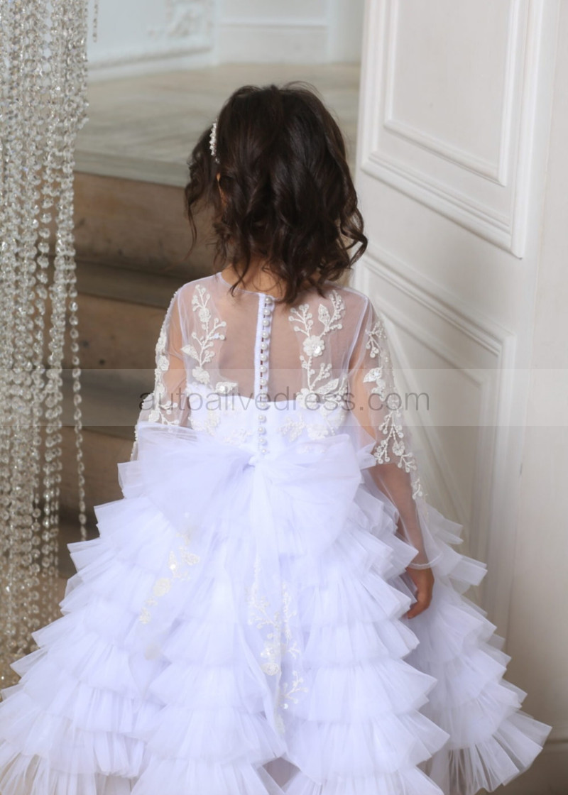 Beaded White Lace Tulle Ruffled Flower Girl Dress