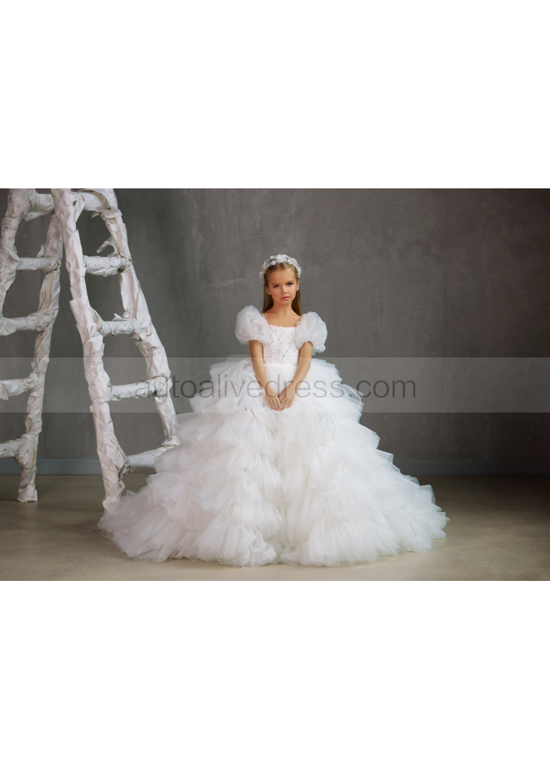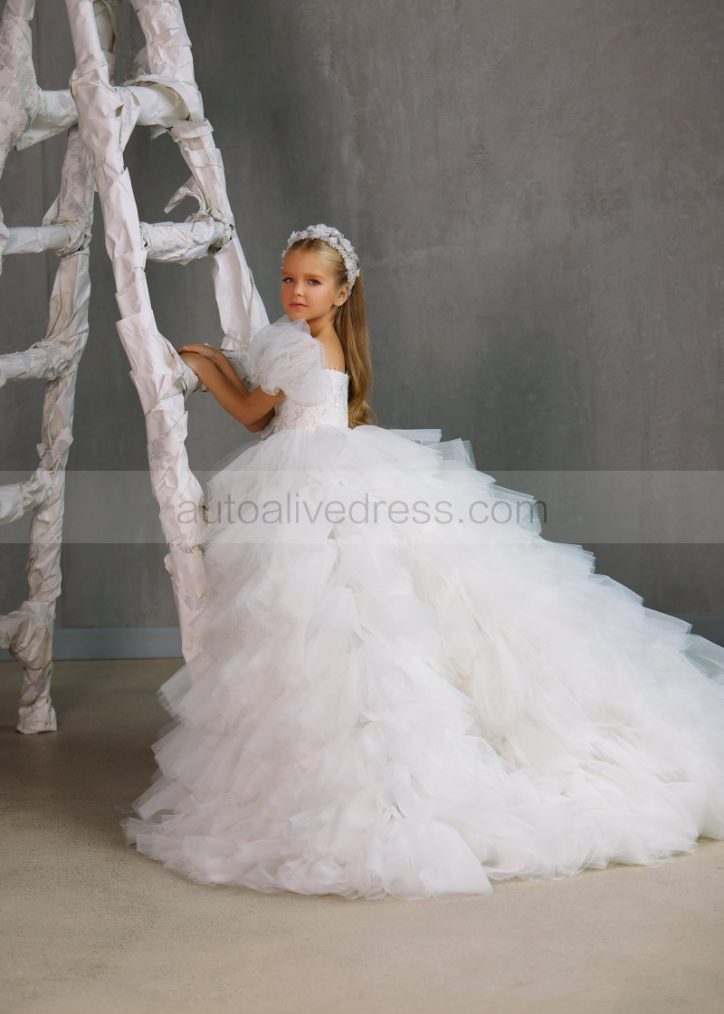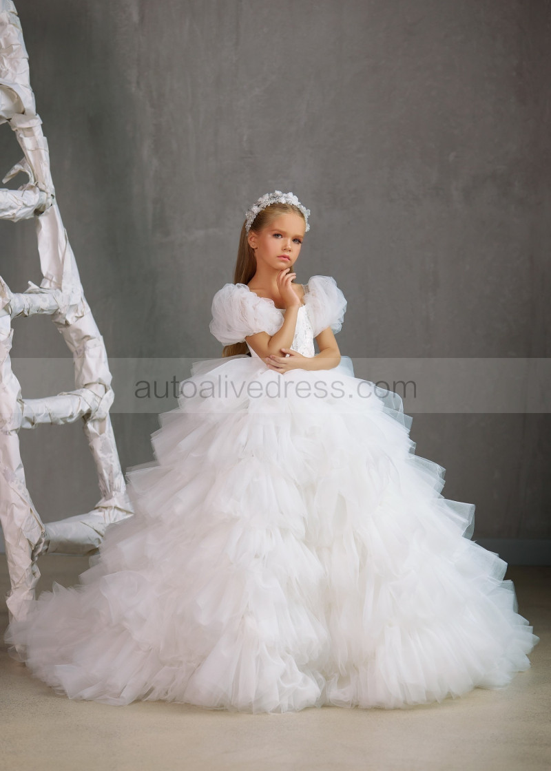 Beaded White Sequined Lace Tulle Ruffled Flower Girl Dress