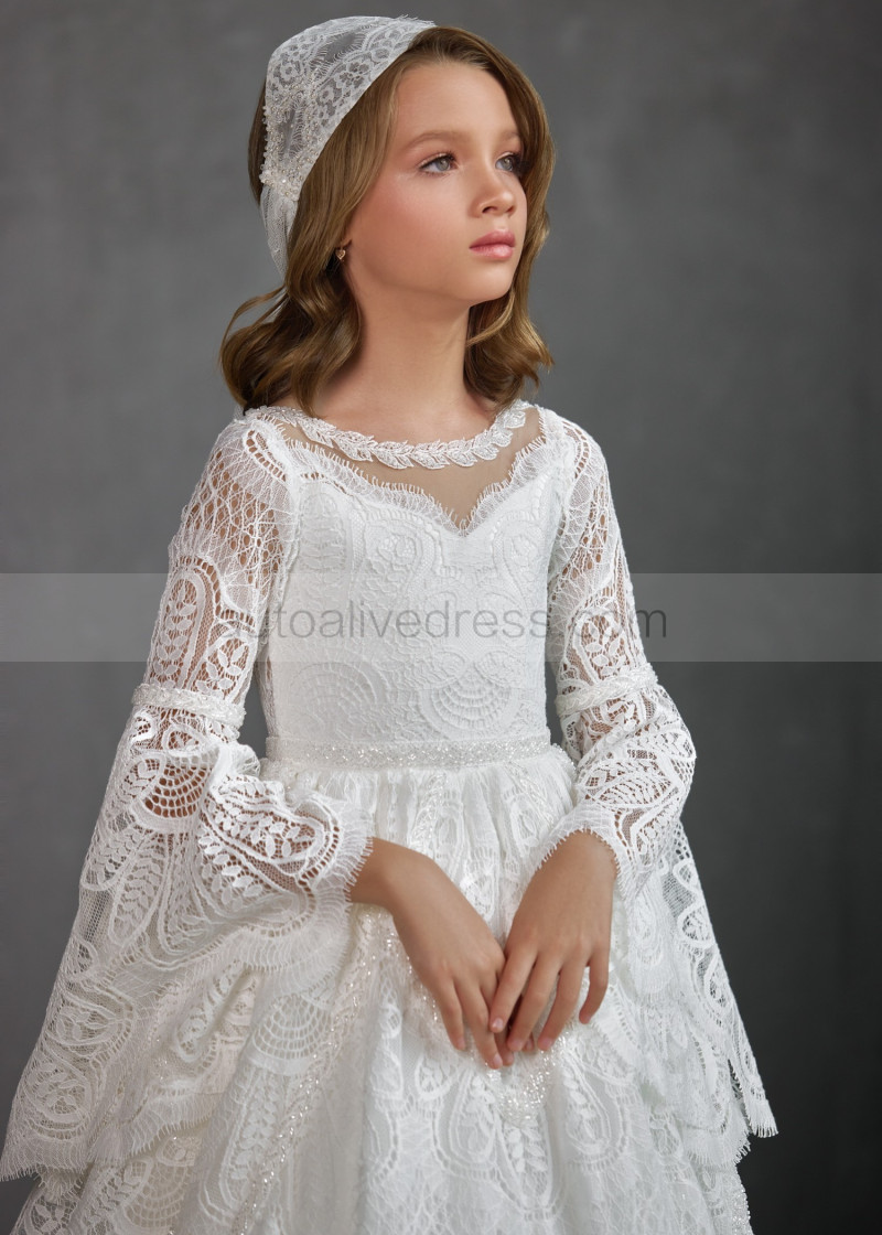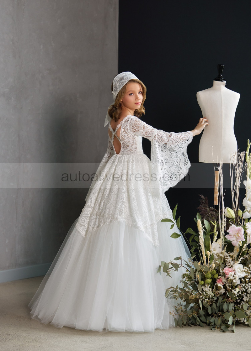 Bell Sleeves Beaded Ivory Eyelash Lace Tulle Flower Girl Dress