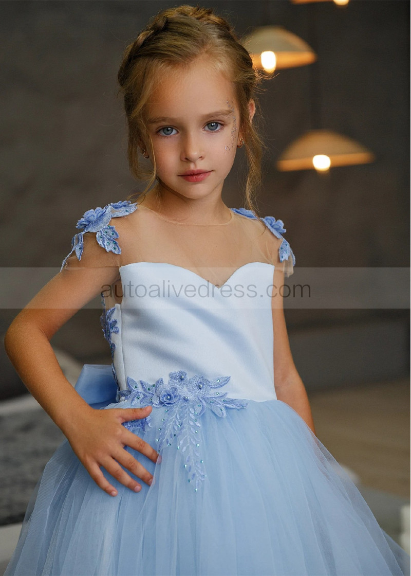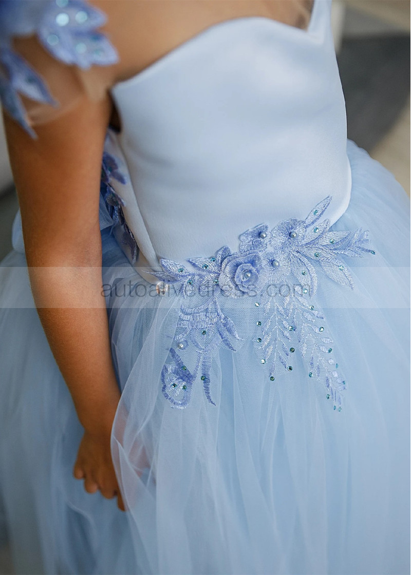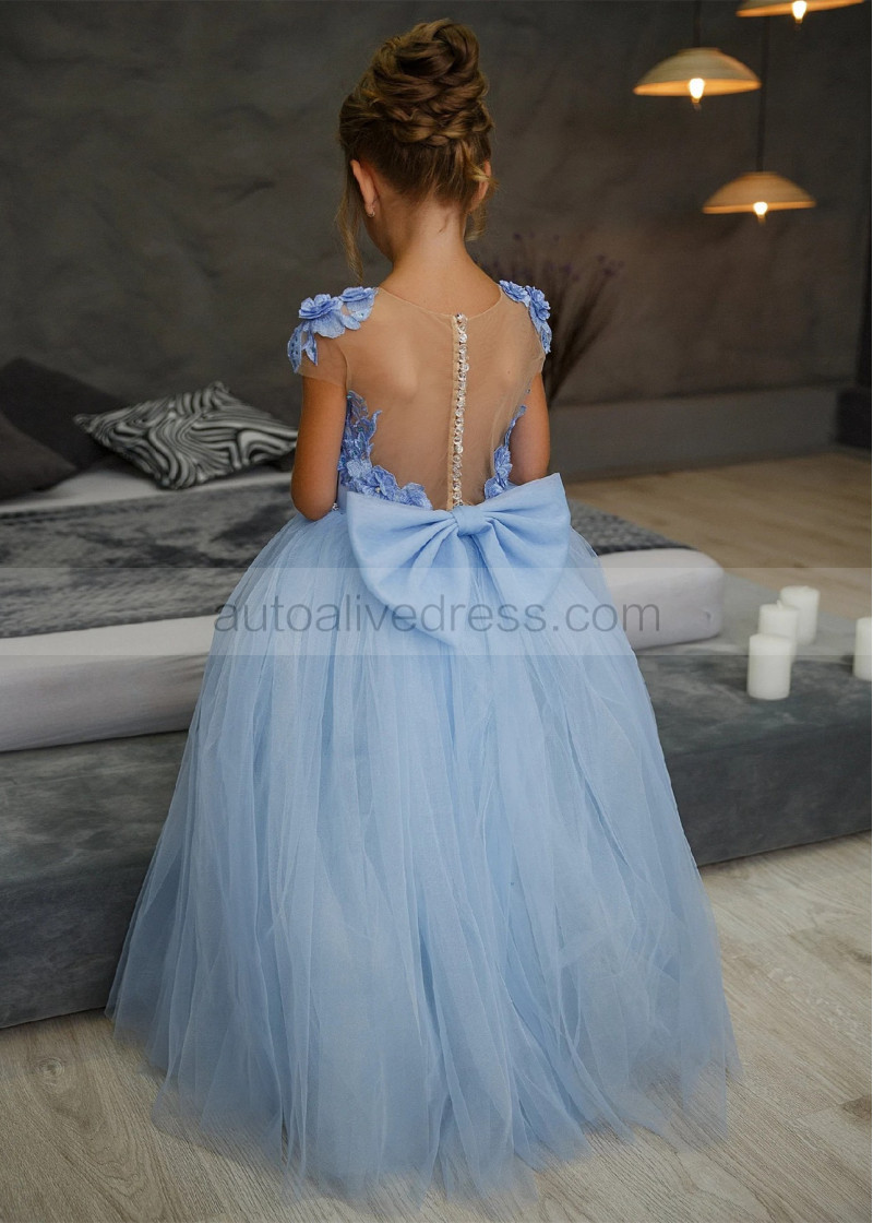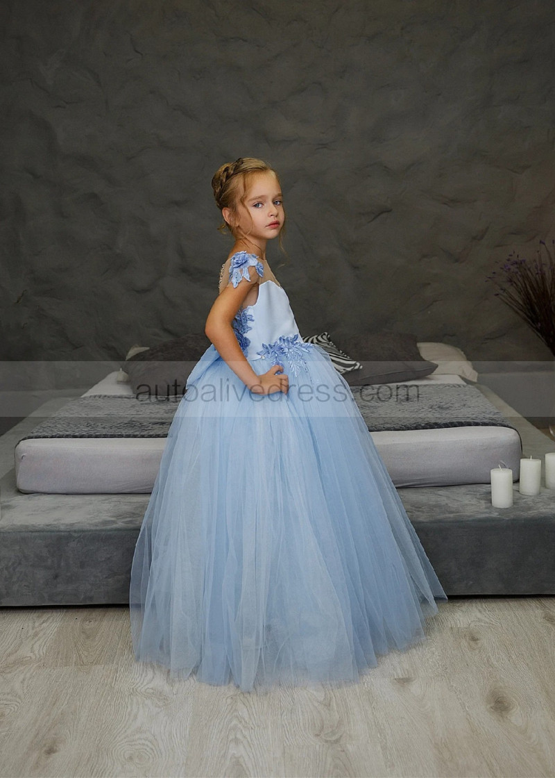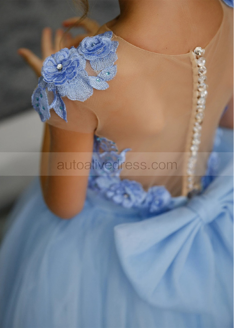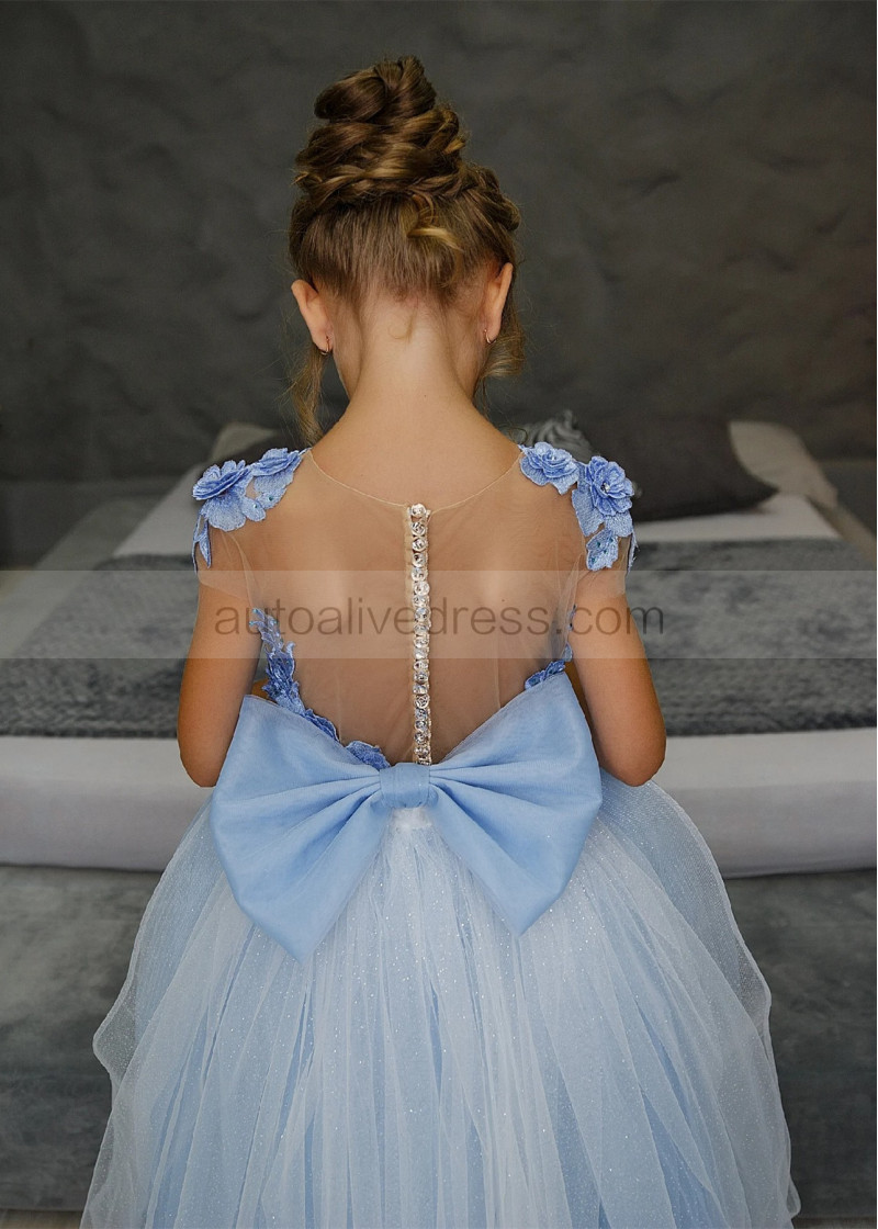 Blue Beaded 3D Flowers Tulle Flower Girl Dress With Glitter Train