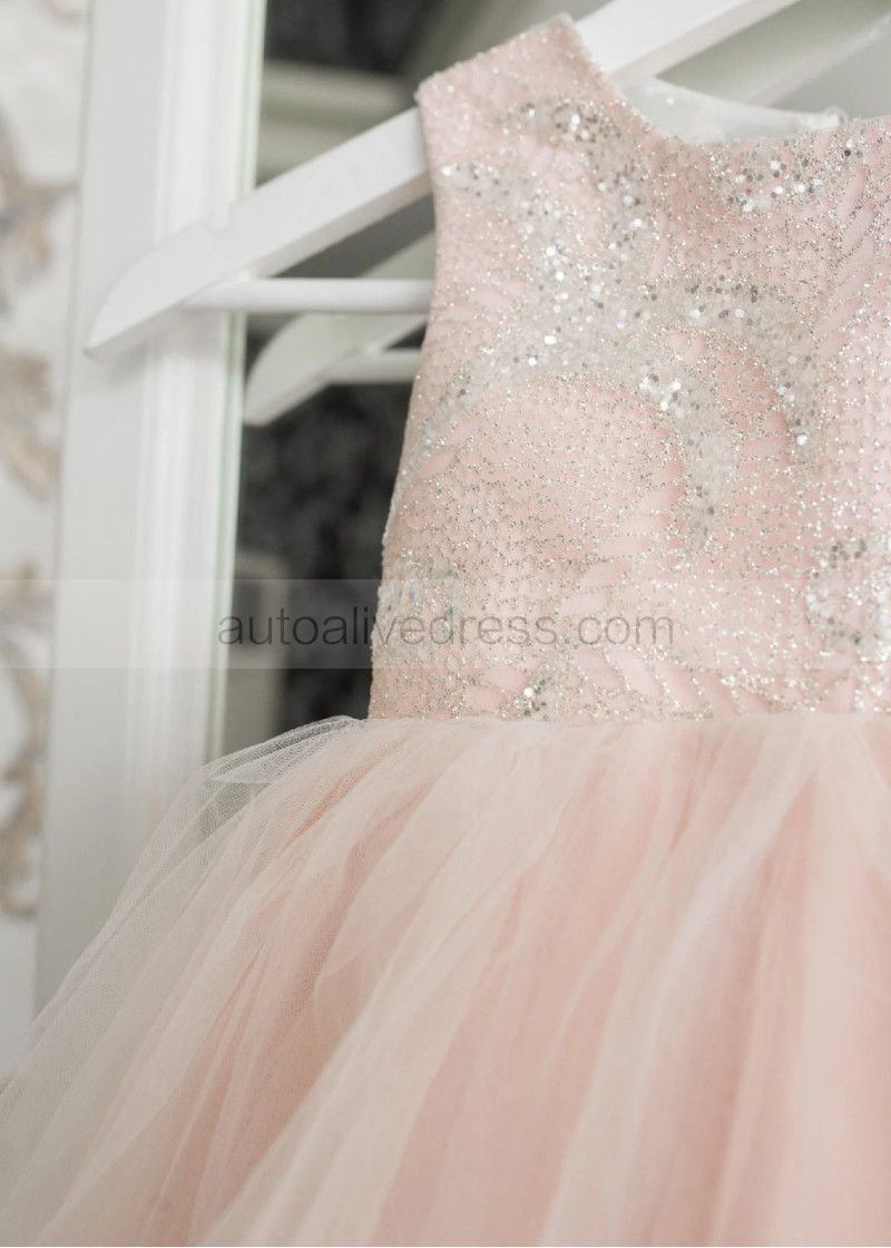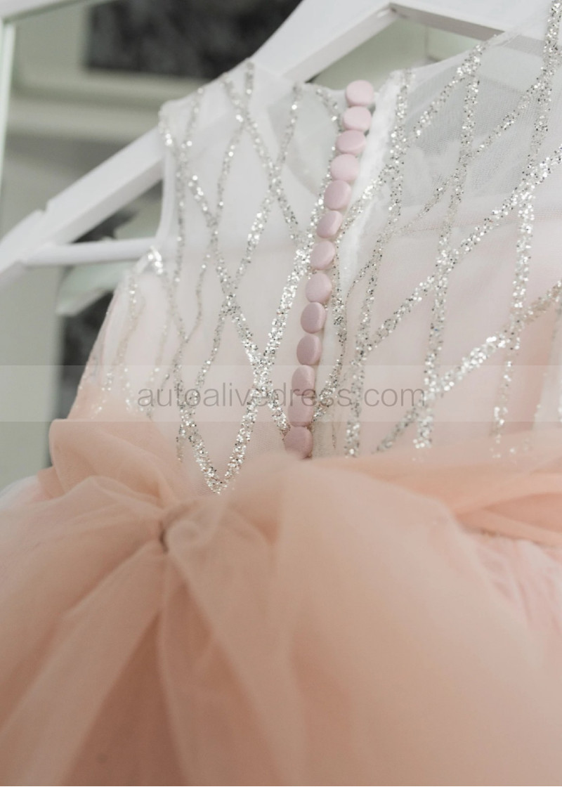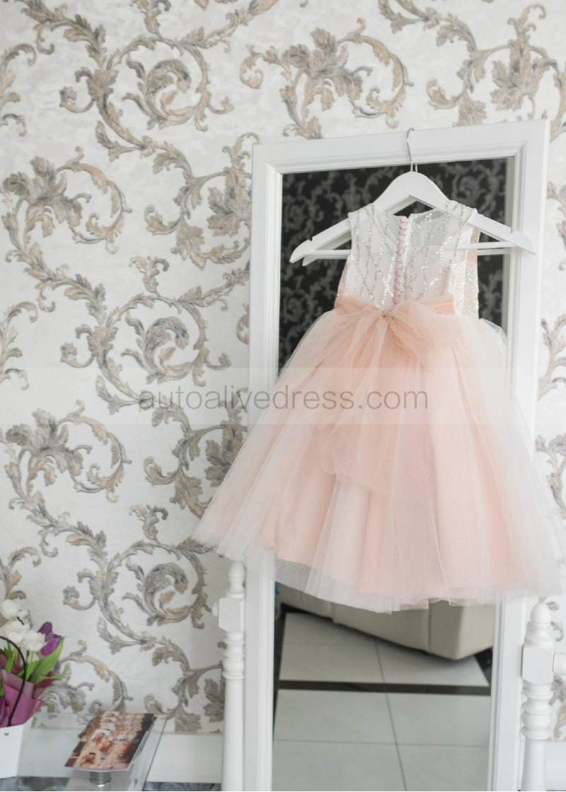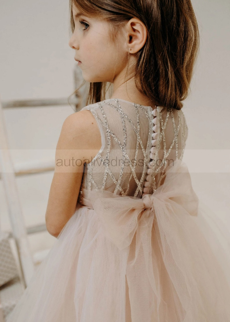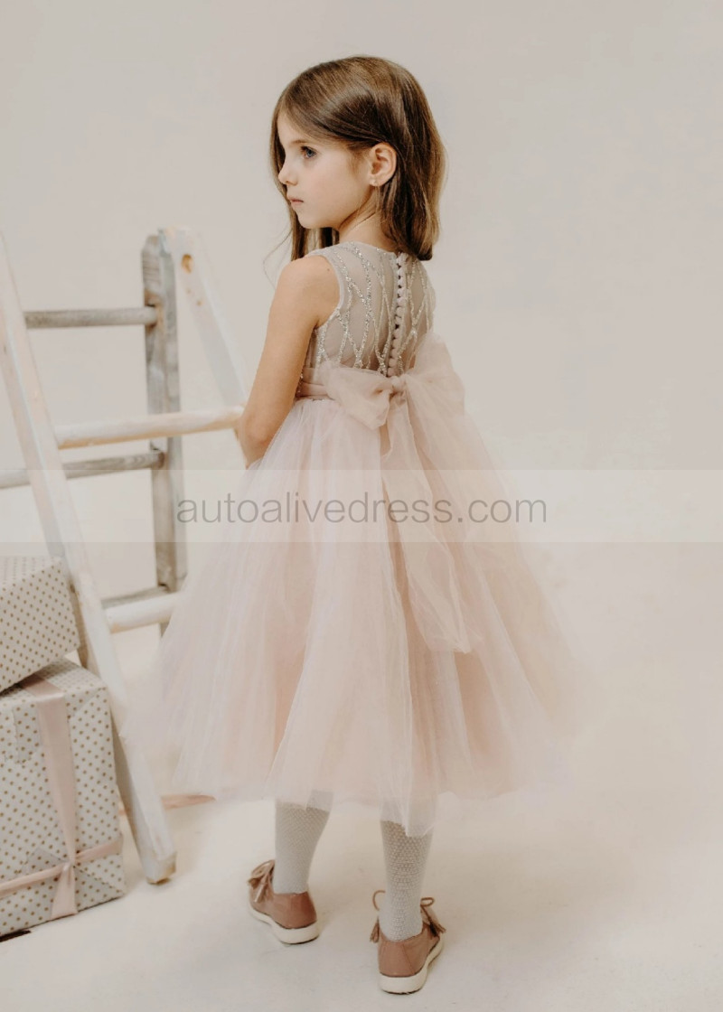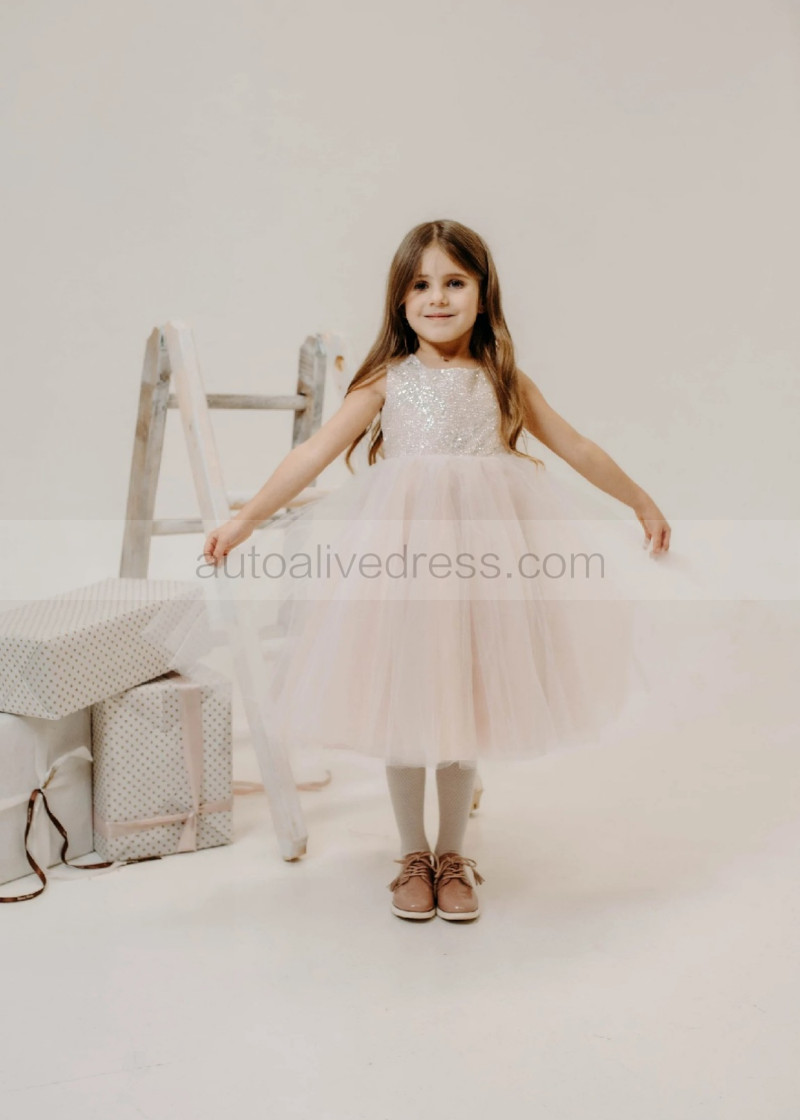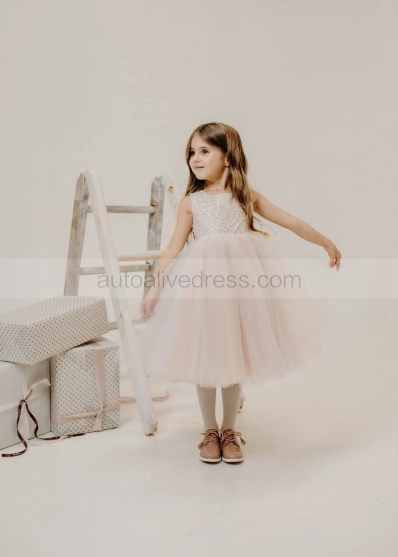 Blush Pink Glitter Lace Tulle Tea Length Flower Girl Dress