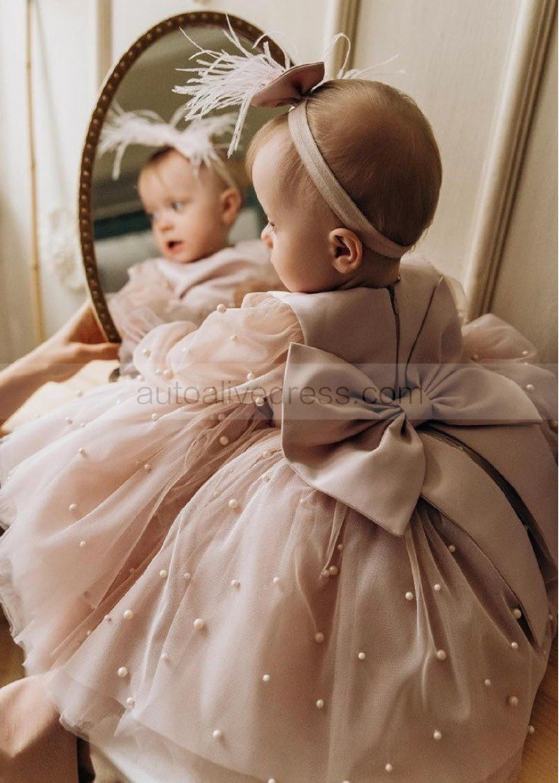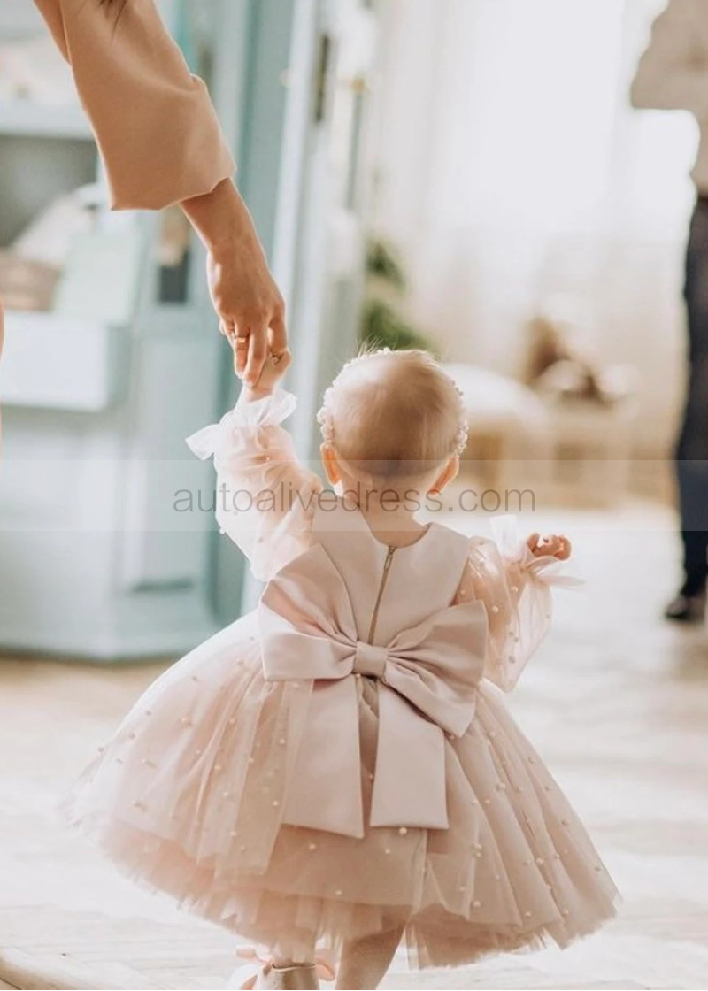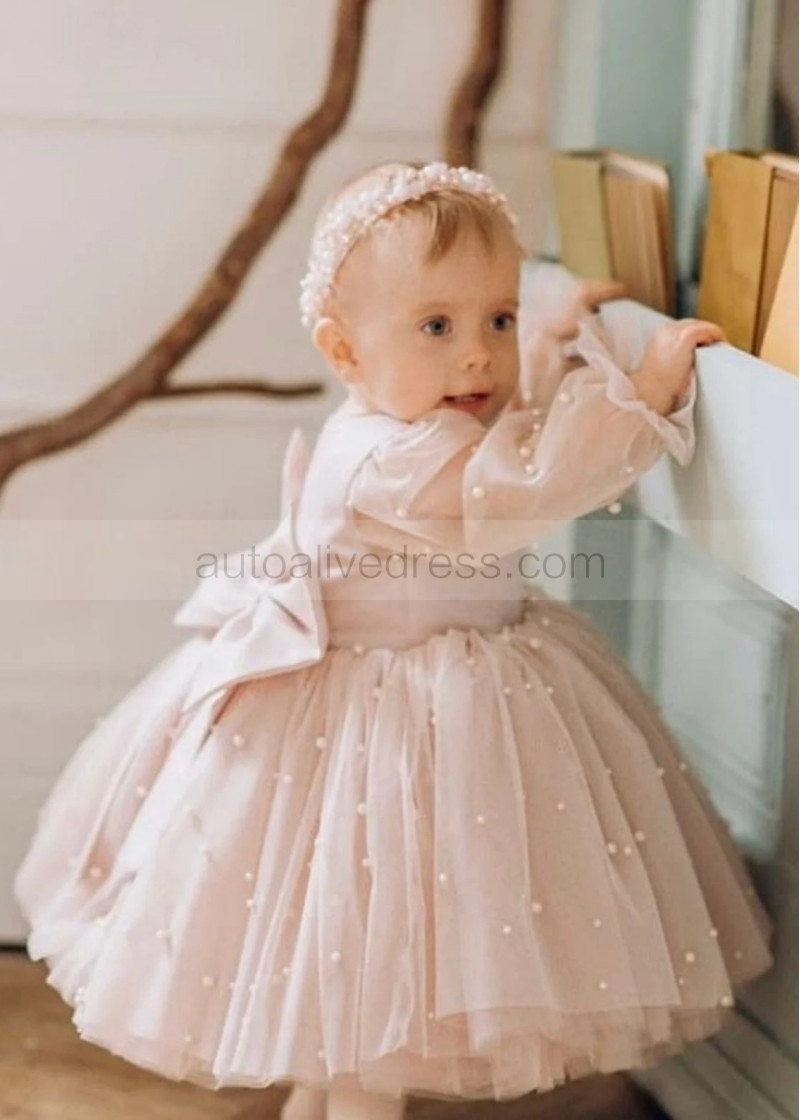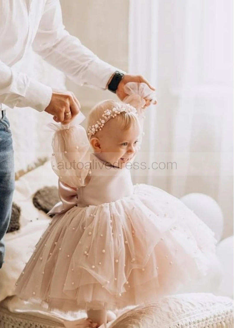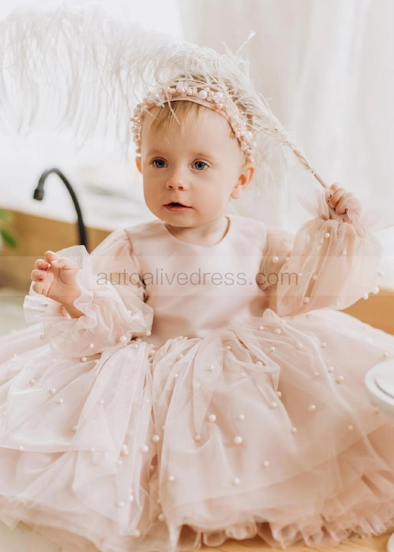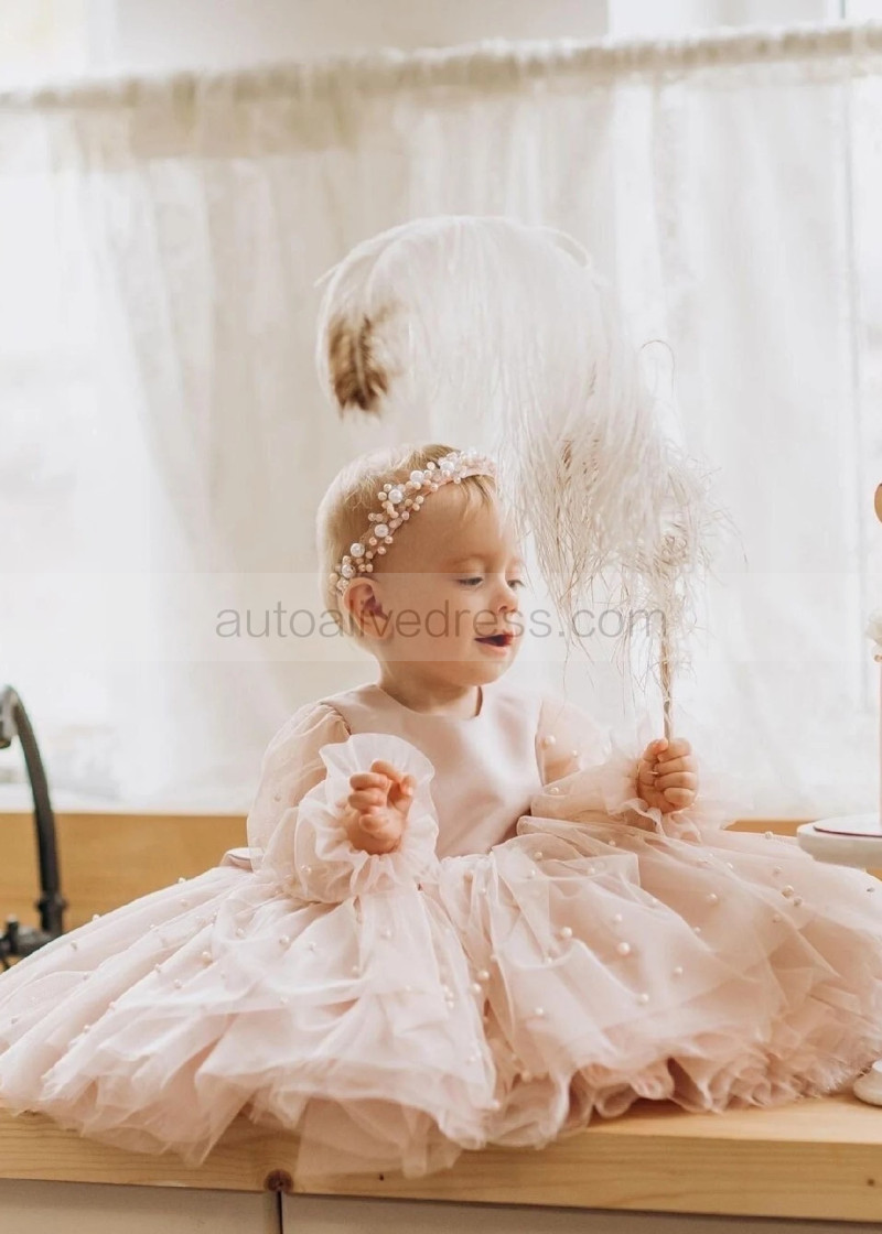 Blush Pink Pearl Embellished Tulle Flower Girl Dress Baby Girl Dress