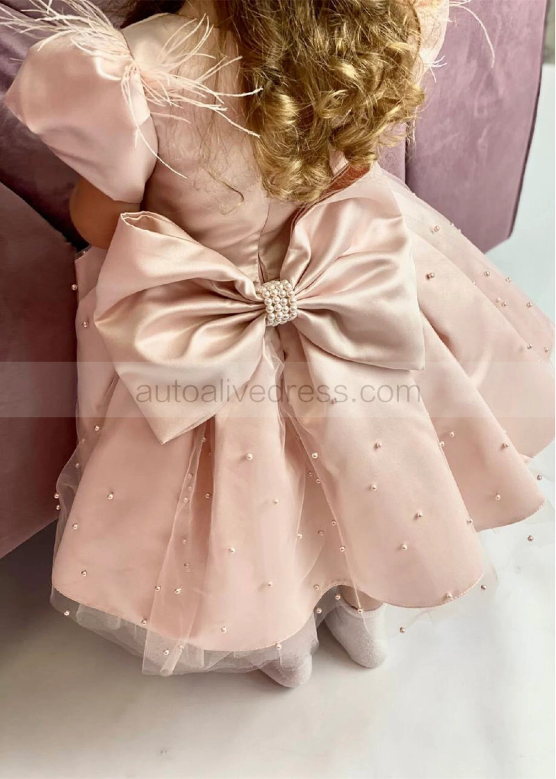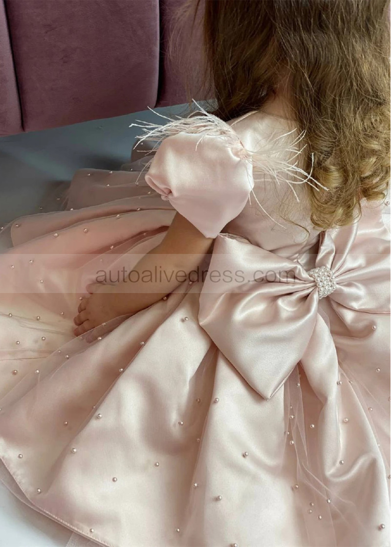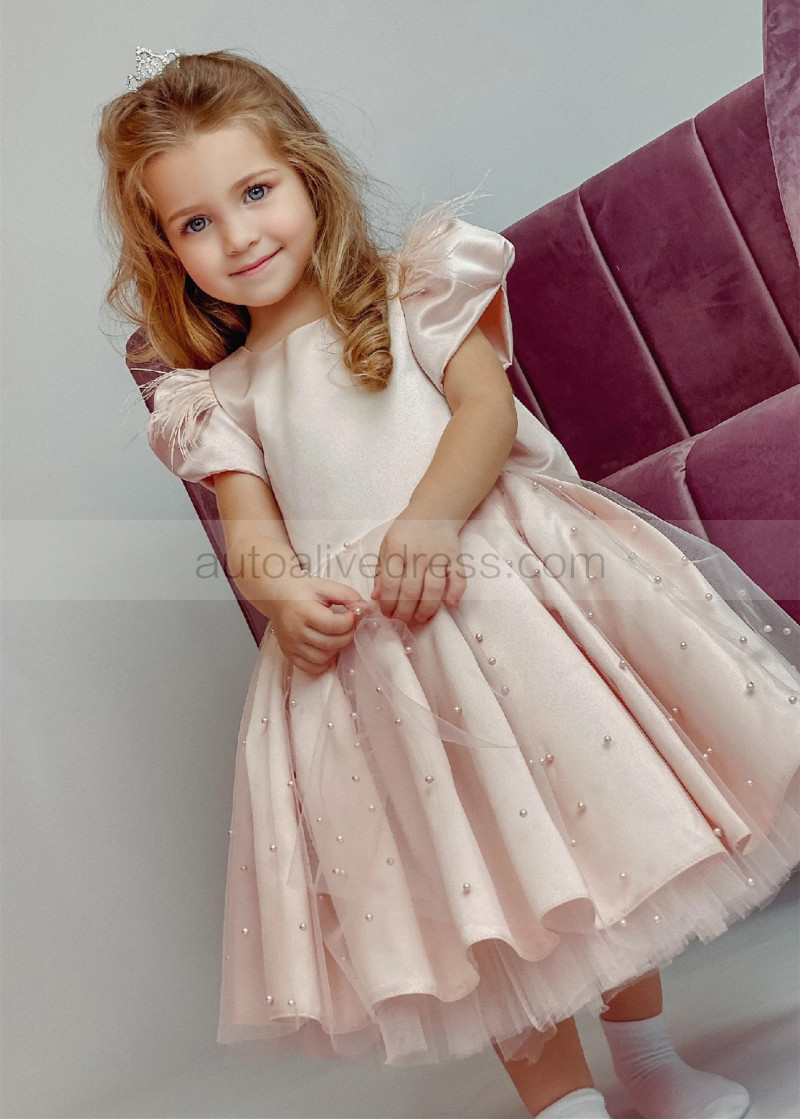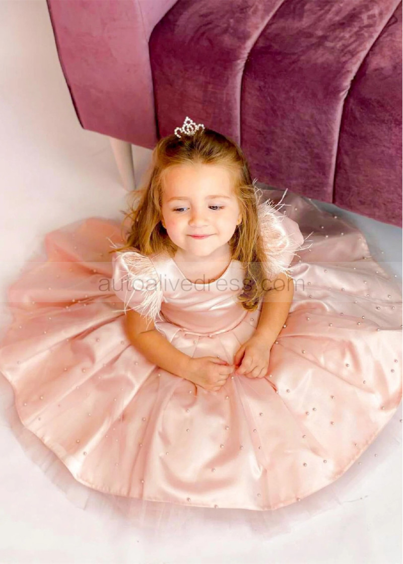 Blush Satin Feather Pearl Beaded Flower Girl Dress